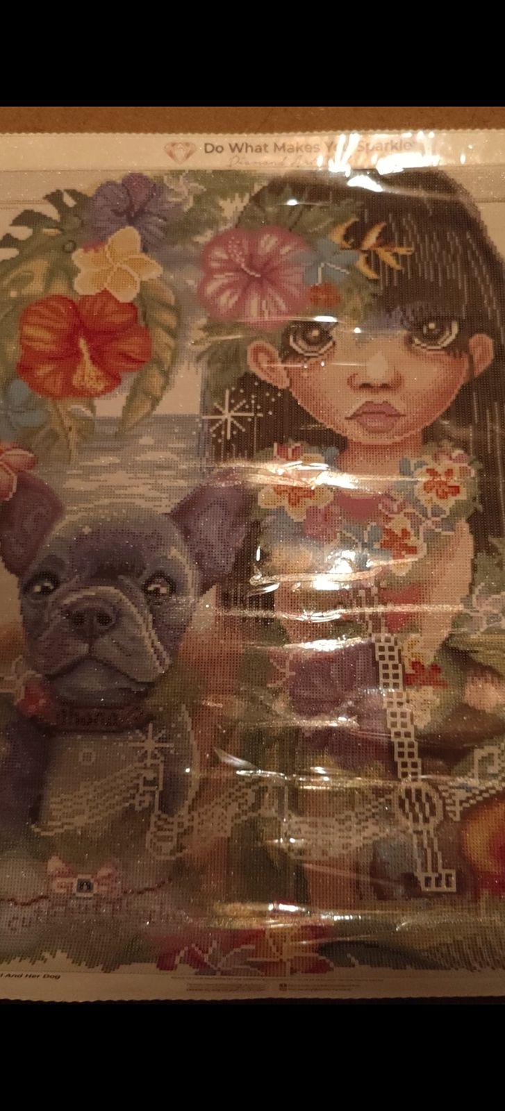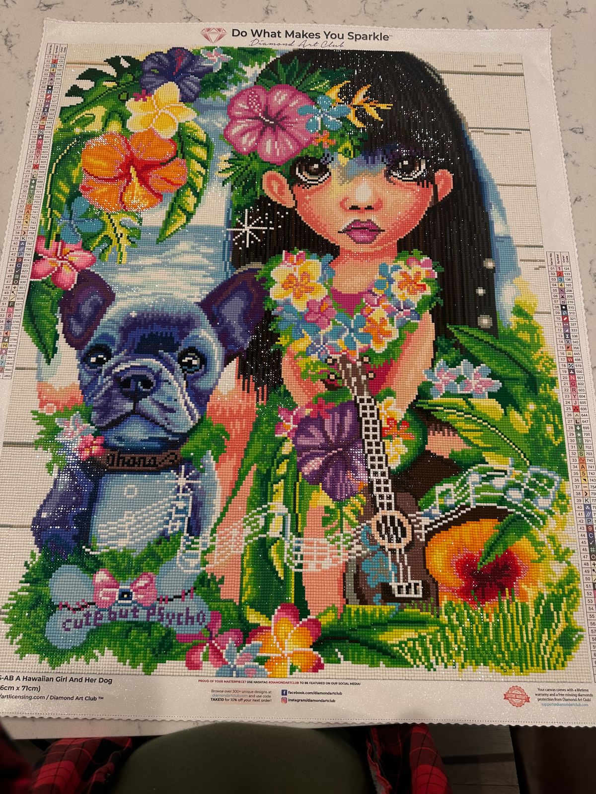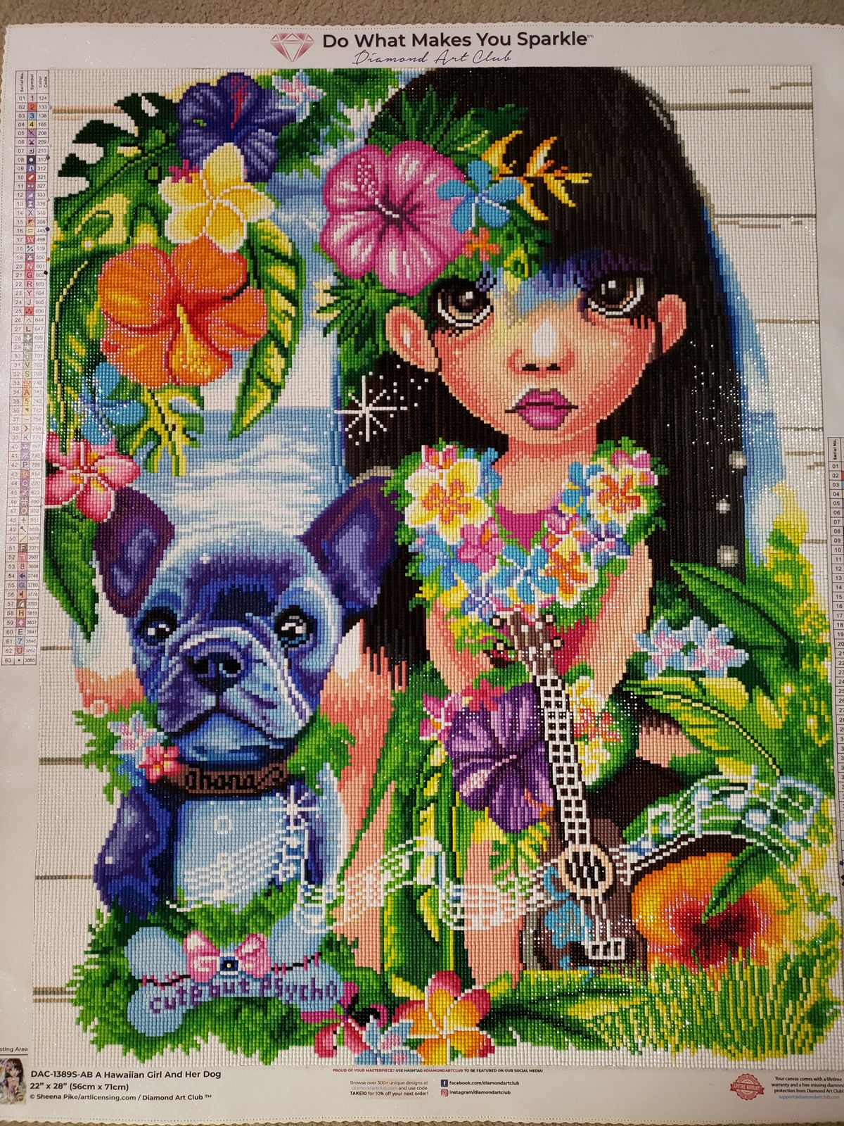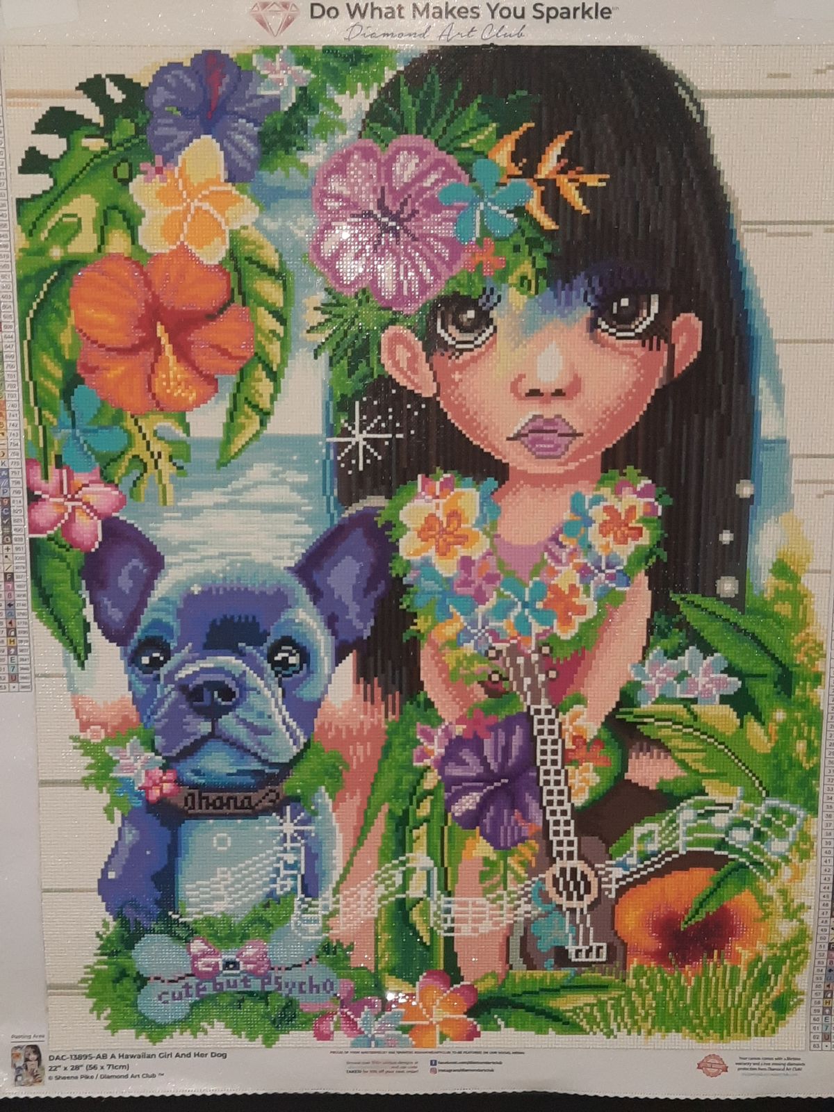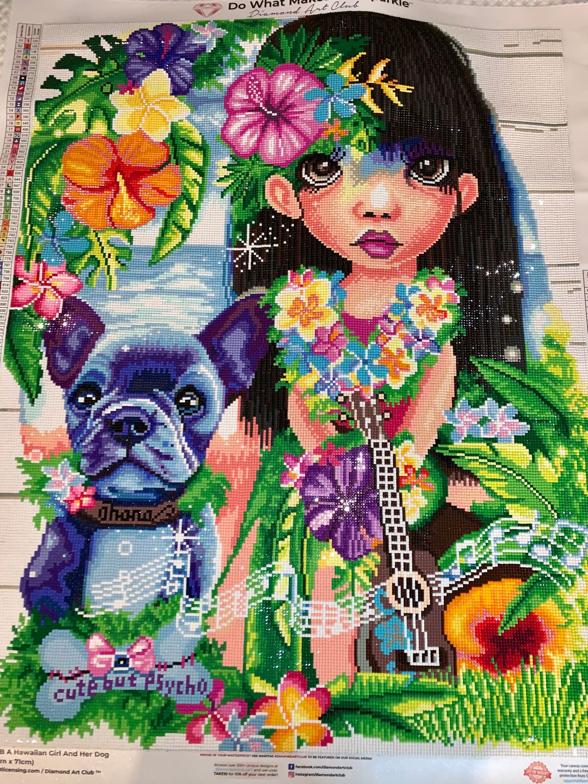 I got this because she reminds me of my little cousin who is a professional hula dancer, plays the Uke and has a French Bull Dog! I had allot of fun working with such beautiful colors, love everything about this painting!