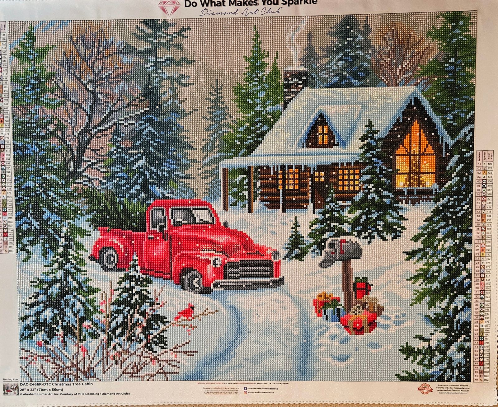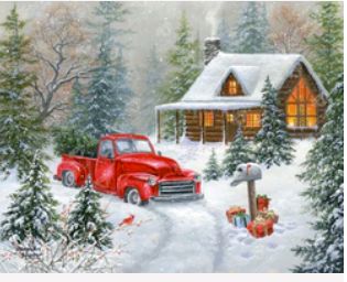 I enjoyed every moment working on this painting. I loved watching it come to life. The trees, cabin and red antique truck are so perfect you just want to be there. Makes for a wonderful Christmas picture to hang in your home.