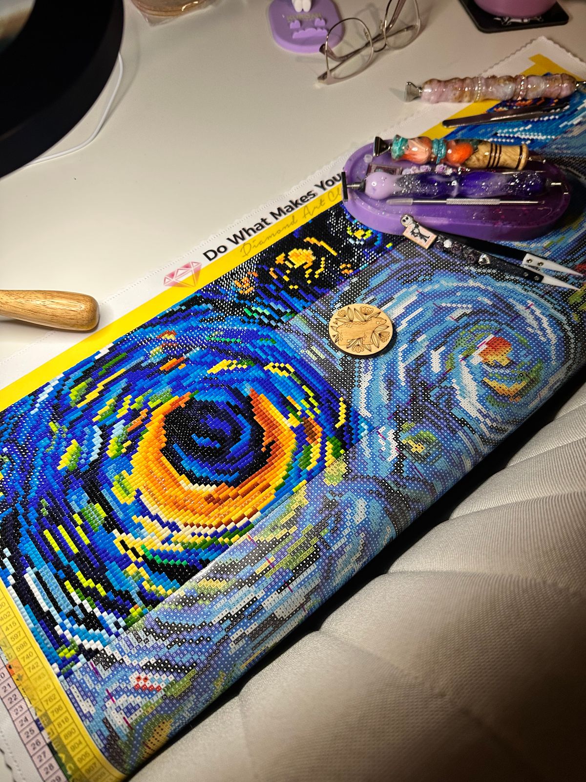 This was my first DAC painting and I could immediately tell the quality was more than I’ve ever seen before. Once I figured out how to use the perforated covers, I was set. The drills were great and the ABs uniformly sparkly. About 2 weeks to complete doing 1-3 sections a day. Highly recommend