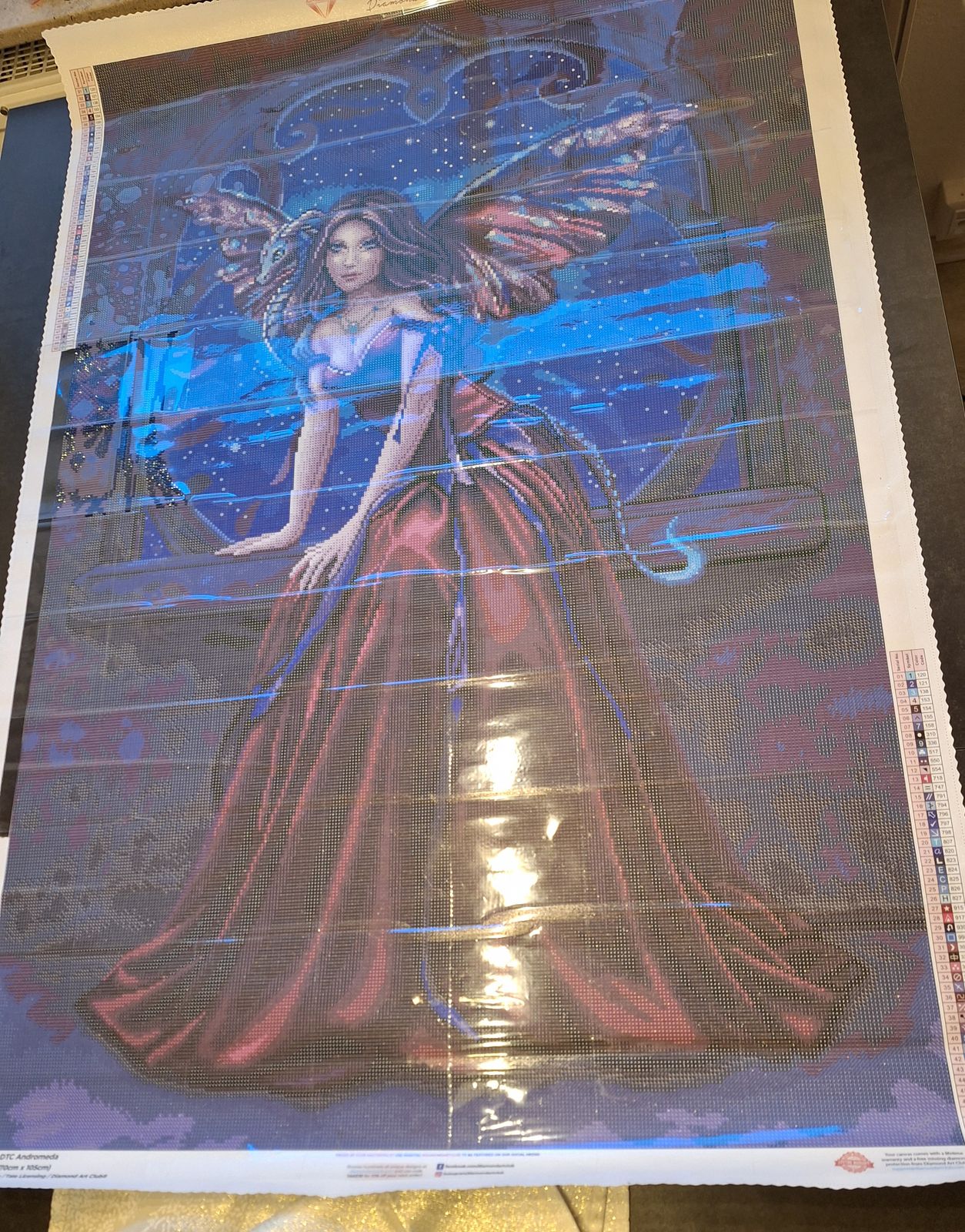 This kit is gorgeous, so many shades of blue and purples/burgundy, she is a joy, not dark at all even though it looks it, drills are perfect, drill field is spot on and the glue is sticky enough to hold all drills in place. 100% happy