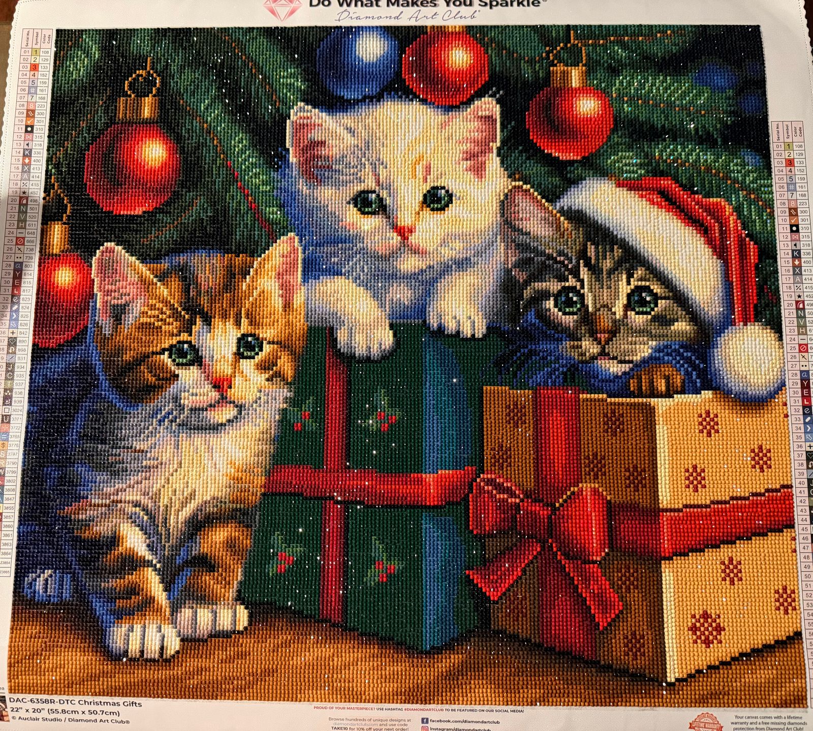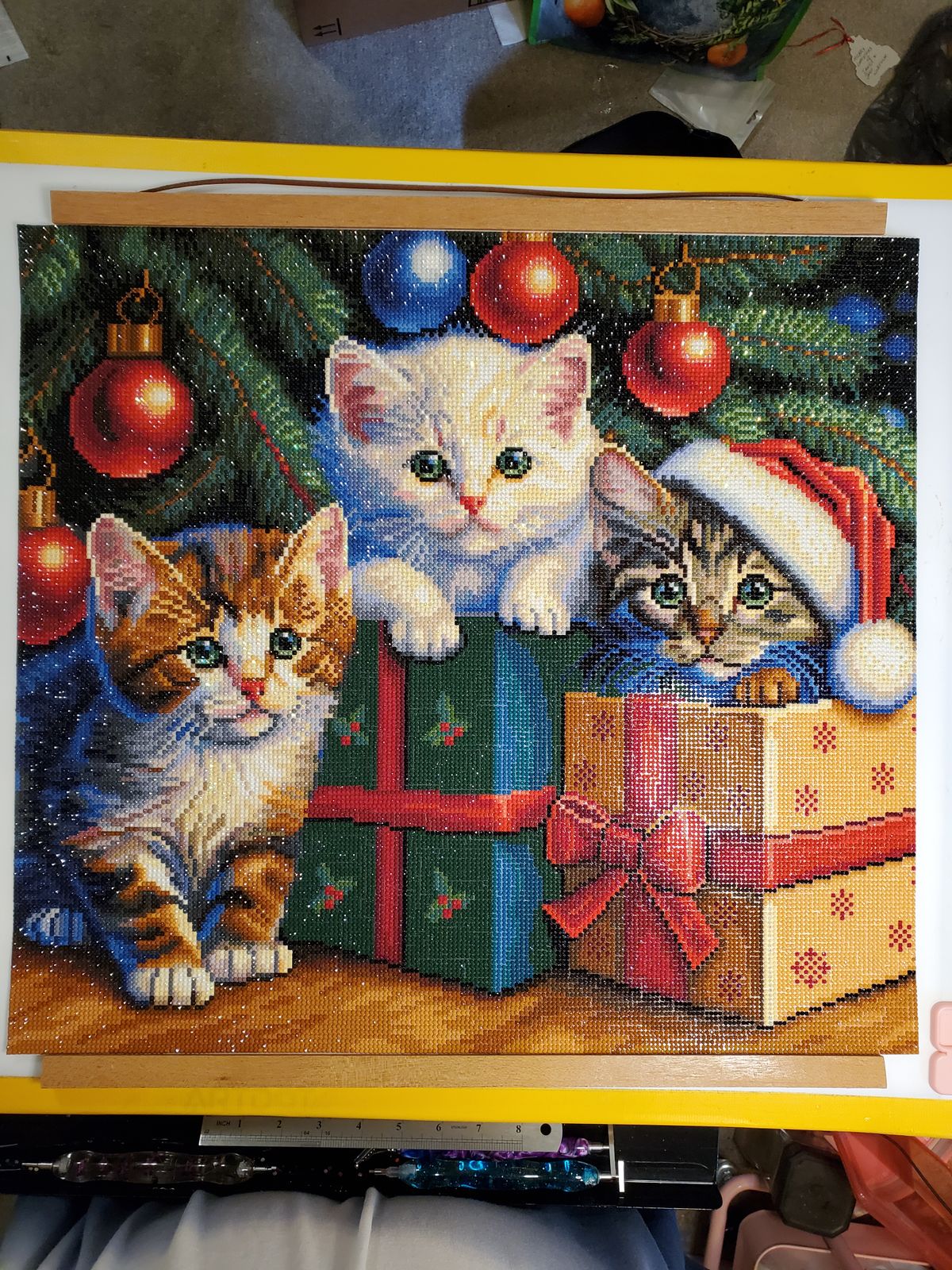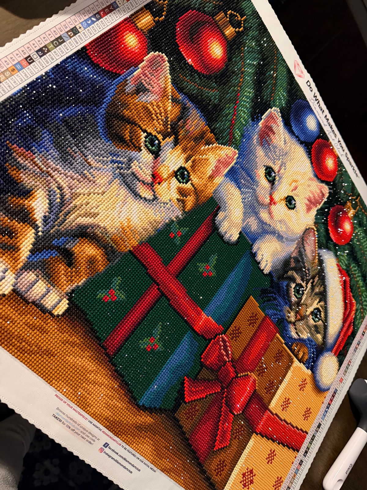 The little kitten's faces and fur, shiny ornaments and presents were so fun to diamond paint. The Christmas tree limbs just come to life. Framing to put up next Christmas!
