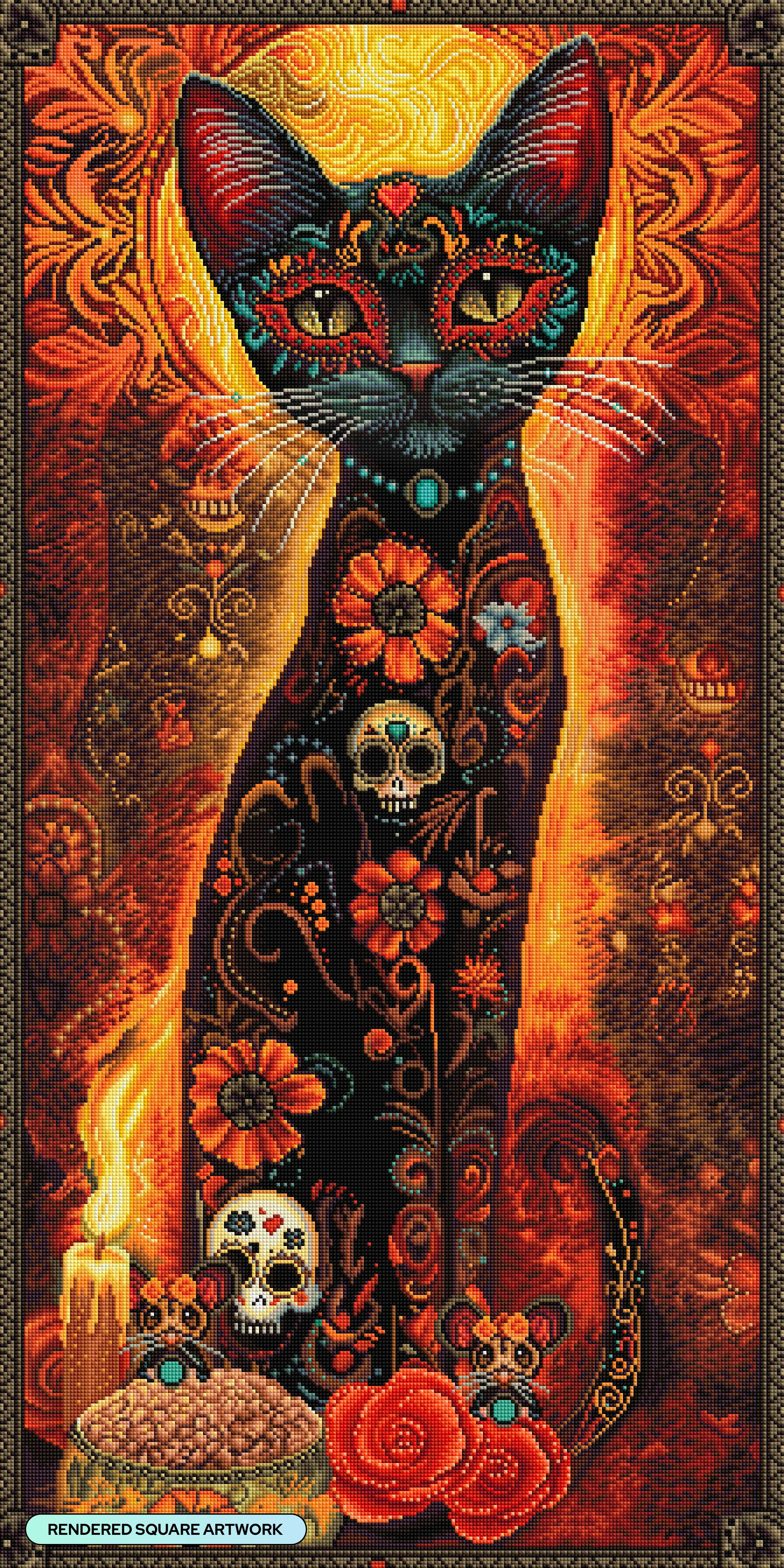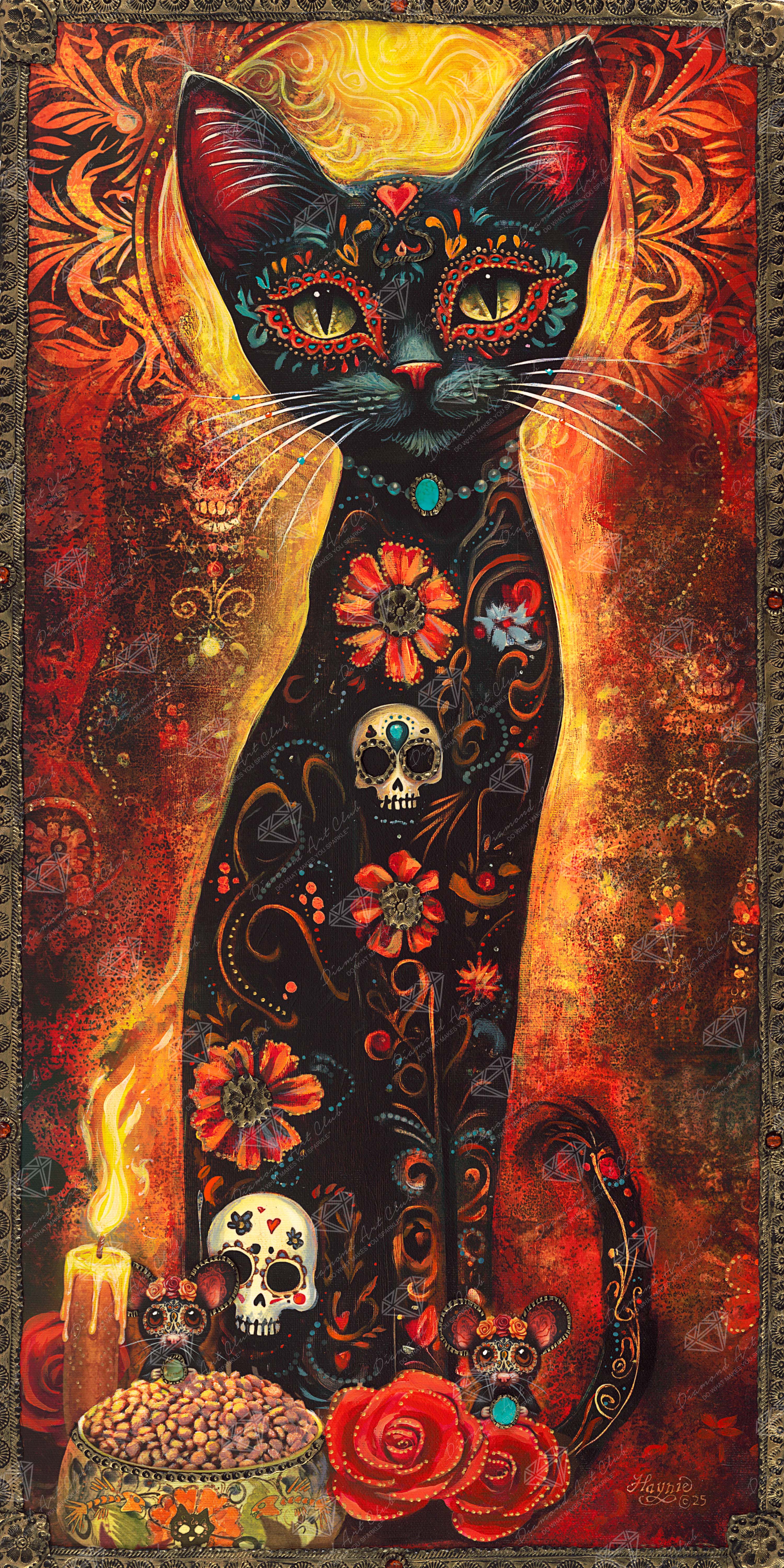 Sit in regal stillness as firelight crowns you in colors of mystery and bloom. With eyes glowing like embers guard the offerings of life and death as symbols dance across your fur.