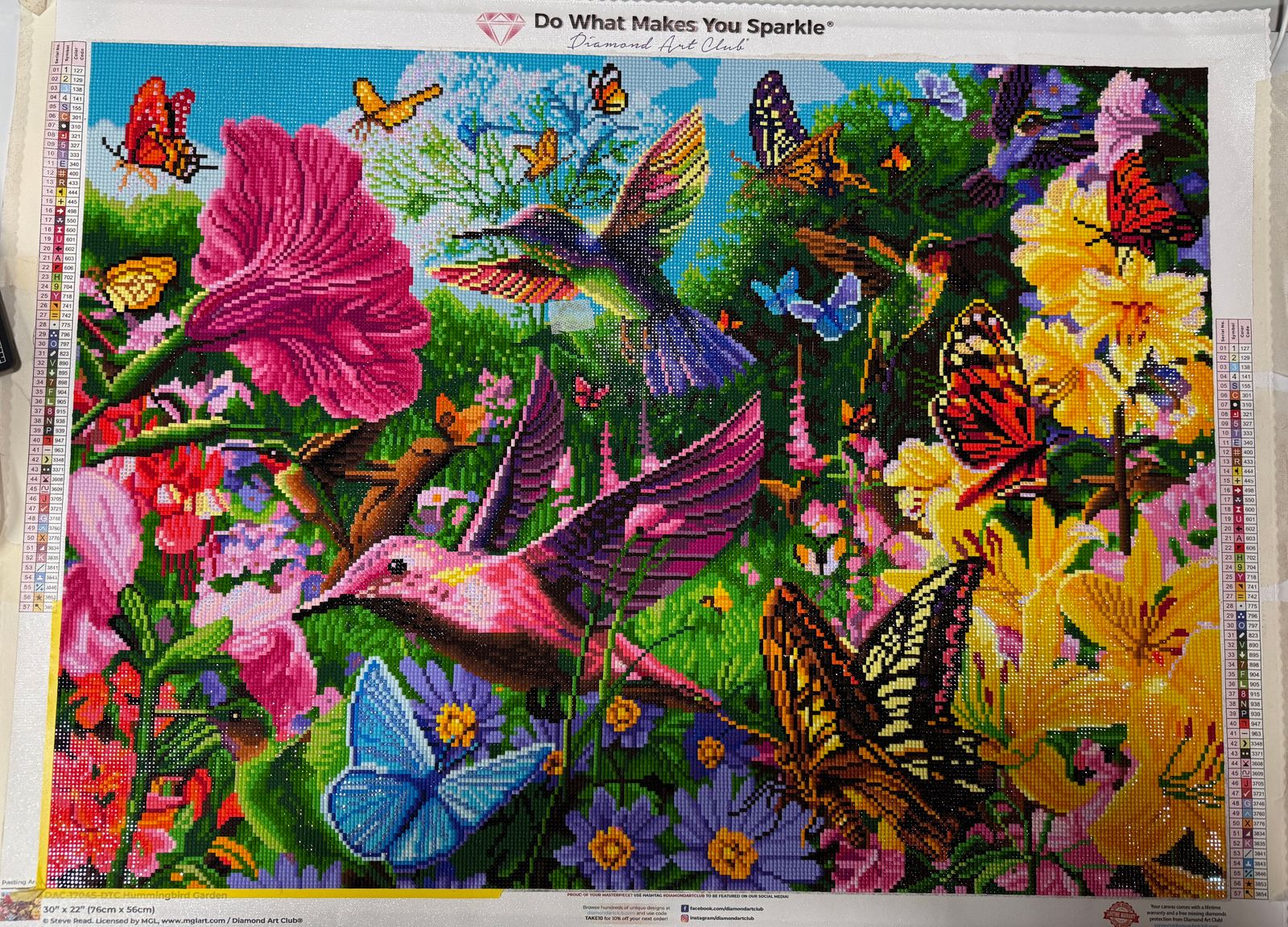 I love hummingbirds so this was perfect for me. Loved painting this because I would find more and more hummingbirds as I went. I love the colors.
