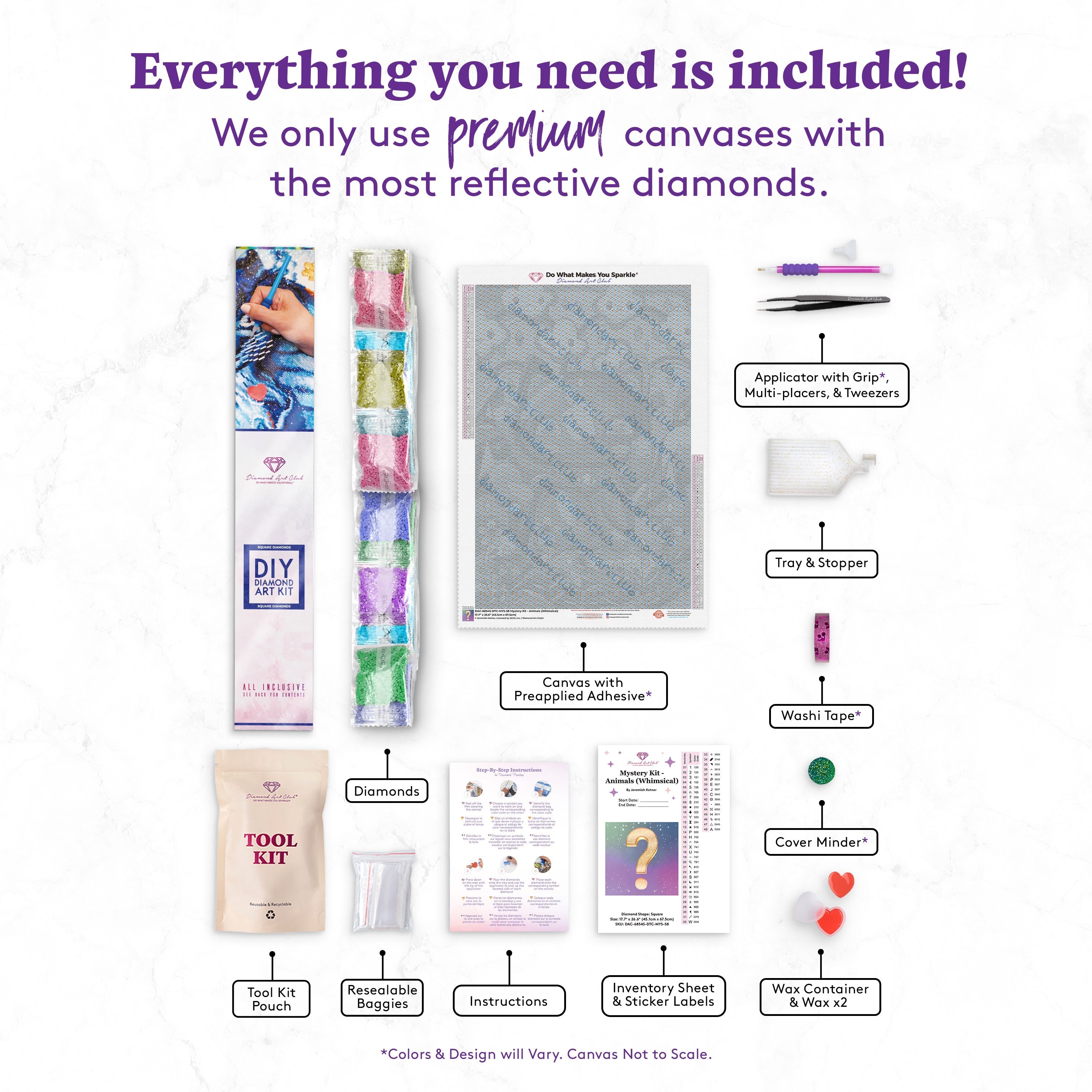 Canvas x 1, Diamonds, Tray x 1, Applicator + Grip x 1, Wax x 2, Tweezers x 1