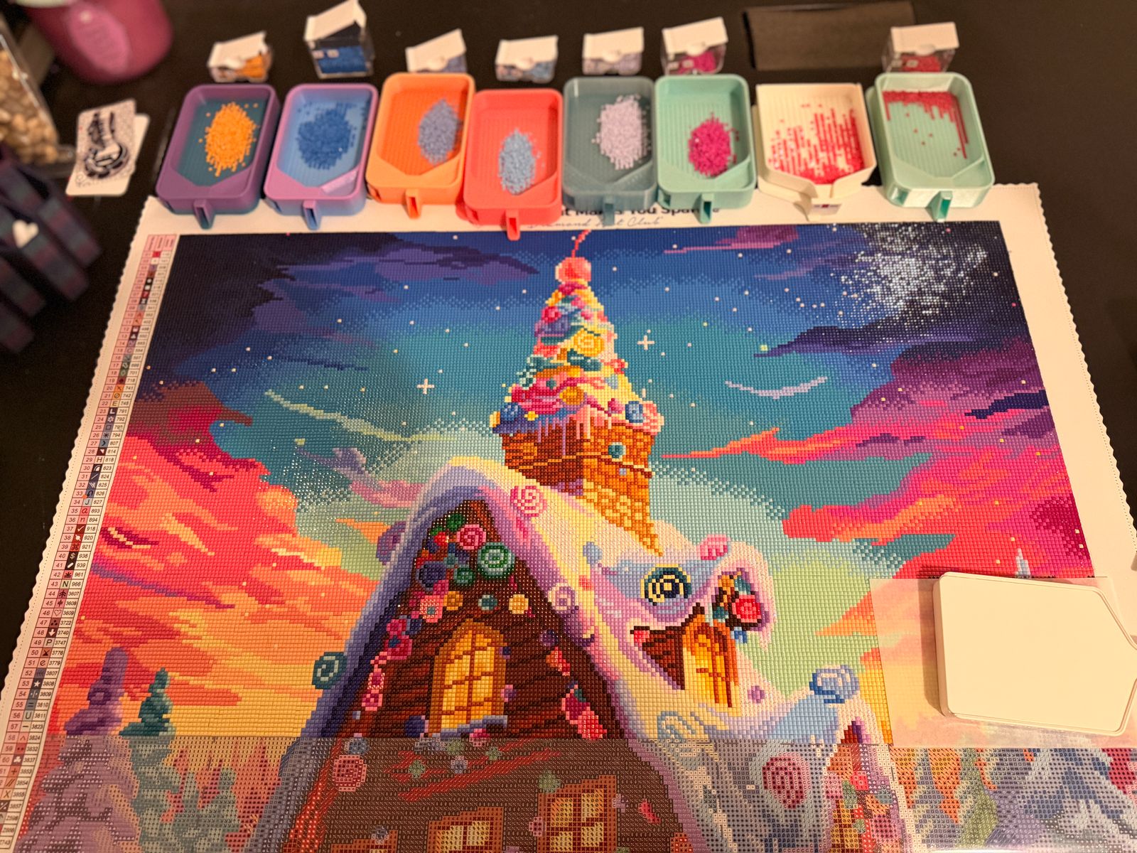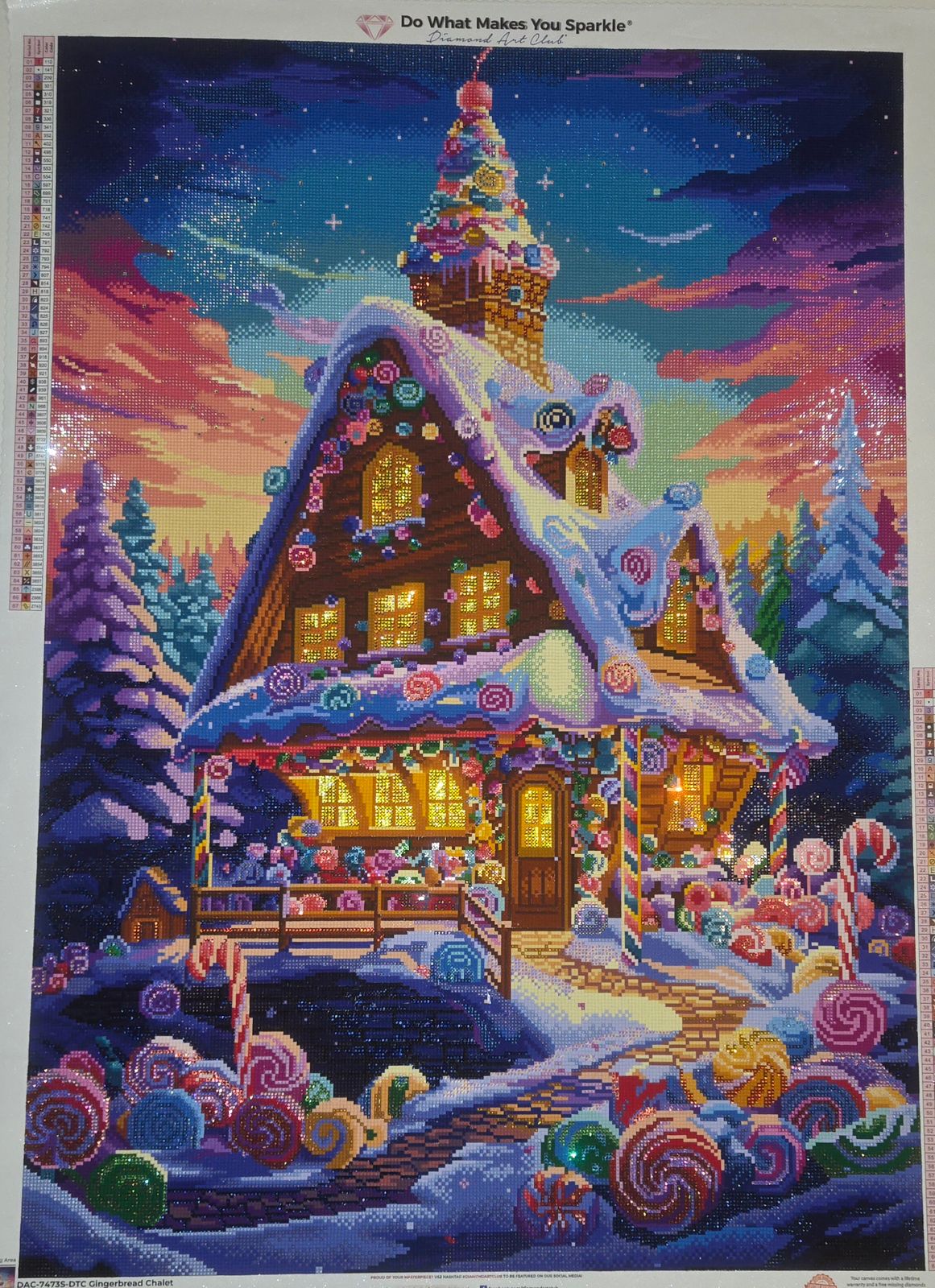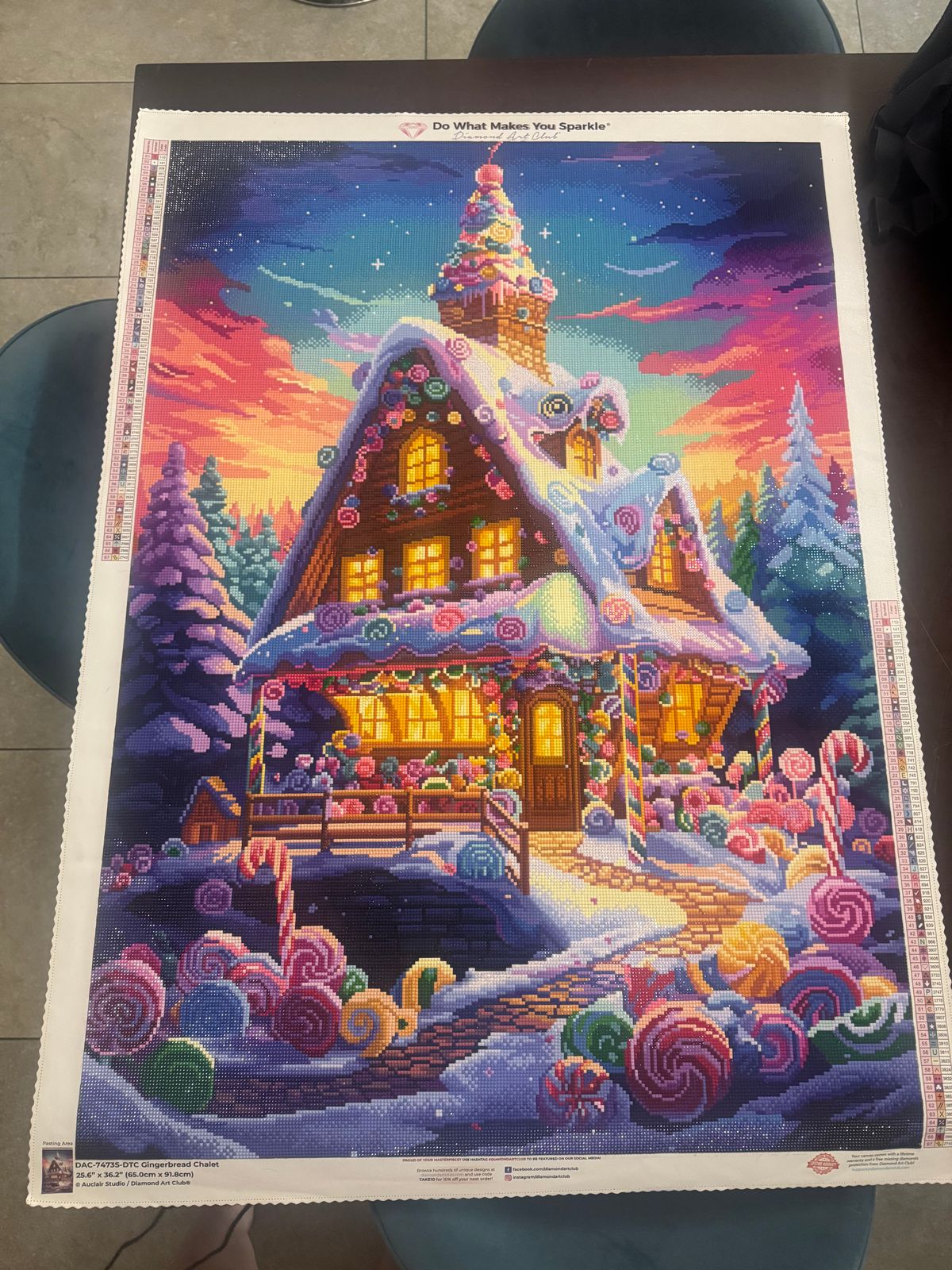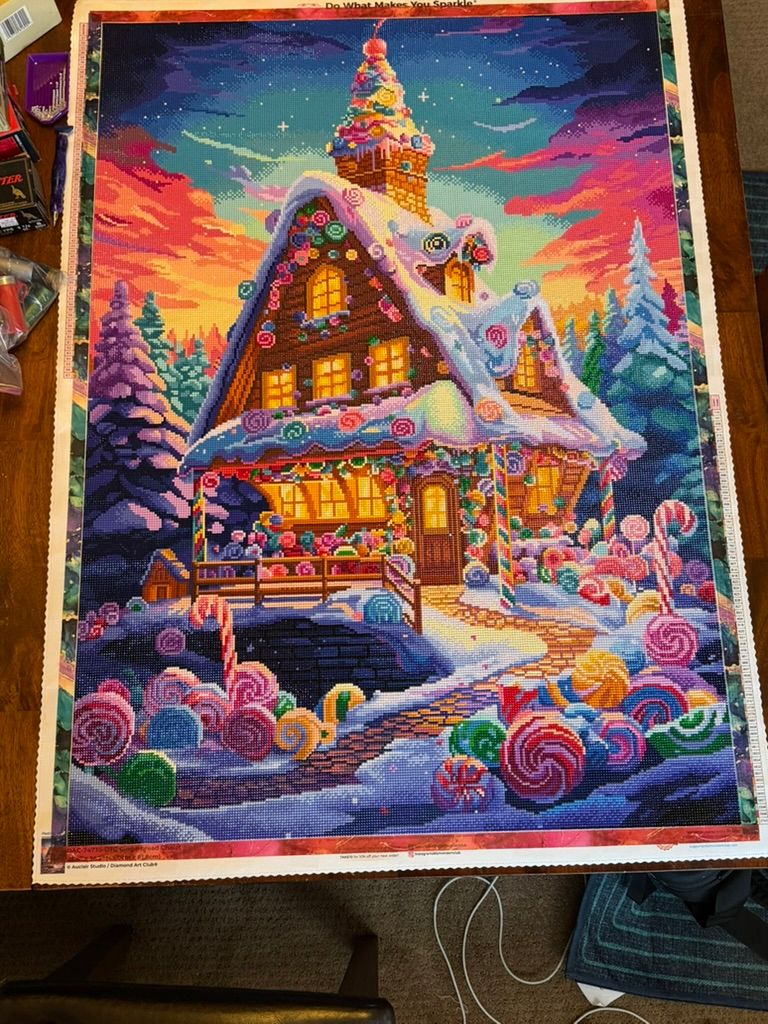 This was one of my favorite DAC canvases ever. I loved the bright colors and it offered me just enough color blocking without it being too boring. I am generally a confetti gal, and this one kind of had both confetti and the more color blocking areas in the sky. A perfect mix. Also the OCD part of me loved that there were enough straight lines in the cabin in the windows and stuff to work on getting my lines really straight. Quality was fabulous of course.