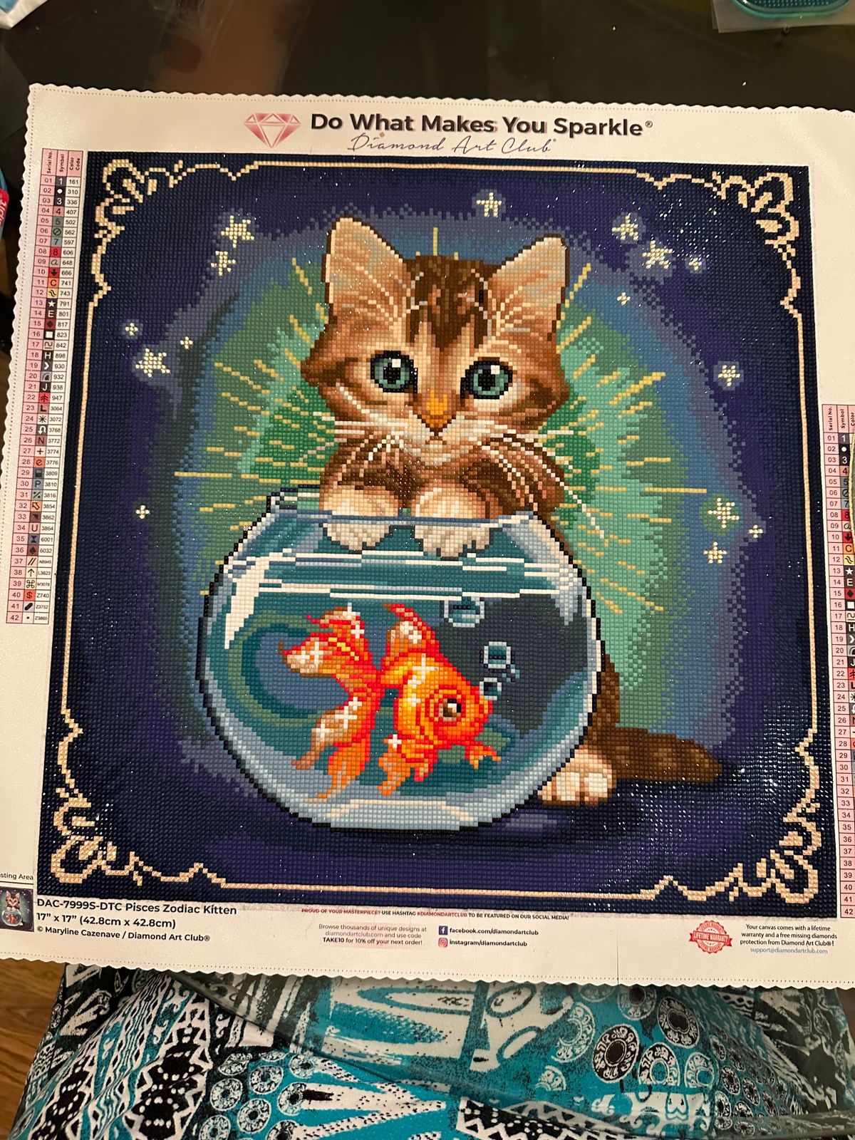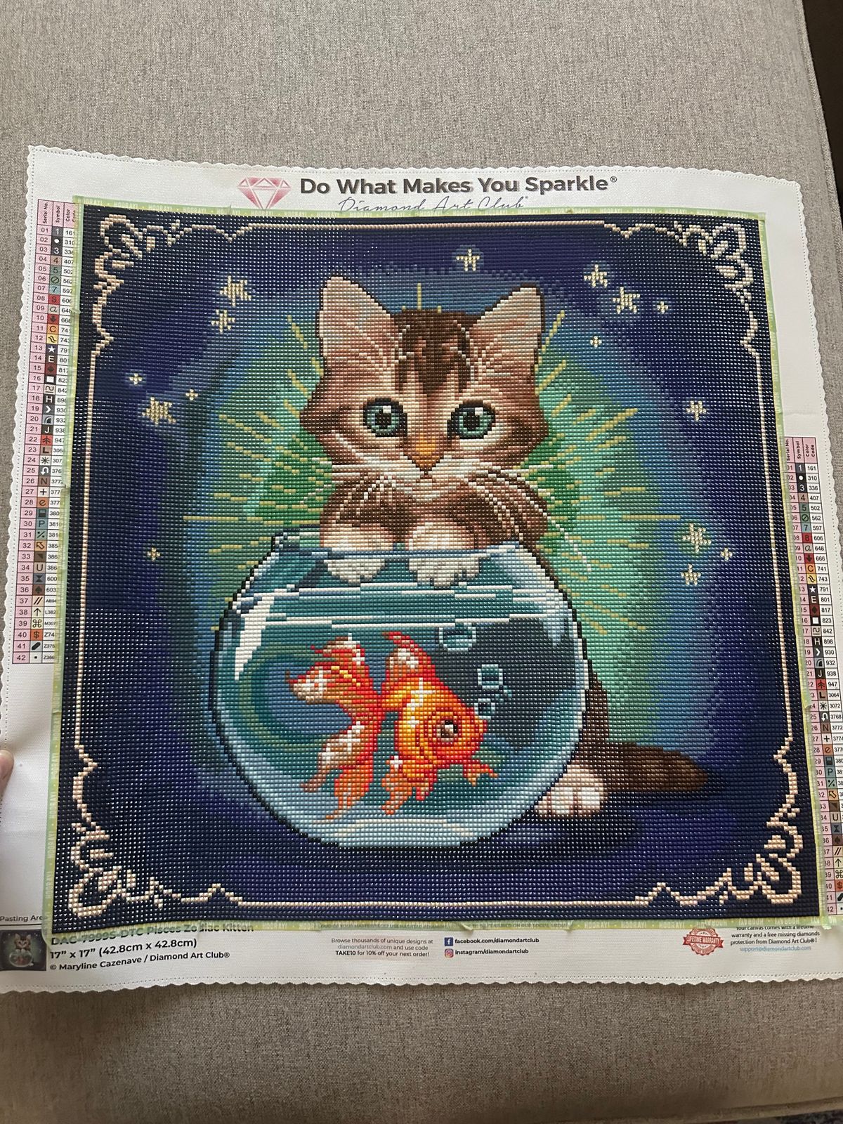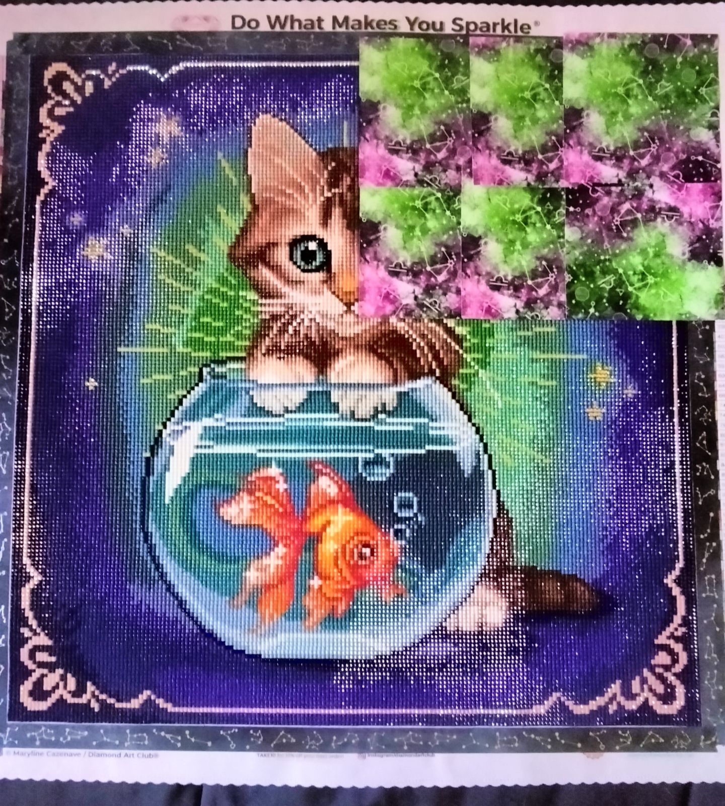 I love cats and when I saw this painting, I had to have it! I know there are other cat options but this one also has a gold fish lol. This is actually my first square drill painting with DAC and also my first time using frosted drills, let me just say I enjoyed both. The painting came out so beautifully and the sparkle is amazing!!