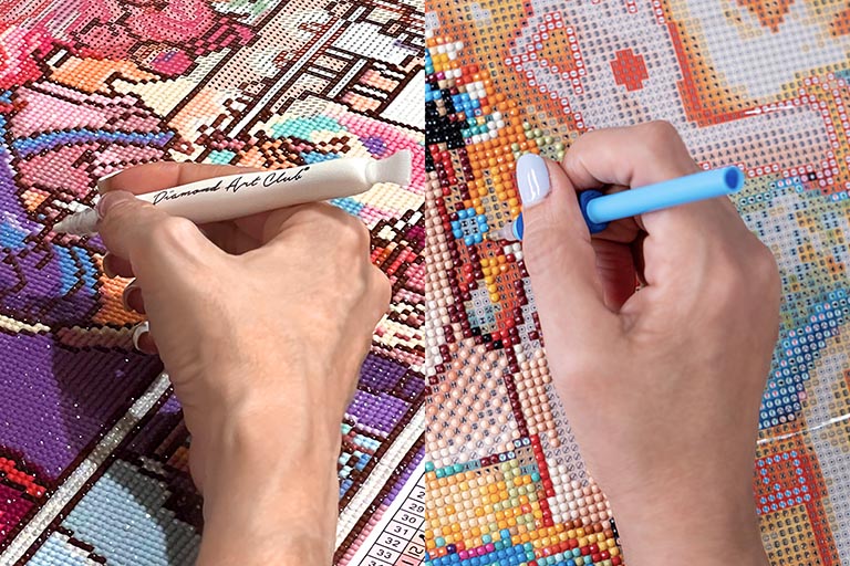 Your kit comes with a pre-filled, twistable diamond painting pen. The tip contains putty, which gently adheres to diamonds, allowing you to pick them up and place them on the canvas.