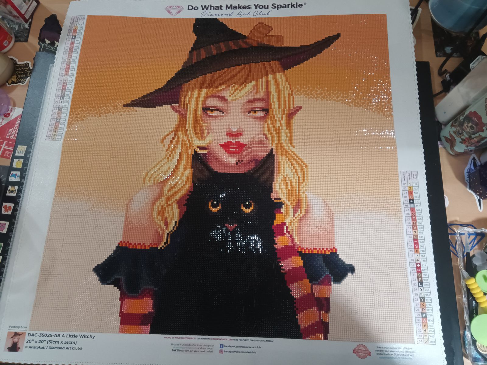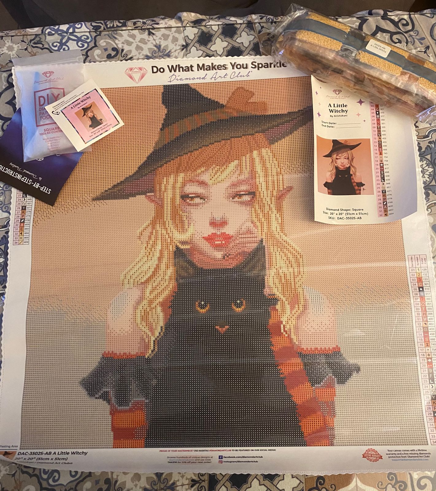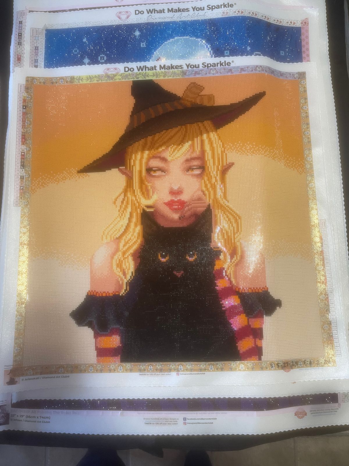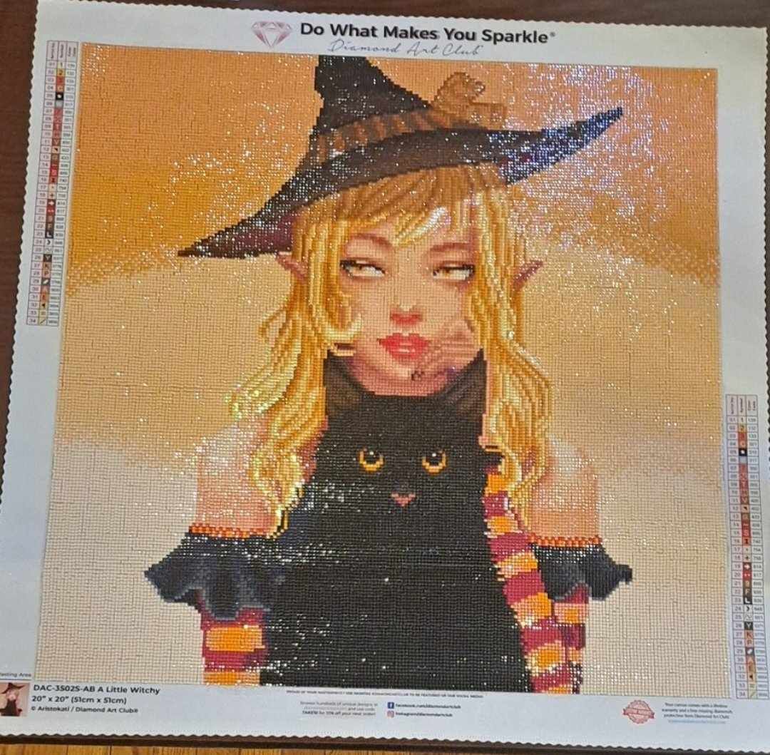 Completed this canvas for a Halloween event that was a lot of fun. We stretched working on this for the entire month of October. In reality it would only take me about 1 1/2 - 2 wks to complete. The background got a bit tedious with all the colorblocking but other then that working on her was fun. I used enhancment drills including glitter, crystals, extra ABs, n even glow in the dark drills to make the final product my own. I turned her eye color from a hazel to blue. I also changed the muted brown tones of the cats ears into a nice pinkish color n made the cats eyes green.