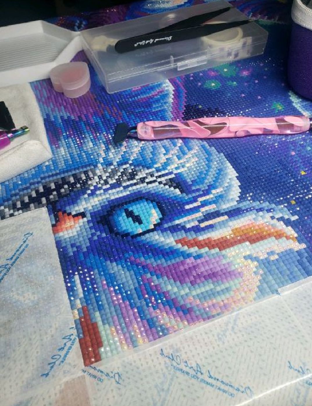 This diamond painting was so fun to complete! It was a bit challenging, but the end result was wonderful! The colors were gorgeous too! Highly recommend doing this diamond painting! Picture was taken in the middle of completing it… you can see how beautiful the colors are!