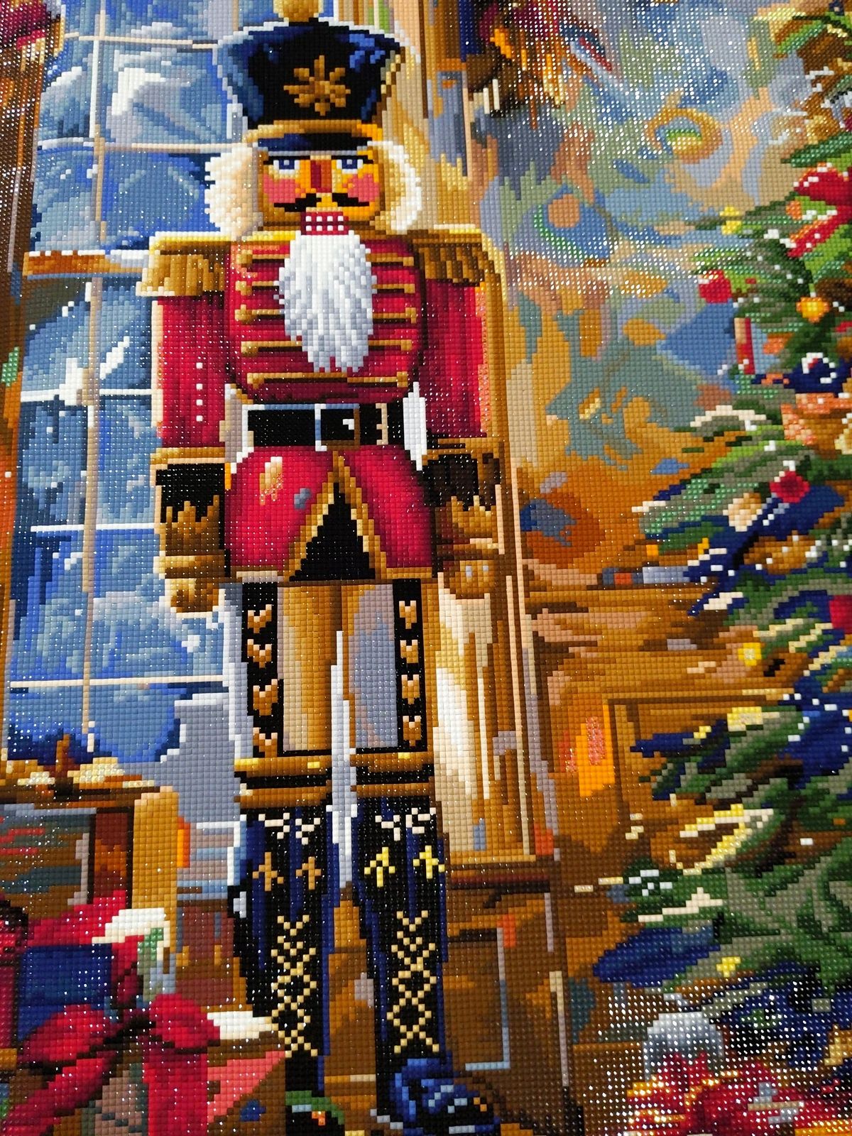 Step into a charming holiday scene with a stately nutcracker standing guard by a beautifully decorated Christmas tree. The warmth of twinkling lights and wrapped presents fills the entire room with festive cheer.