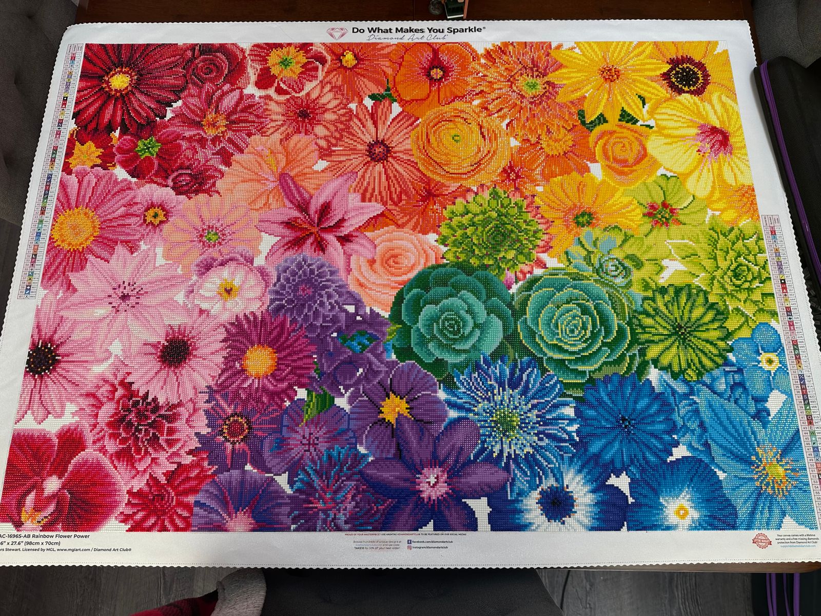 I absolutely loved working on the Rainbow Flower Power kit from Diamond Art Club! The colors are insanely vibrant and the rainbow effect really pops once it starts coming together. The canvas is high quality, super clear symbols, and lays flat right out of the box. The diamonds are consistent in size and sparkle beautifully—no frustration at all while placing them.