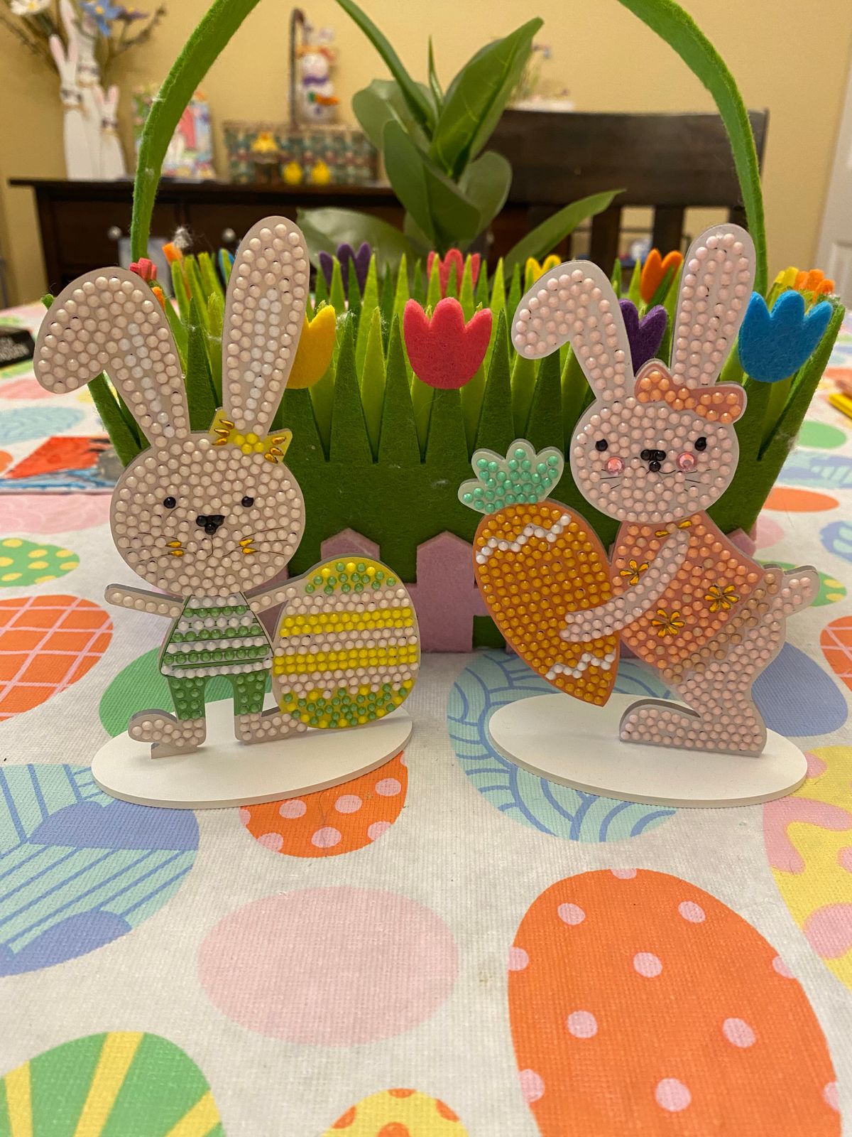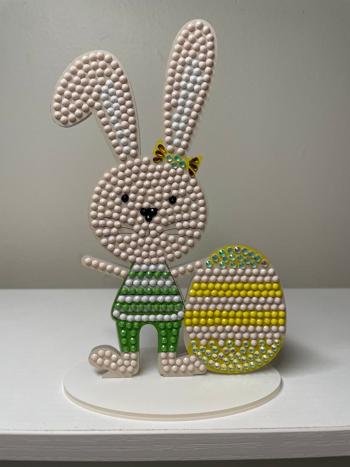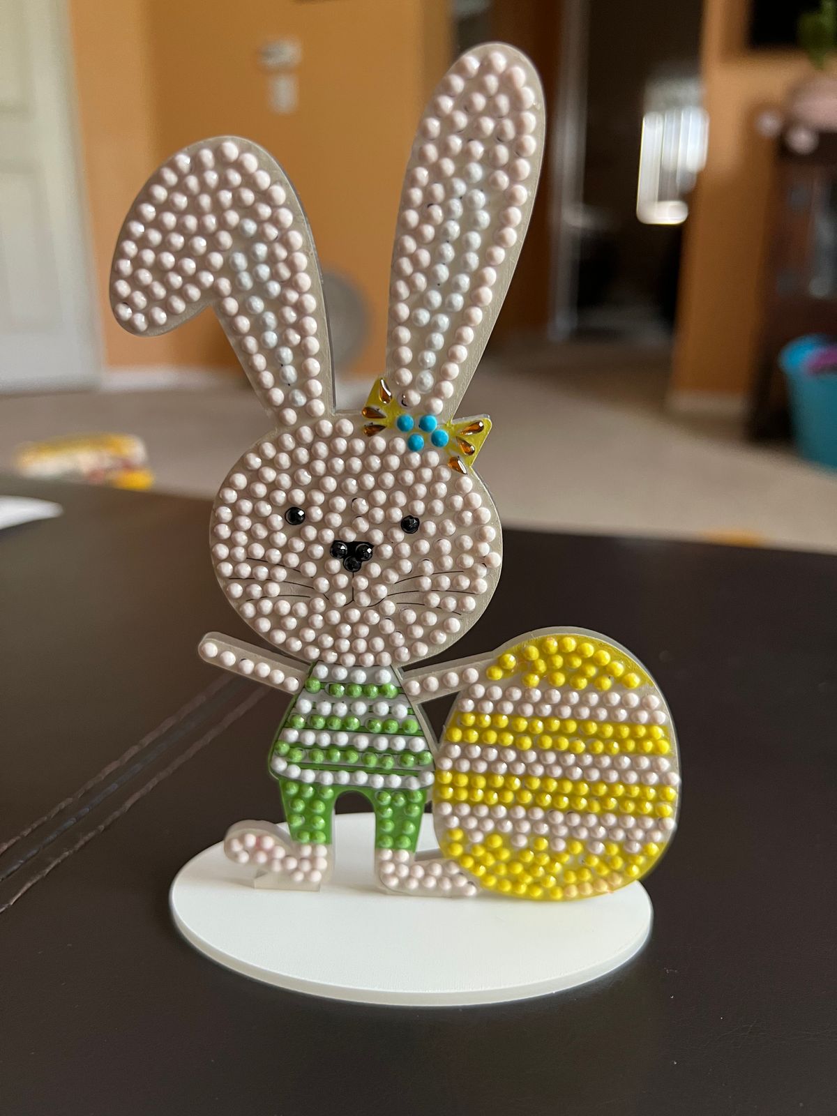 I purchased this bunny as a project to do with my granddaughter. It is an adorable bunny and an easy quick project. The only issue I had is that there were not enough of the yellow drills. I pulled some from extra drills that I had. My granddaughter and I enjoyed doing this together very much.
