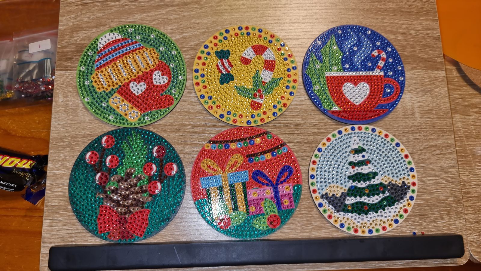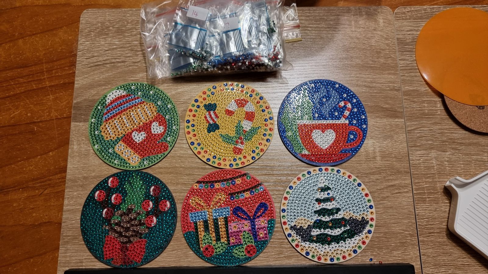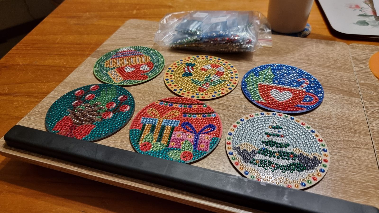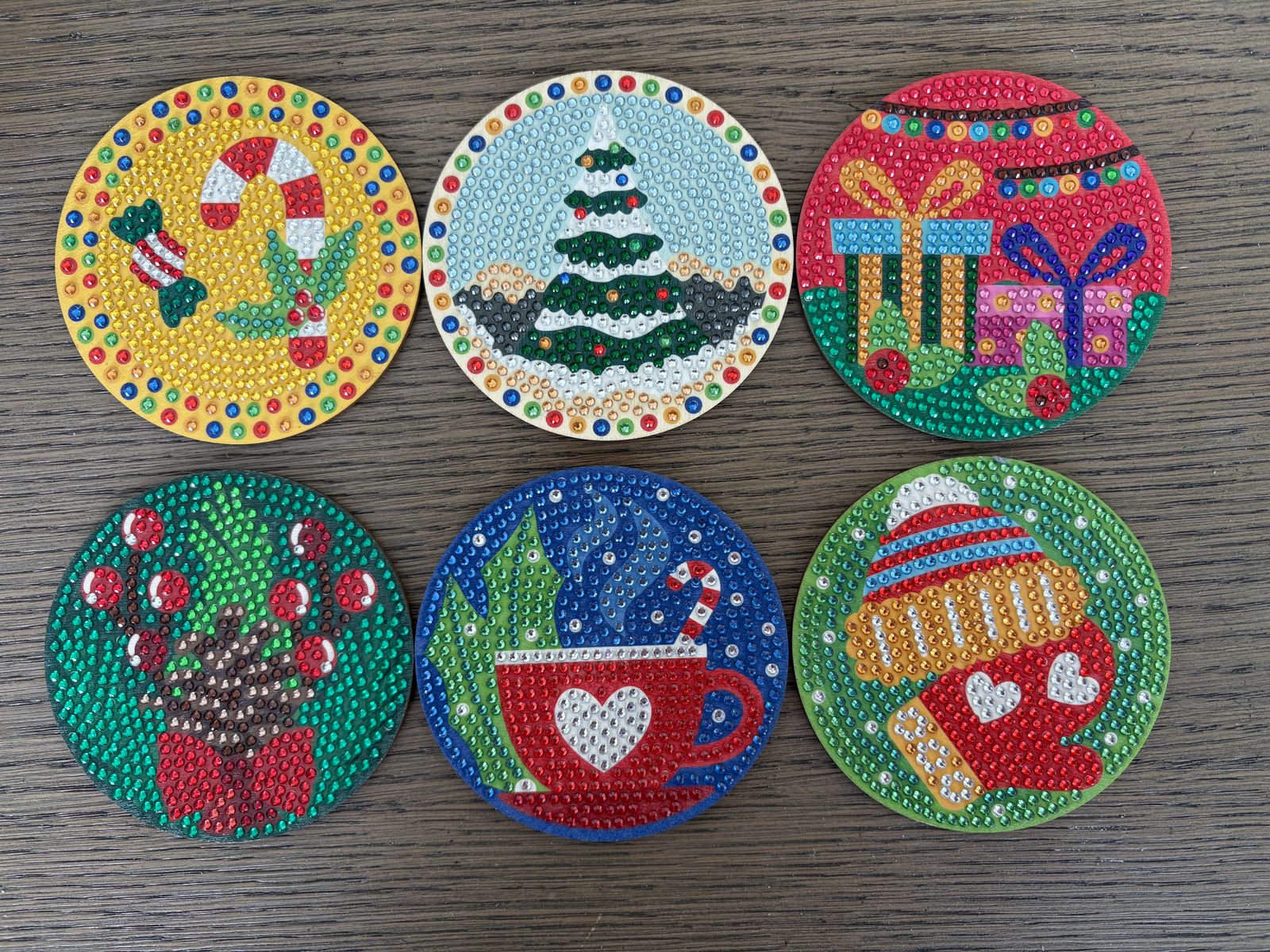 These Christmas coasters look great. I bought a few sets so I can give them as gifts. They look like ornaments. There is a lot of space that isn’t covered with crystals but is colored so that it all blends well. Fun project.