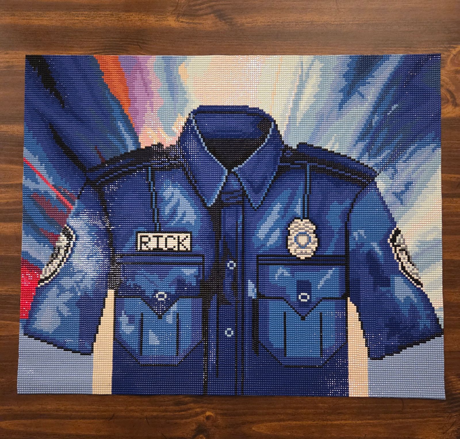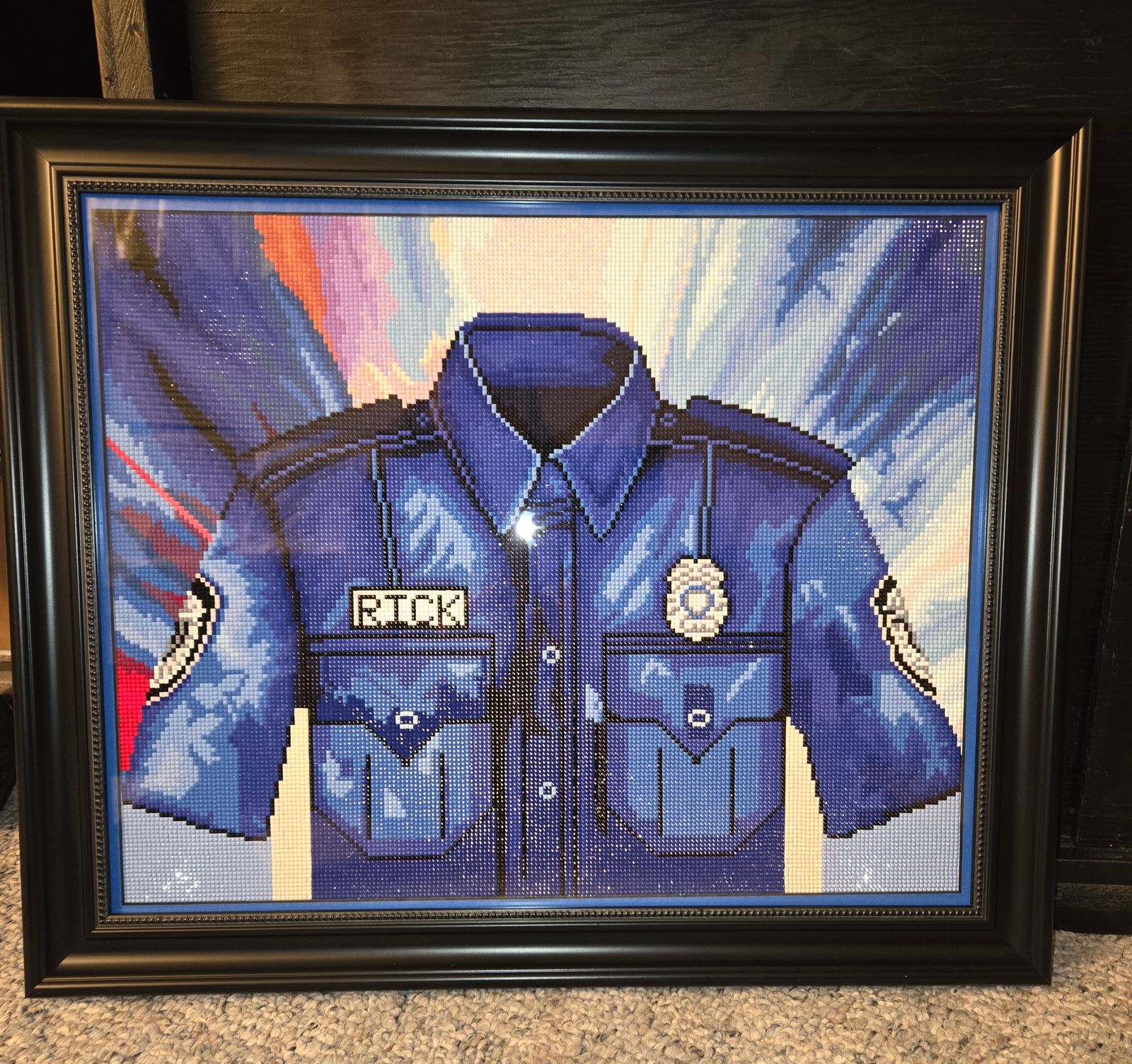 I love everything about DAC kits! Their drills, glue, plastic cover, ect... makes working on their kits a complete joy! This one was no exception, except the artwork on this canvas gave me "memorial vibes" and I am gifting this to someone who is still living! So, I got rid of the flowers, and just made a blue policeman shirt. It was a challenge since I had to chart out alot myself, but I like the end results! If you have a square kit and want to alter it by alot, it can be done! I also cut it so it would fit in a 16x20 frame.