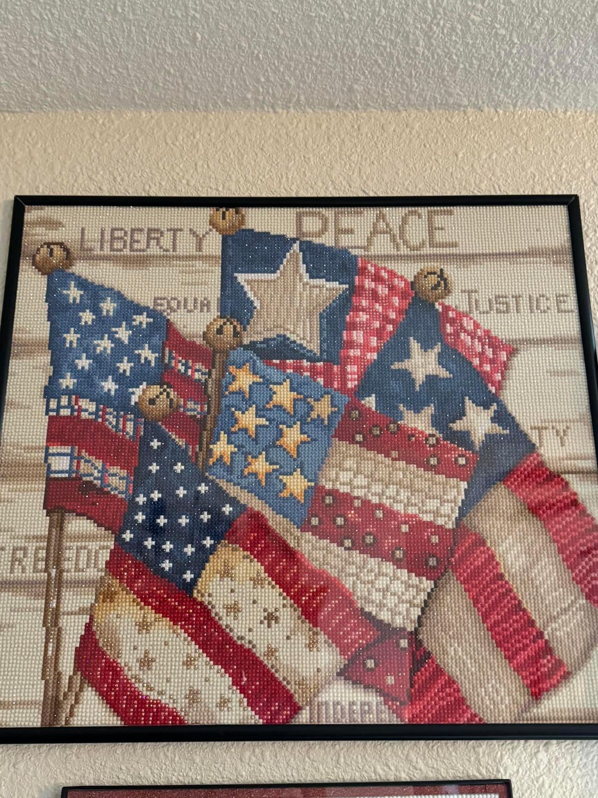 Show off your colors in a home-spun style. Backed by words that speak to the heart, the cherry-pie reds, denim blues, and shining white stars show comfort and strength.