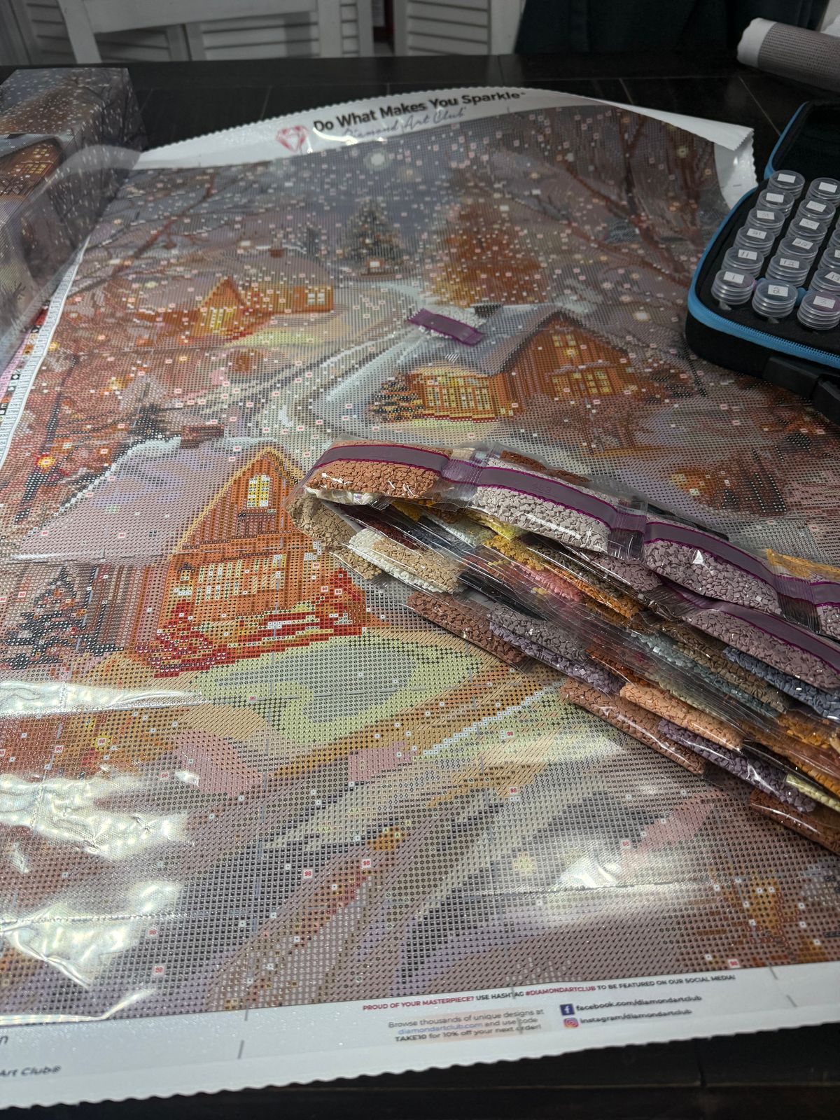 Just started this beautiful canvas today and it has 76 colors! I truly want expecting that until I had to get out my extra storage container to hold all the different drills. It’s coming out beautifully and the special larger drill is a super fun and different dynamic to diamond painting!