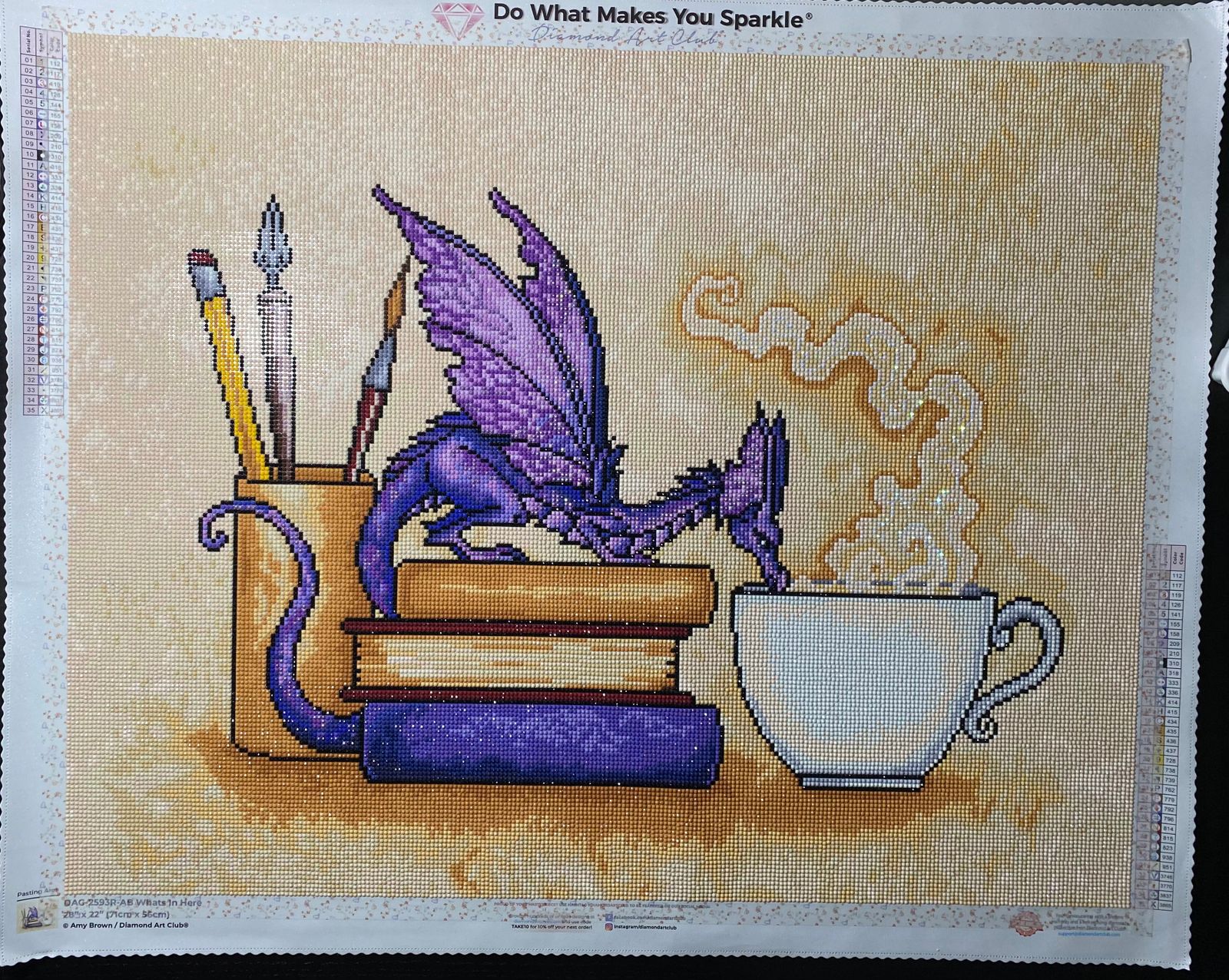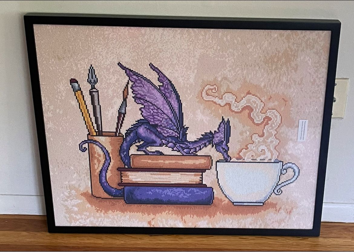 Loved every aspect of "what's in here"! I ran short on one color and DAC mailed it to me right away, no questions asked! I framed it myself using a 28X20 frame and it looks great, I think (lol). Our school's mascot is a DRAGON so it works on that level. We have faculty TEA every Thursday, so it works on that level and our Librarian loves teas and BOOKS. How could I go wrong? I think she will love it!