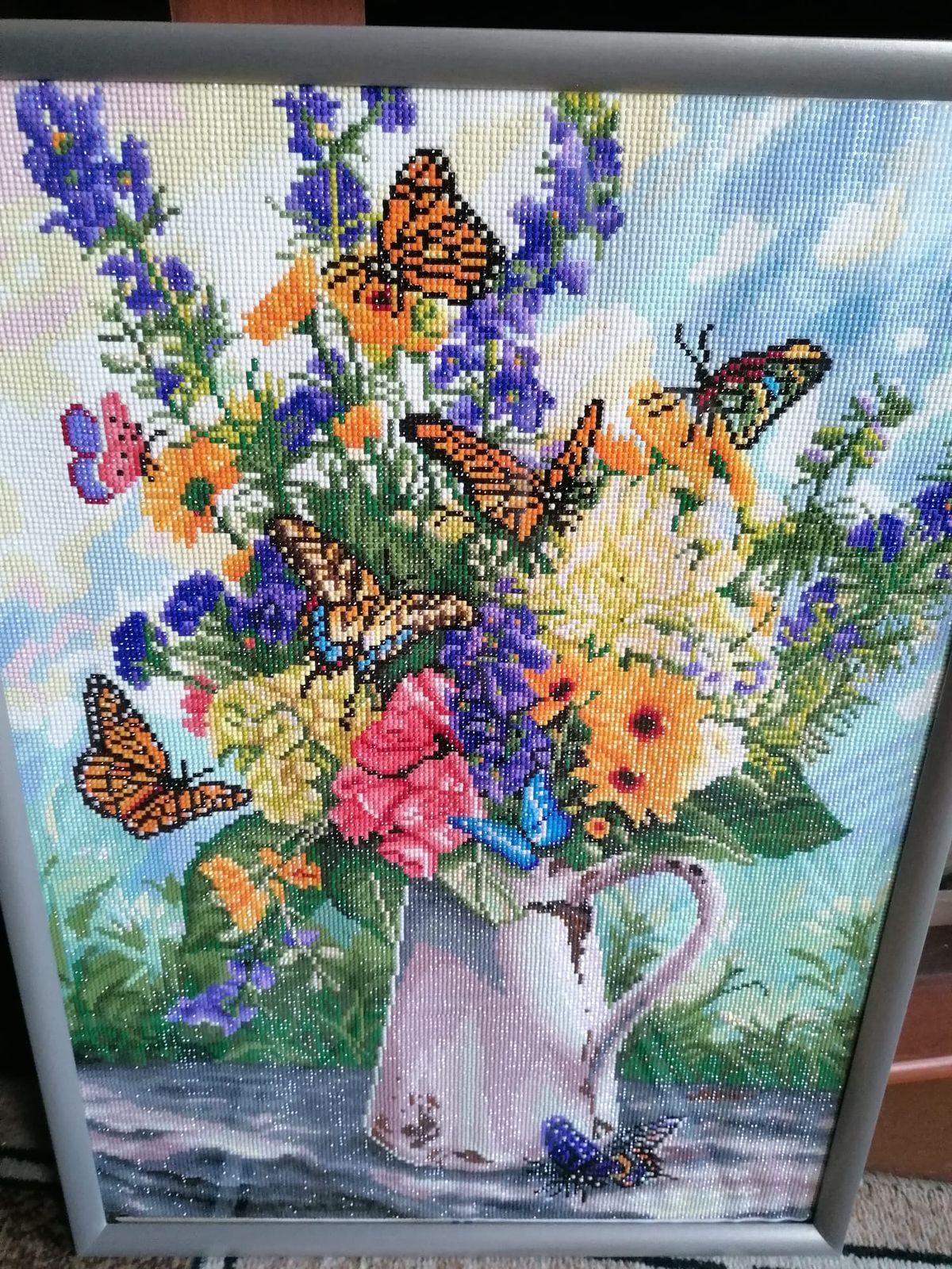 I made this one for my mom and I know she will love it. She has a huge garden and her favorite thing is butterflies. I painted the boarder brown to make it look like a frame and used wood and wire to hang it on the wall