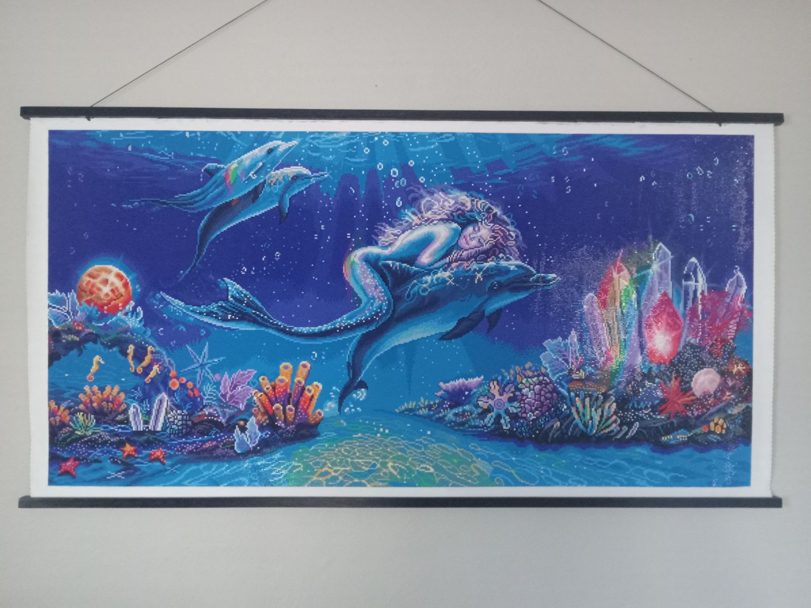 Finished art draws my eye from anywhere in the room. The special drills make it look like real underwater lighting and reflections off the sea creatures. Slightly more color-blocking than confetti, so it works up quickly for its size. It's a little over 4 feet long, so it will be a statement piece in any room you place it in! Definitely recommended for people who love ocean life.