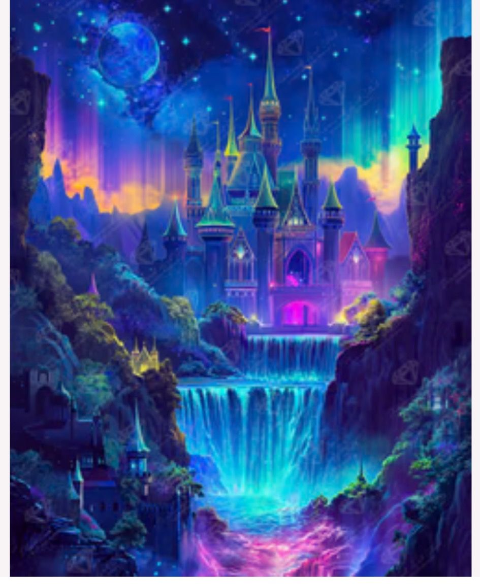 I'm not finished, this will take awhile! The colors are breath-taking. I may add some extra bling, though it really doesn't need it. It would be cool to add some glow-in-the-dark drills although the waterfall glows already.