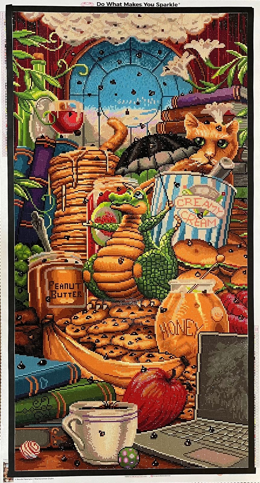 I really enjoyed working on this although I was really disappointed with the color choices that were made for the dp. The dragling's belly, cookies, honey, buns, pancakes, peanut butter, cat and even the bananas were all the same colors. Iloved the rest of the painting and I am a true Randal Spangler fan but I have to be honest. It was fun to do and it is beautiful.