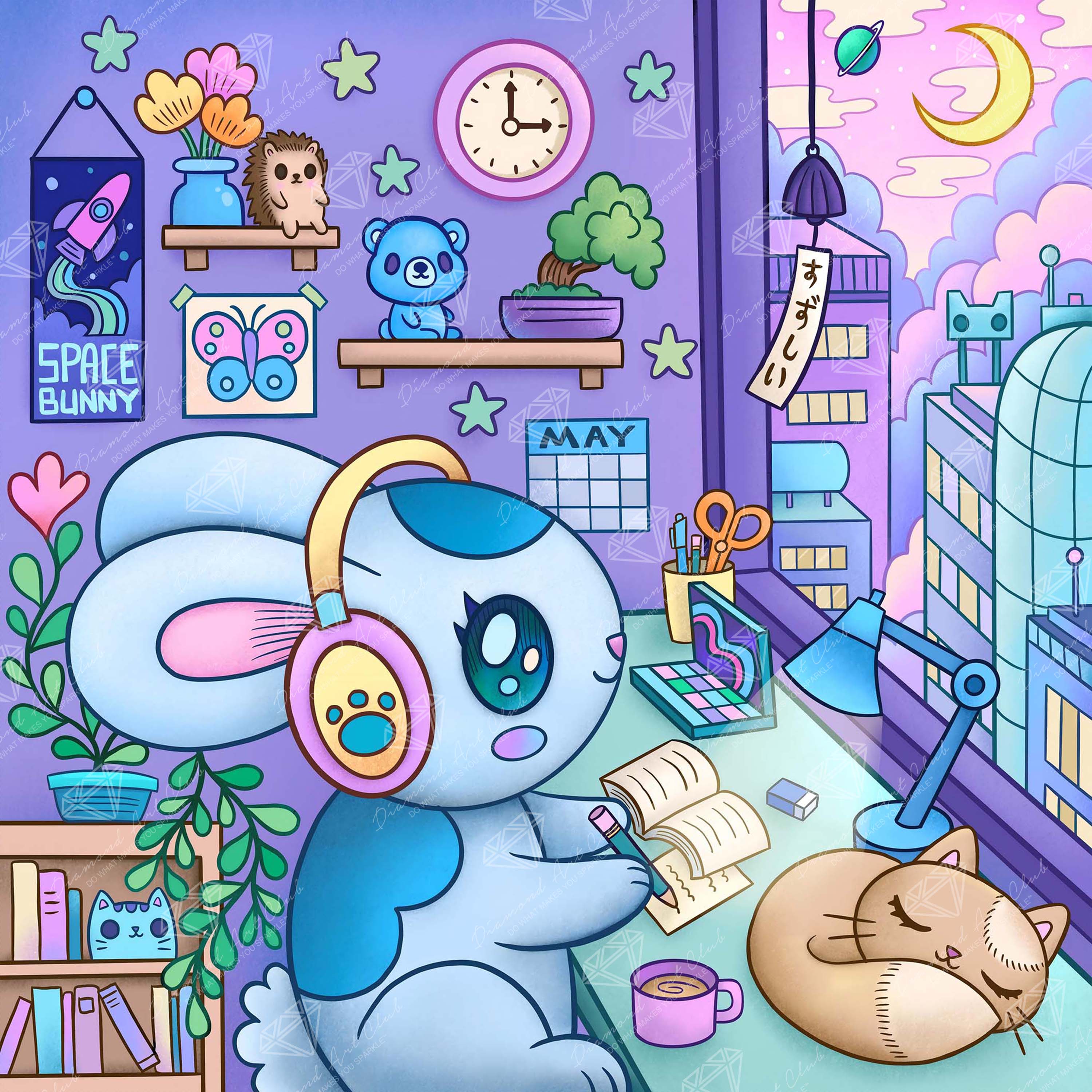 Don your headphones and drift into a dreamy city night in spring. Inspiration surrounds you in pure pastels with a yellow moon to delite your imagination.