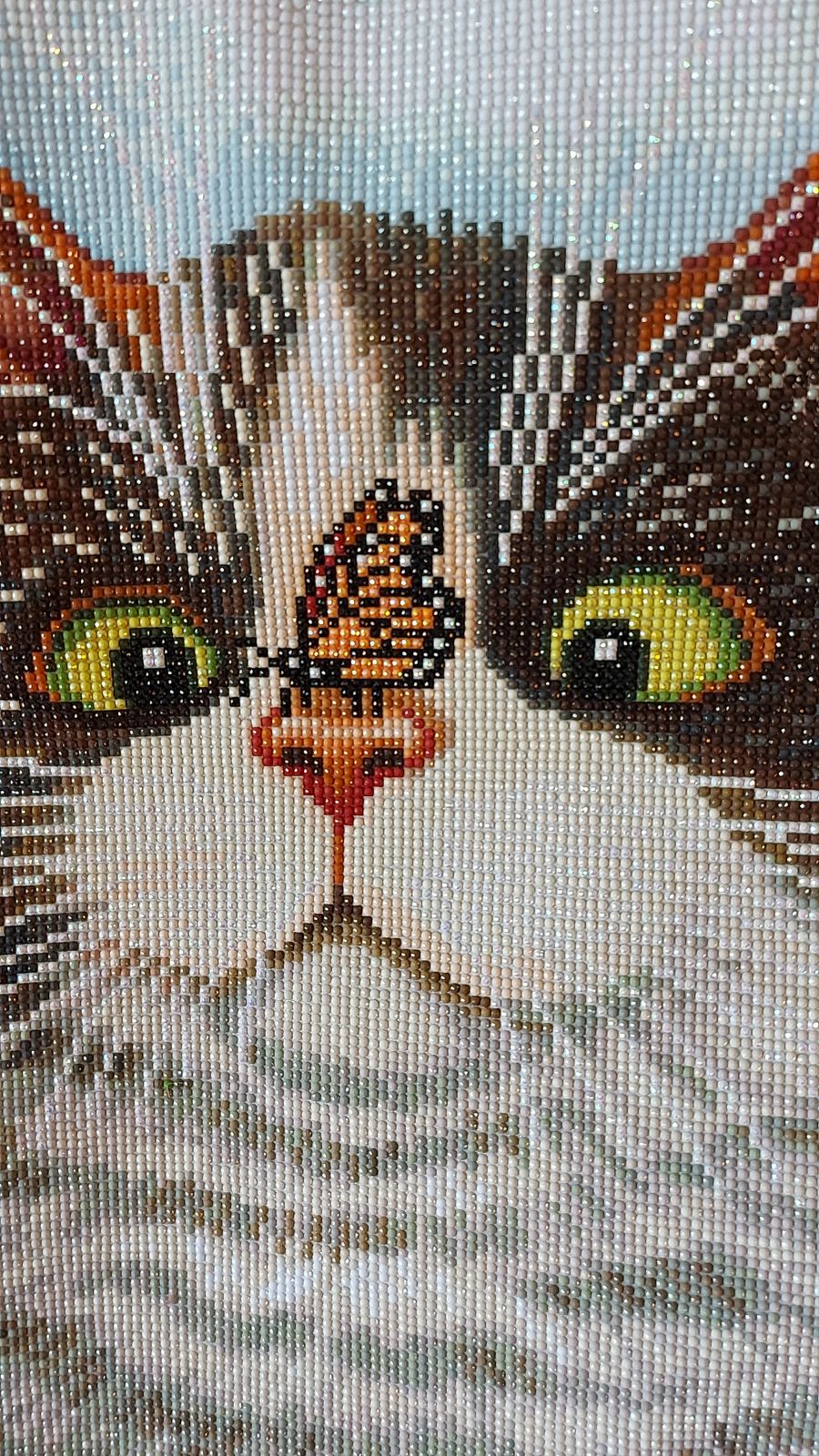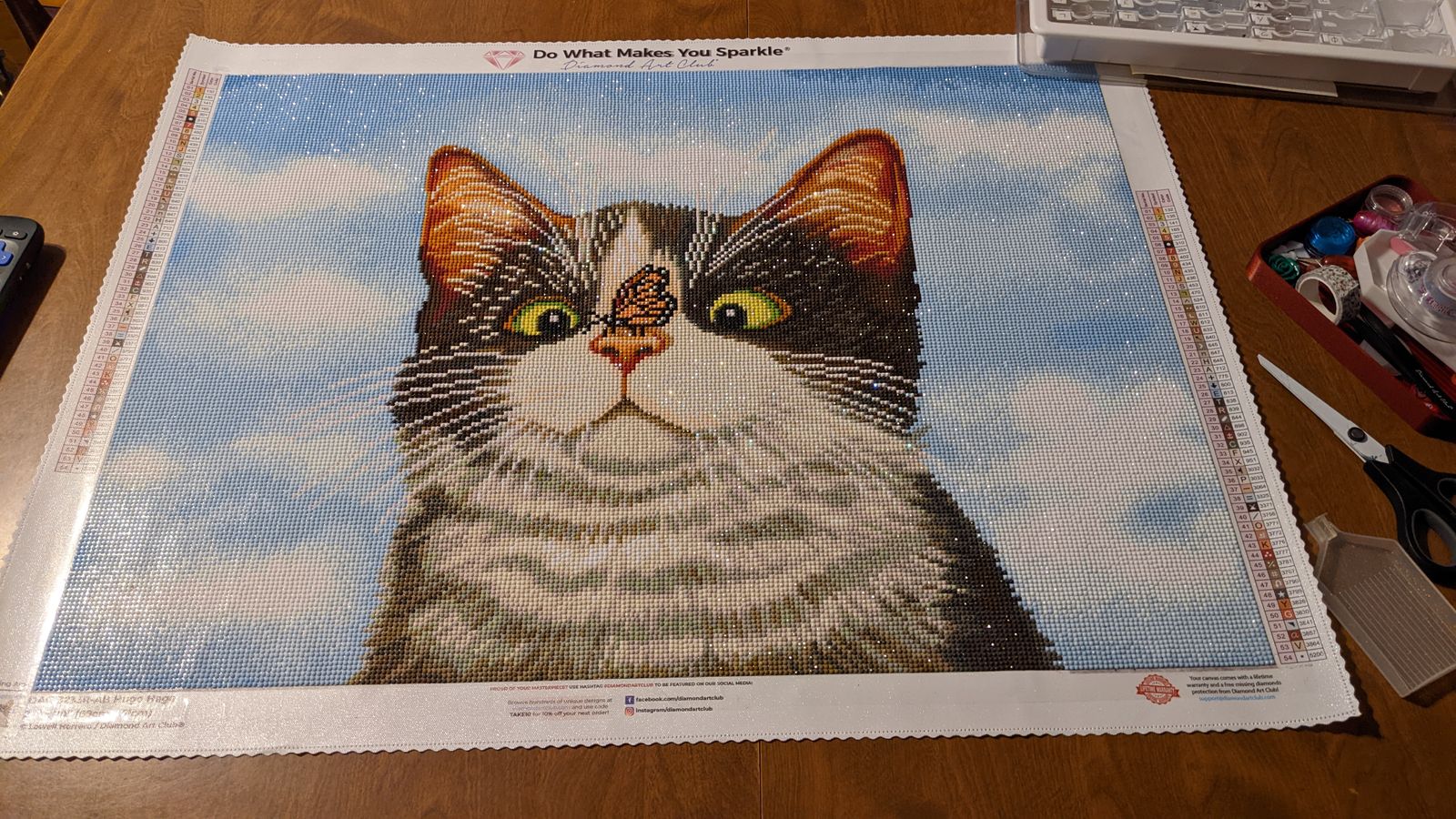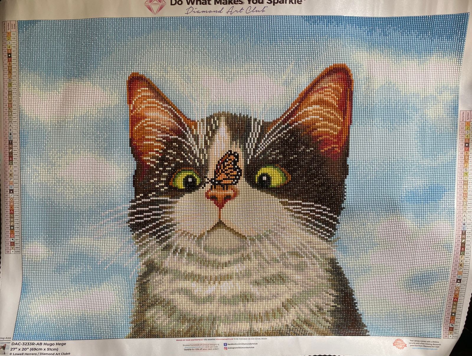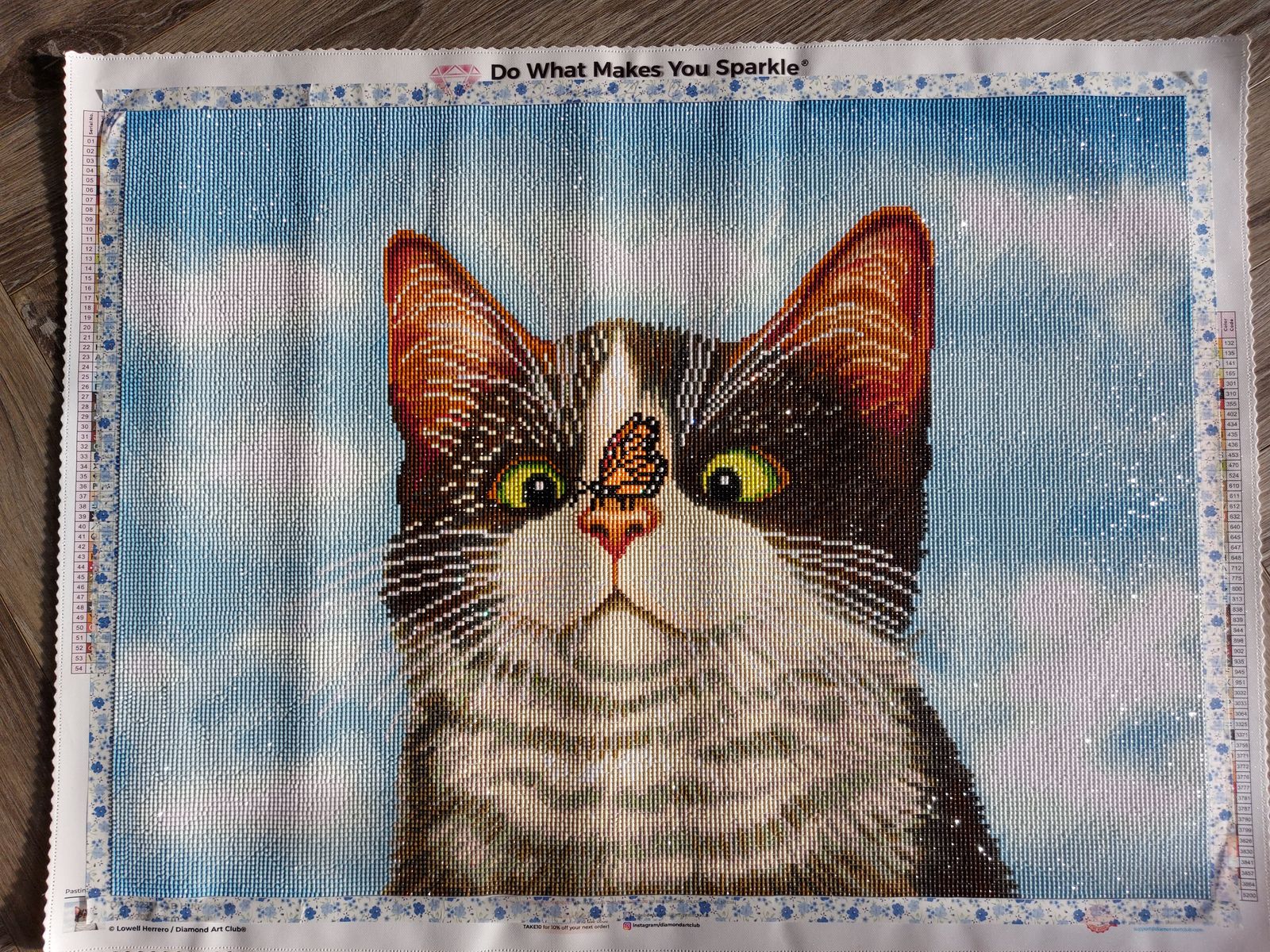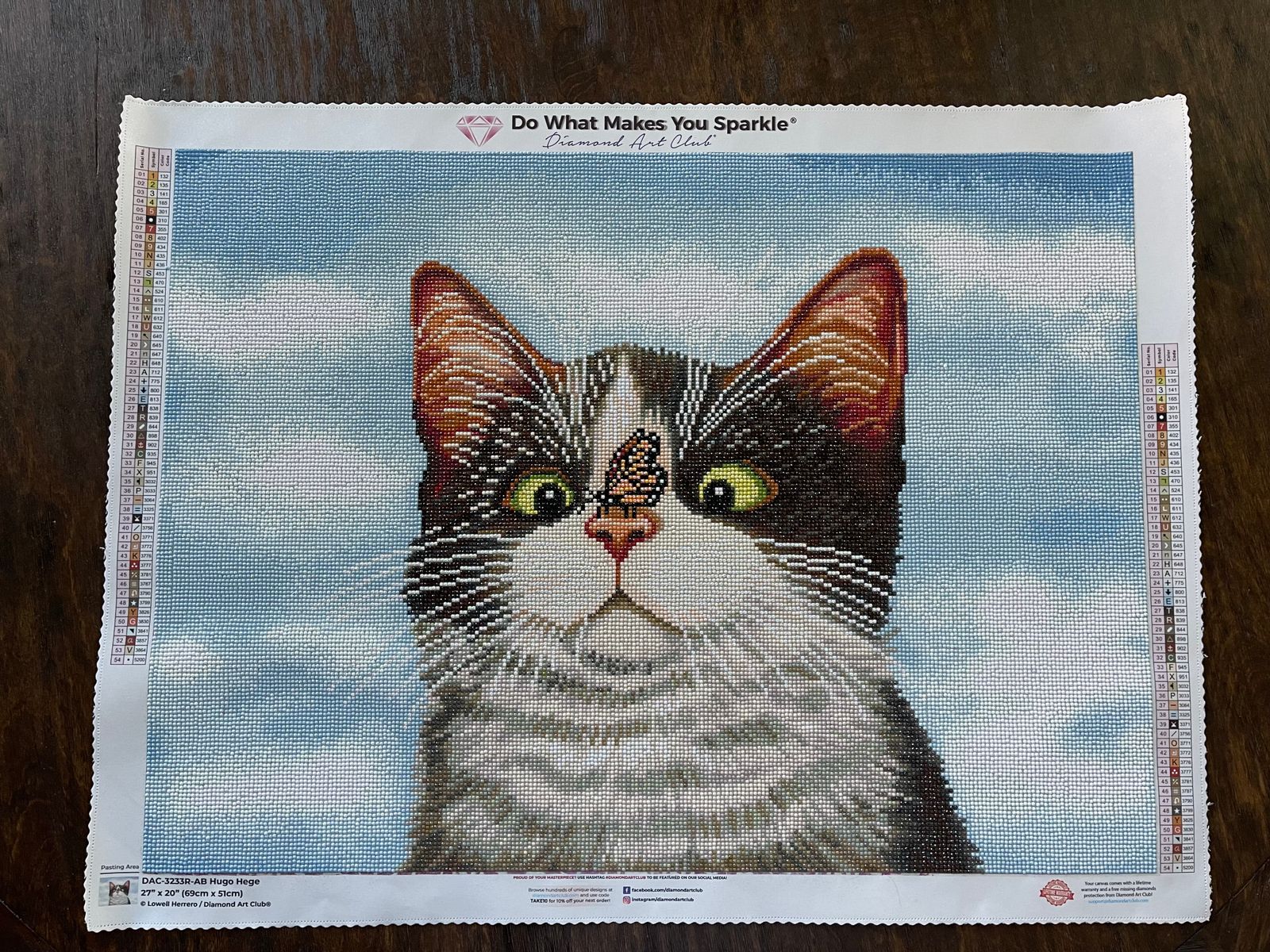 I loved working on this diamond painting. The background needed a good bit of single placing, but only had a few colours so it worked up extremely quickly. The cat was absolutely LOADED with confetti that resulted in amazing and intricate details that brought him to life. There were 3 AB colours in this kit that were all used in extremely thoughtful ways. They highlighted the cat's whiskers, the butterfly's wings, and a shade of green in the eyes. The materials were also wonderful as always, that is never a worry with DAC. The finished result is lovely, and one of my favourite kits I've completed.