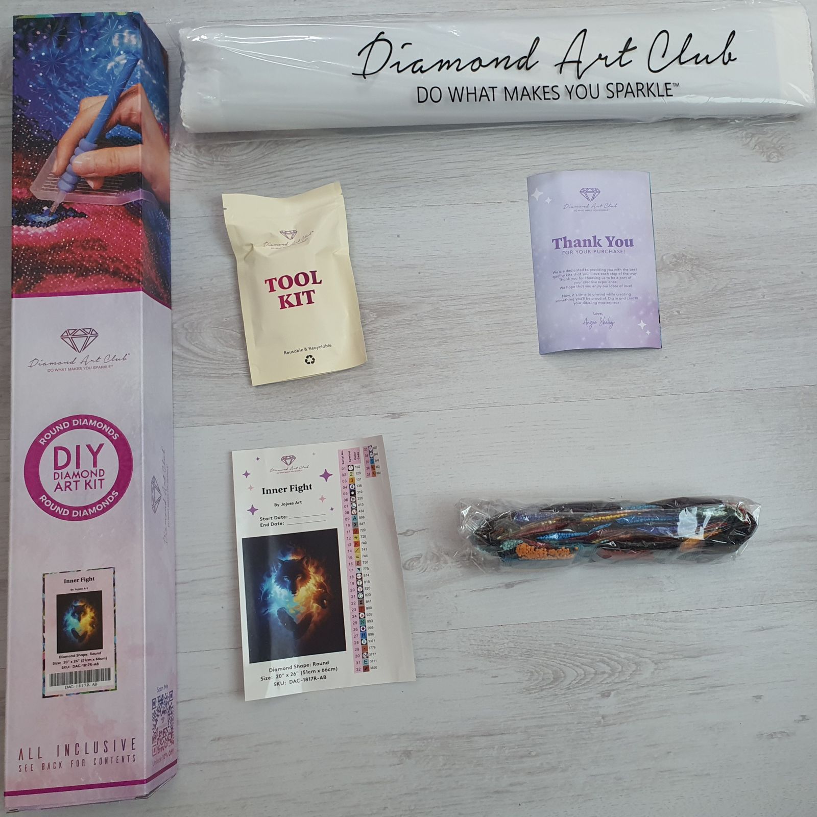 Canvas x 1, Diamonds, Tray x 1, Applicator + Grip x 1, Wax x 2