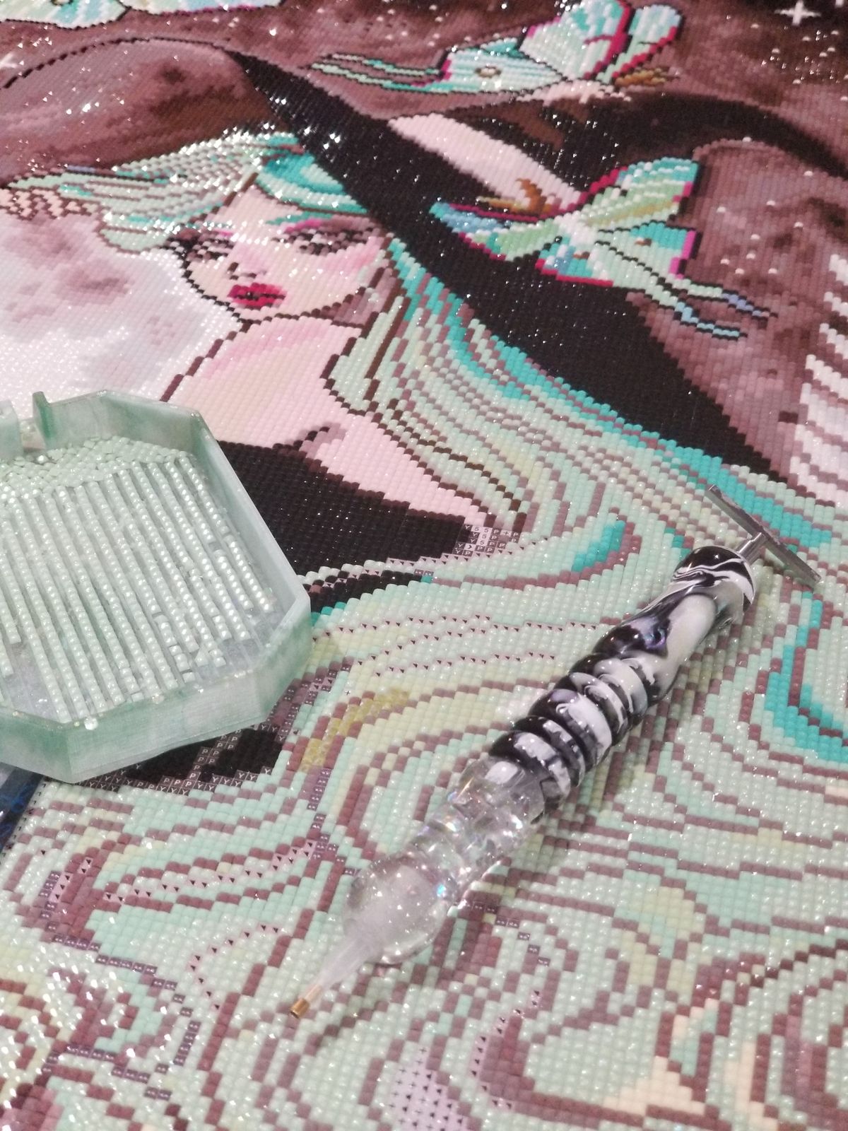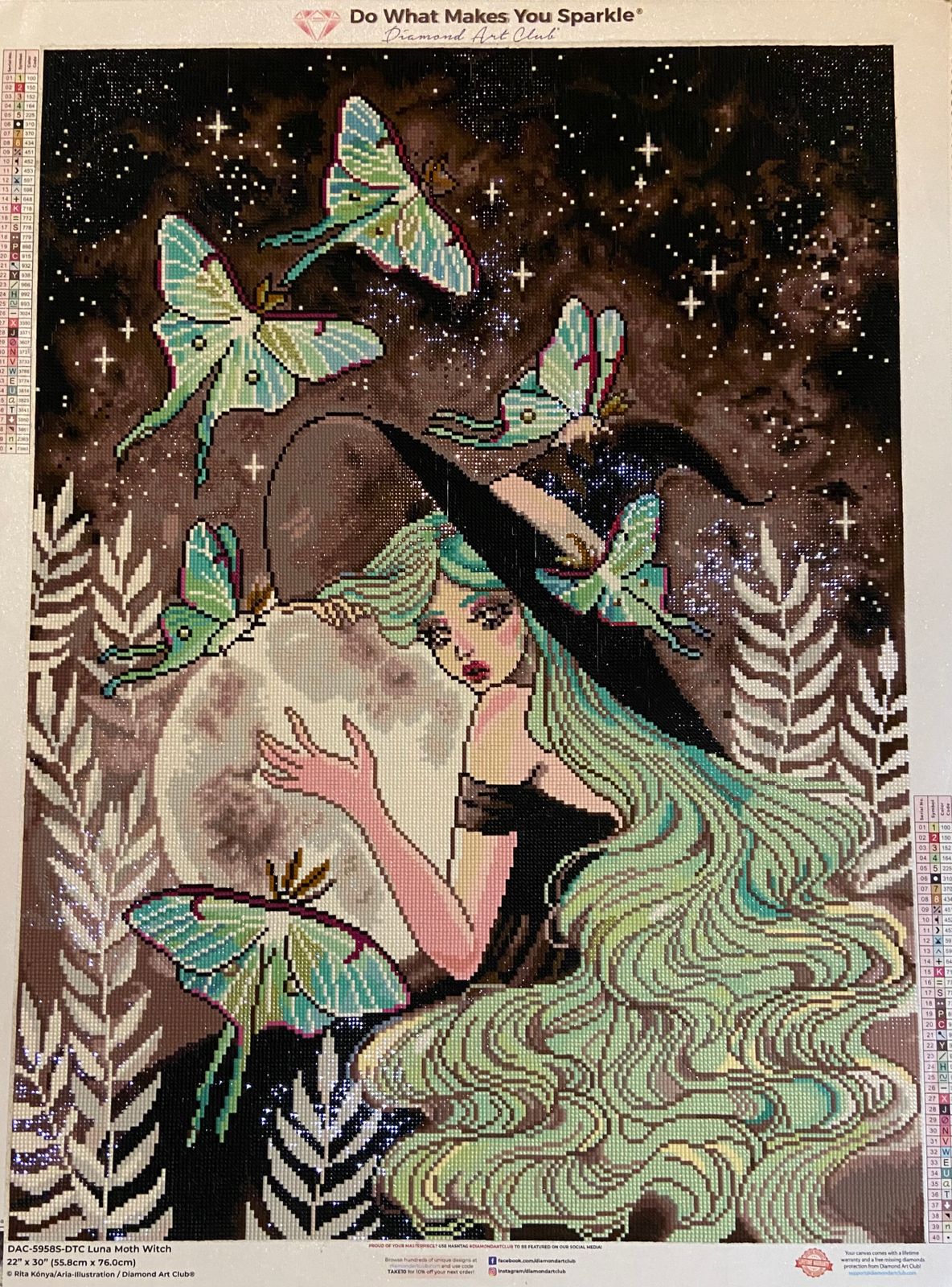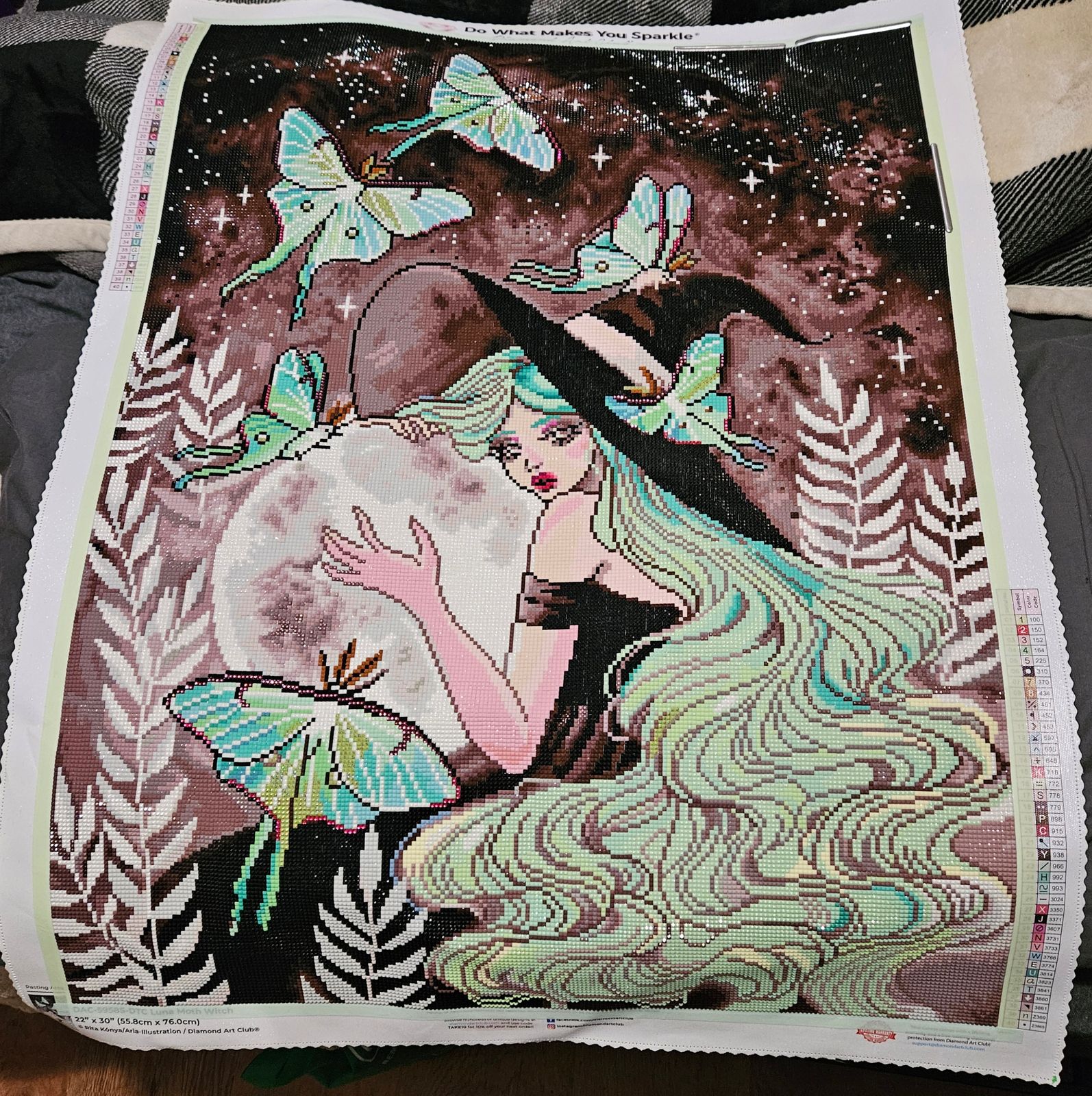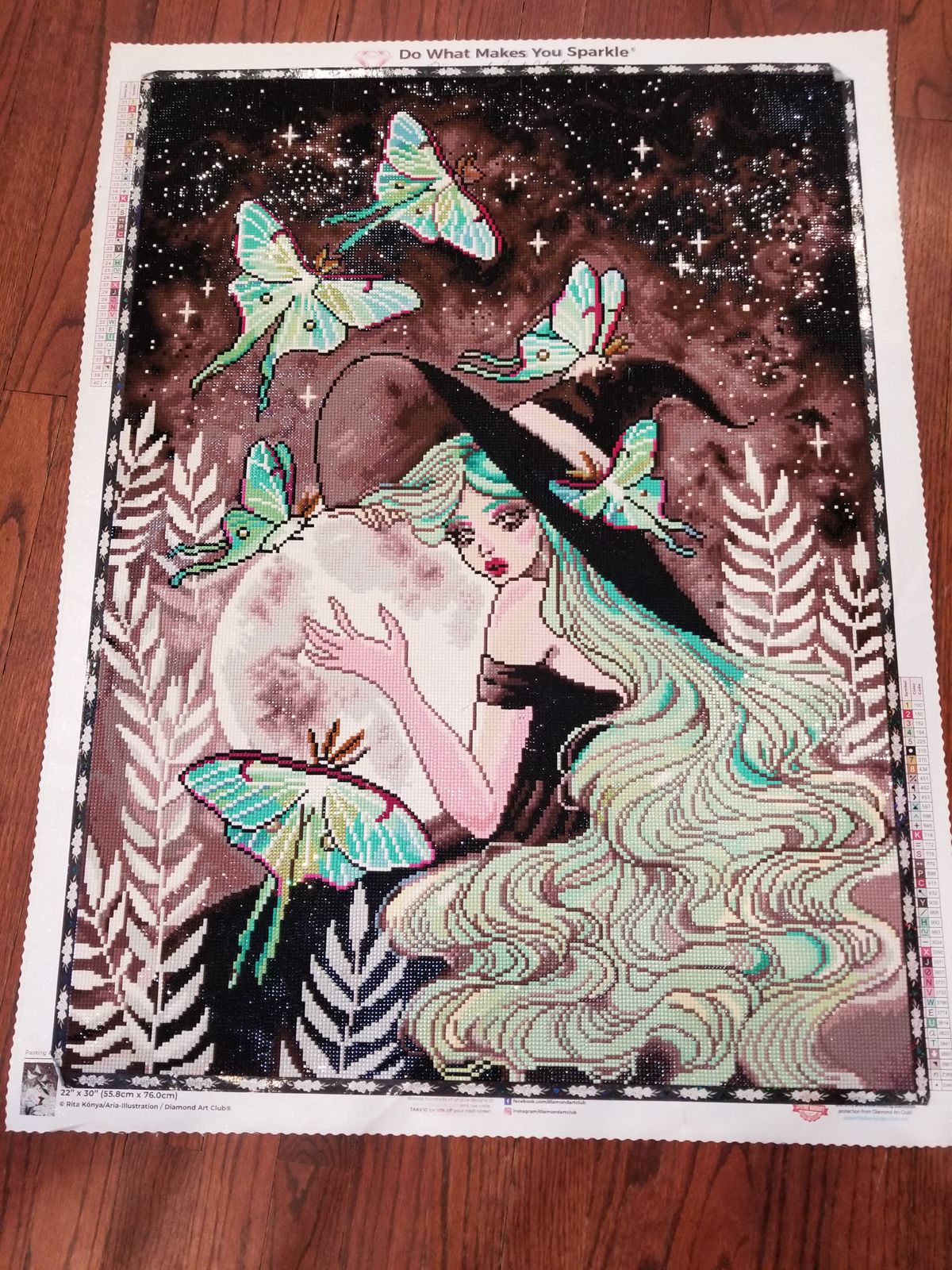 So very happy I purchased this painting when it was available. The fairy dust in the moon and her hear are heavy handed and a delight to place and behold. I ended up really enjoying the dark and neutral tones in this piece. Just enough variation in colors to not make it boring but not super tedious and confetti heavy.