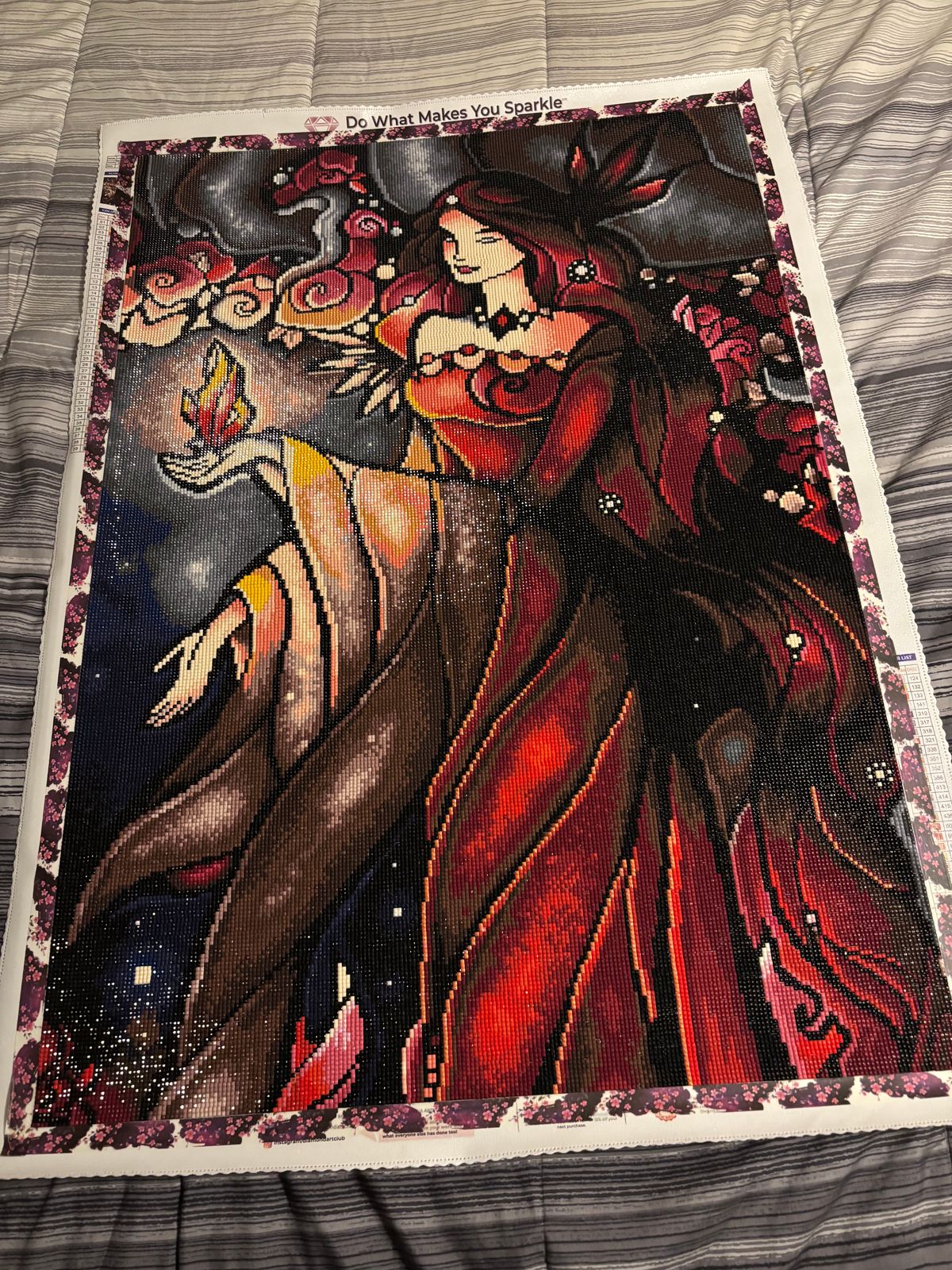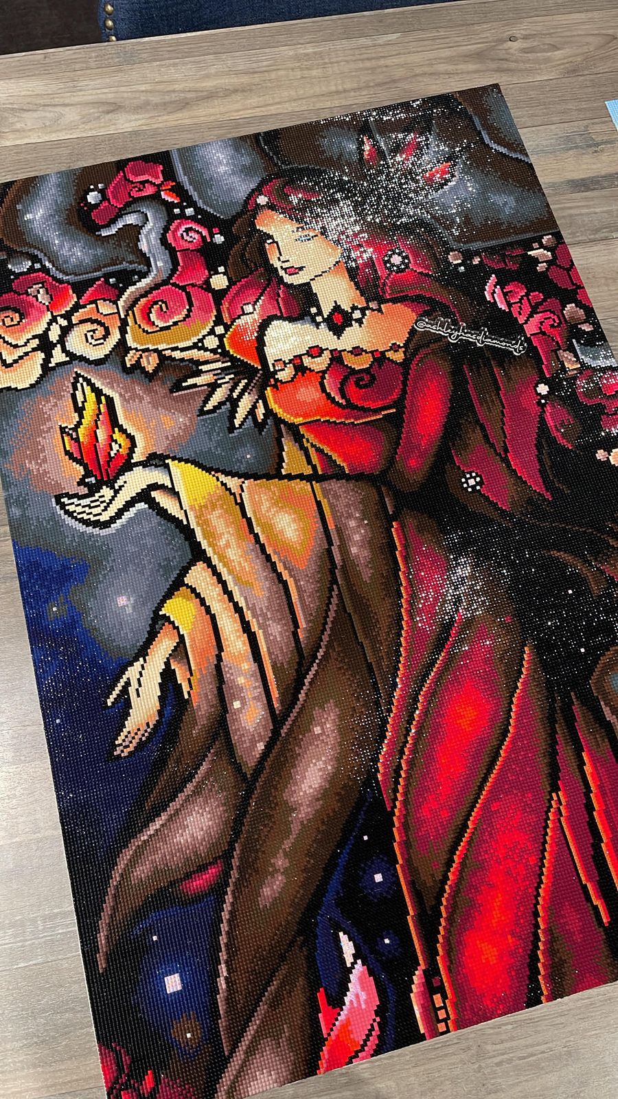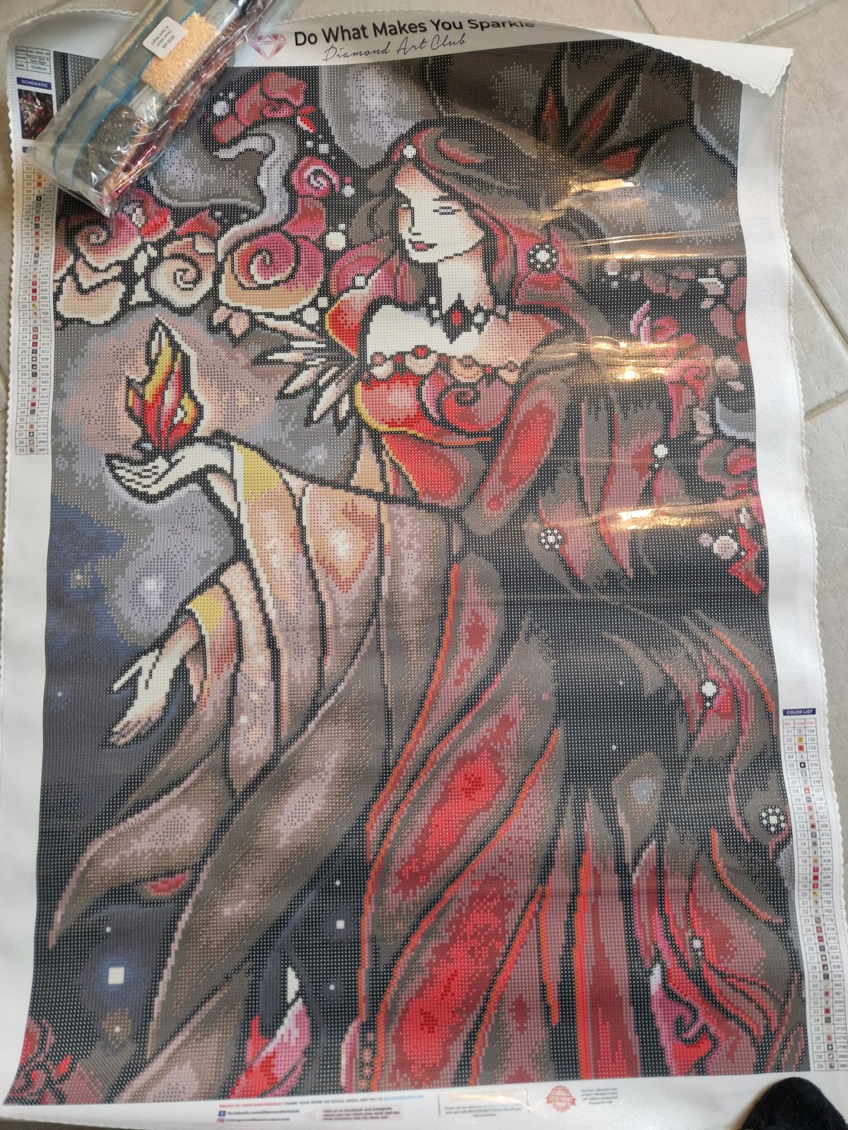 Gorgeous artwork!! I love the stained glass look of it. My mother loves it and has so much fun. She works on it every day that she can and will finish it soon. The diamonds and canvas are of wonderful quality as usual and looks so pretty when the diamonds are on it.