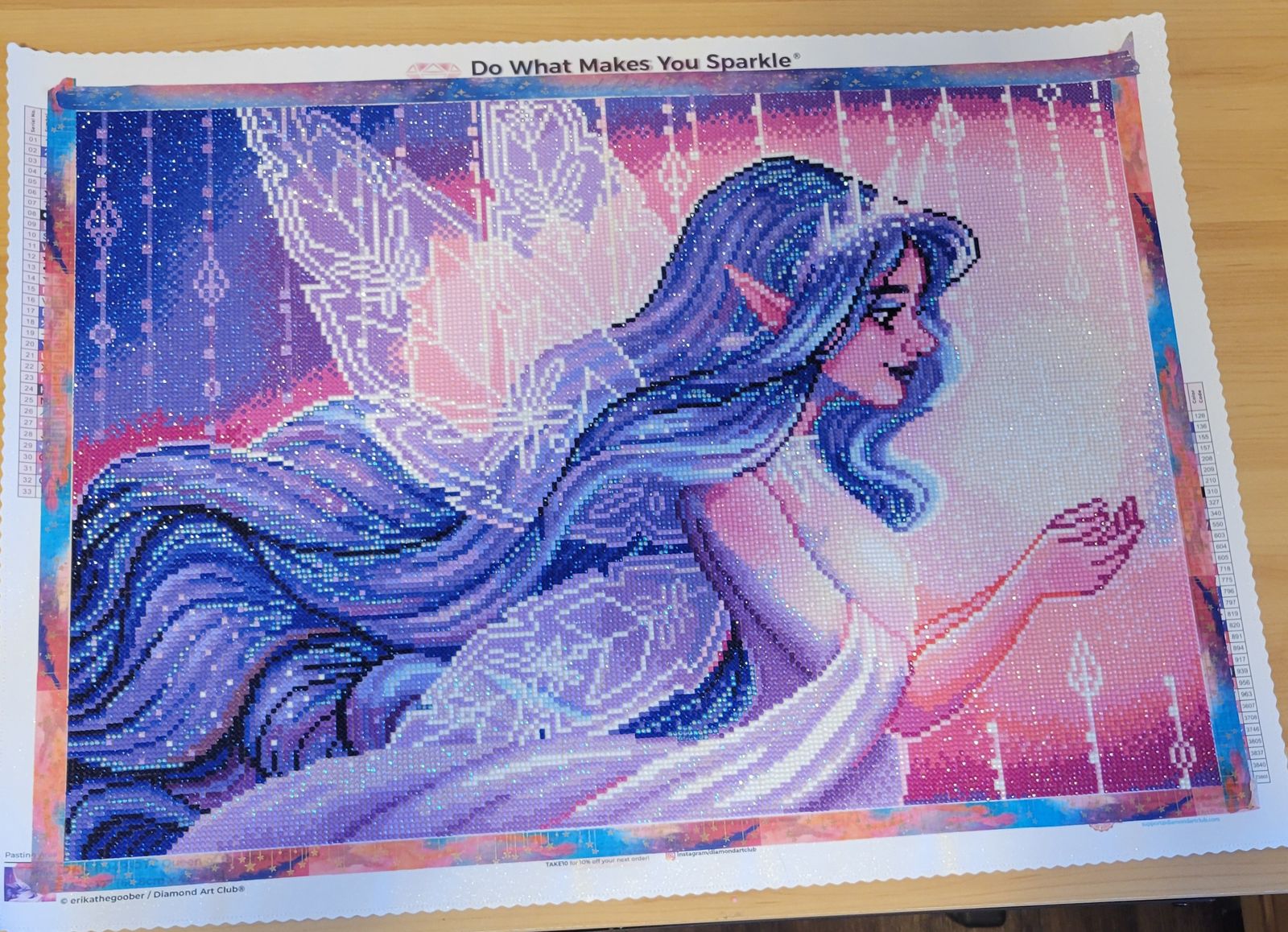 This diamond painting only took me approximately 20 hours in total. I did struggle with one color of drills seemingly slightly smaller than others so they were a little hard to multiplace with other drills around. Other than that it was a complete joy to work on.