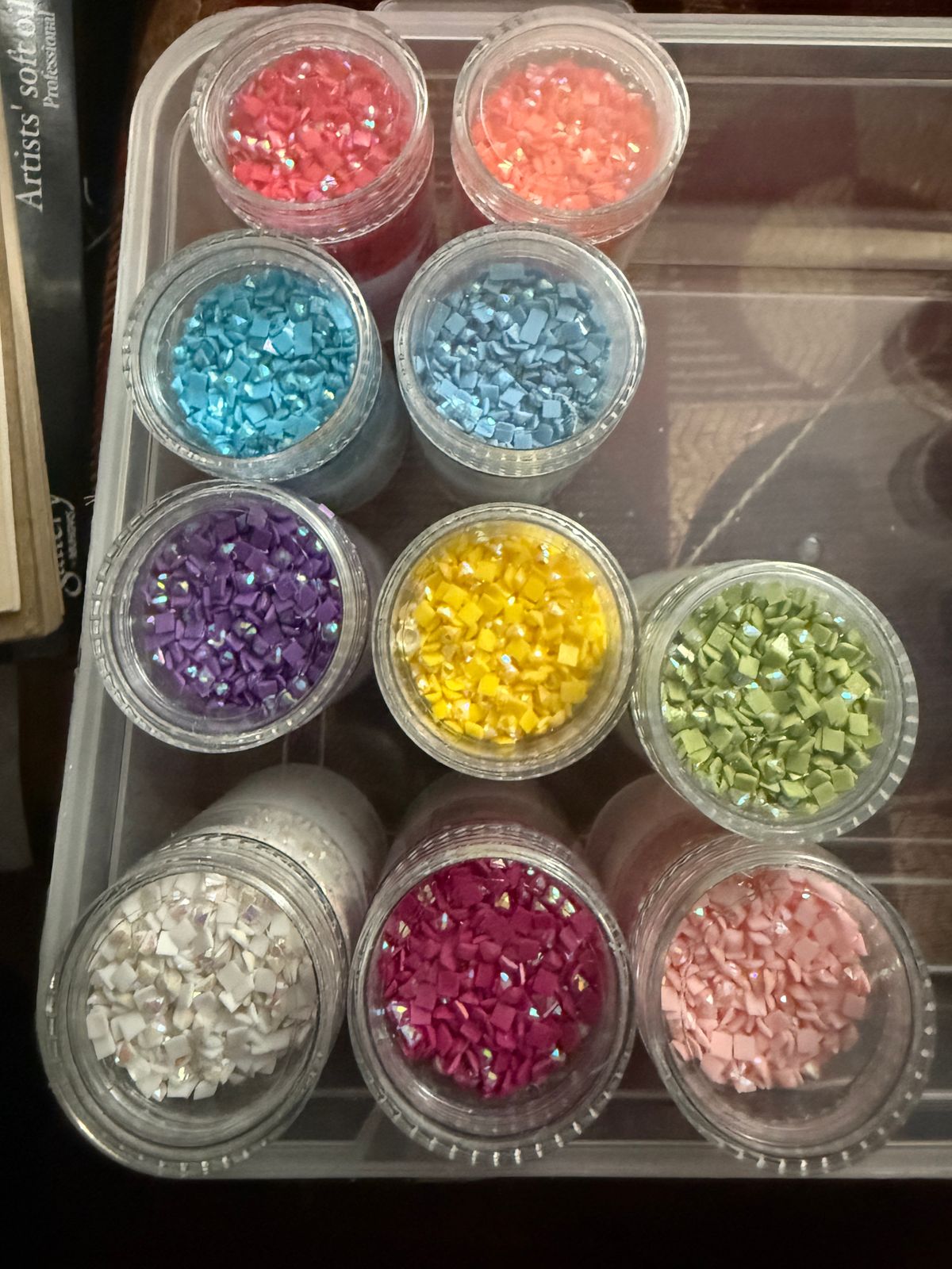 Elevate your diamond painting projects with this curated set of 10 Aurora Borealis square drills. Each jar contains 0.63 oz (18g) of our signature 13 or 20-facet resin drills with a special iridescent coating that enhances your designs with a luminous shimmer.