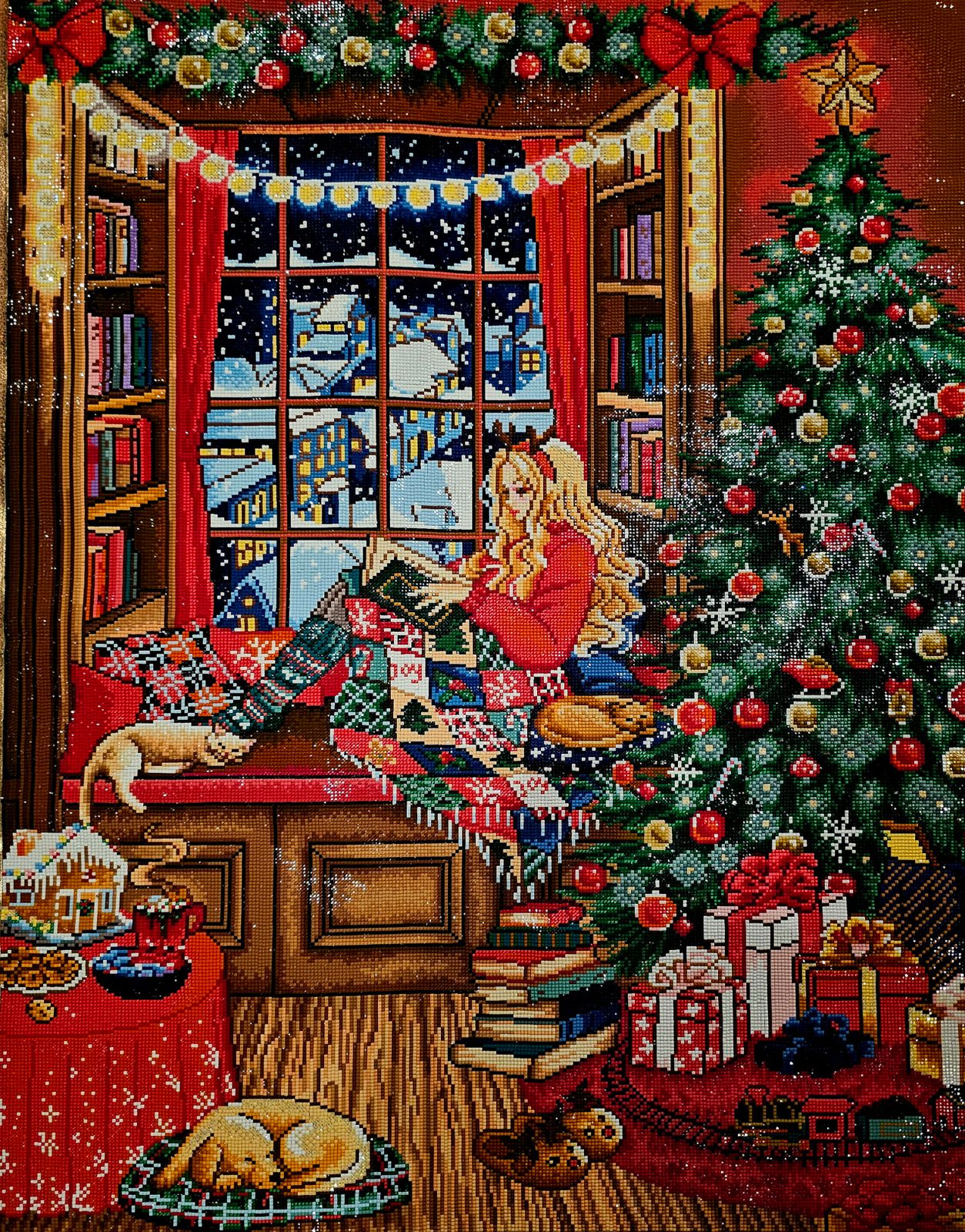 Snuggle up with a magical book in a comfy-cozy, Christmas-decked nook. Surrounded by twinkling lights, a decorated tree, and furry friends, it’s the perfect setting for holiday relaxation and joy.