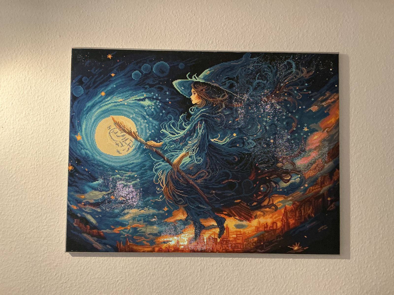Ride an enchanted broomstick into the starry blue skies above. A swirling full moon lights your way through a glowing orange city toward magical adventures.
