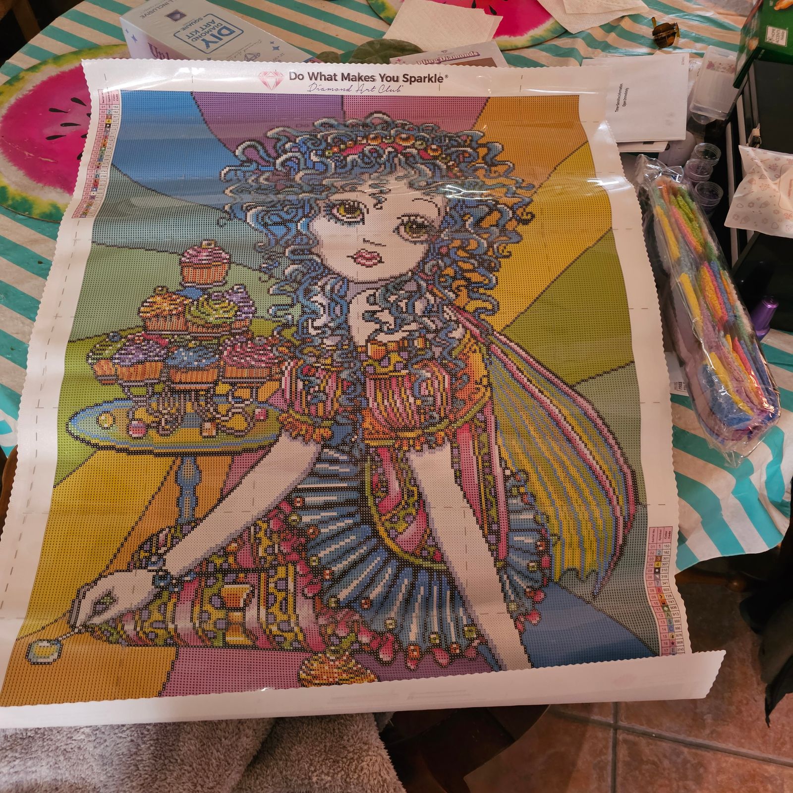 While only 1/3 done this beautiful square you can see the mix of confetti and shine from bold color blocking. Can’t wait to get back to finishing.