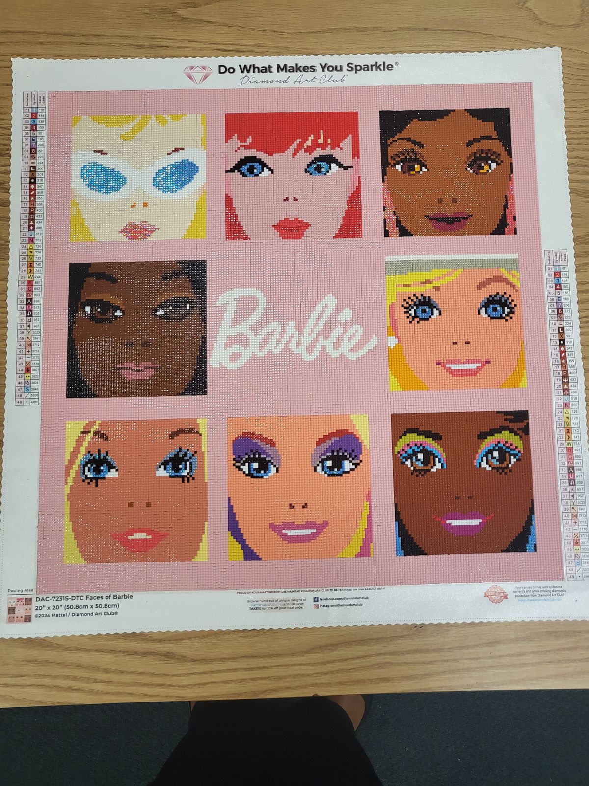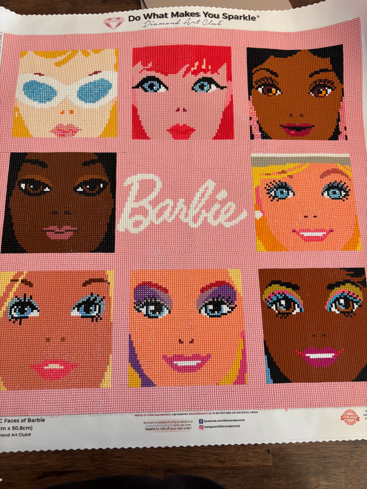 I completed this canvas to give to my sweet friend whom collects Barbie's. I was somewhat disappointed with the drill field on this canvas as it had gapping. I have used mica powder & it looks OK. I do think she will enjoy it & be proud to display it in her room dedicated to her Barbie collection.