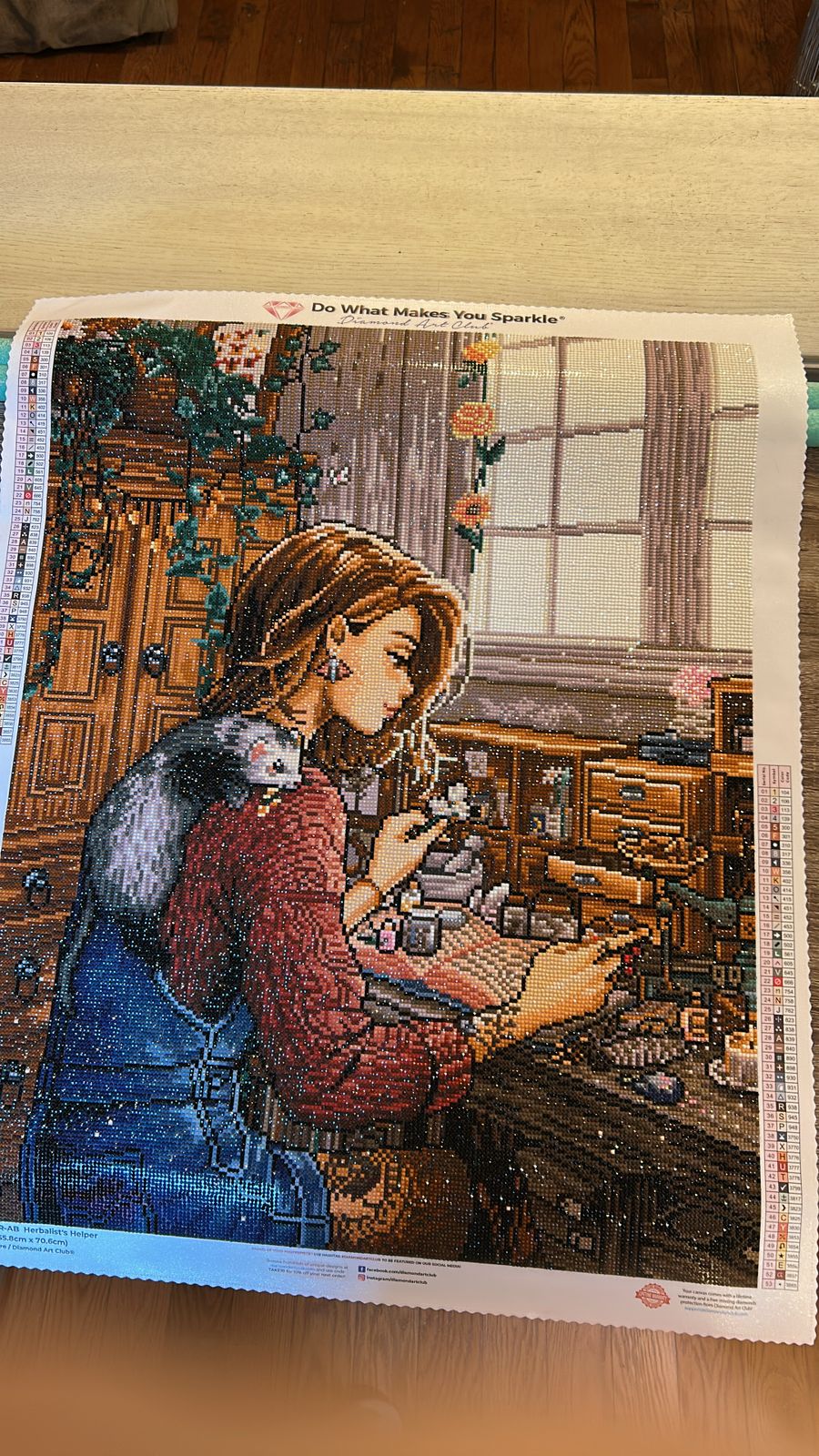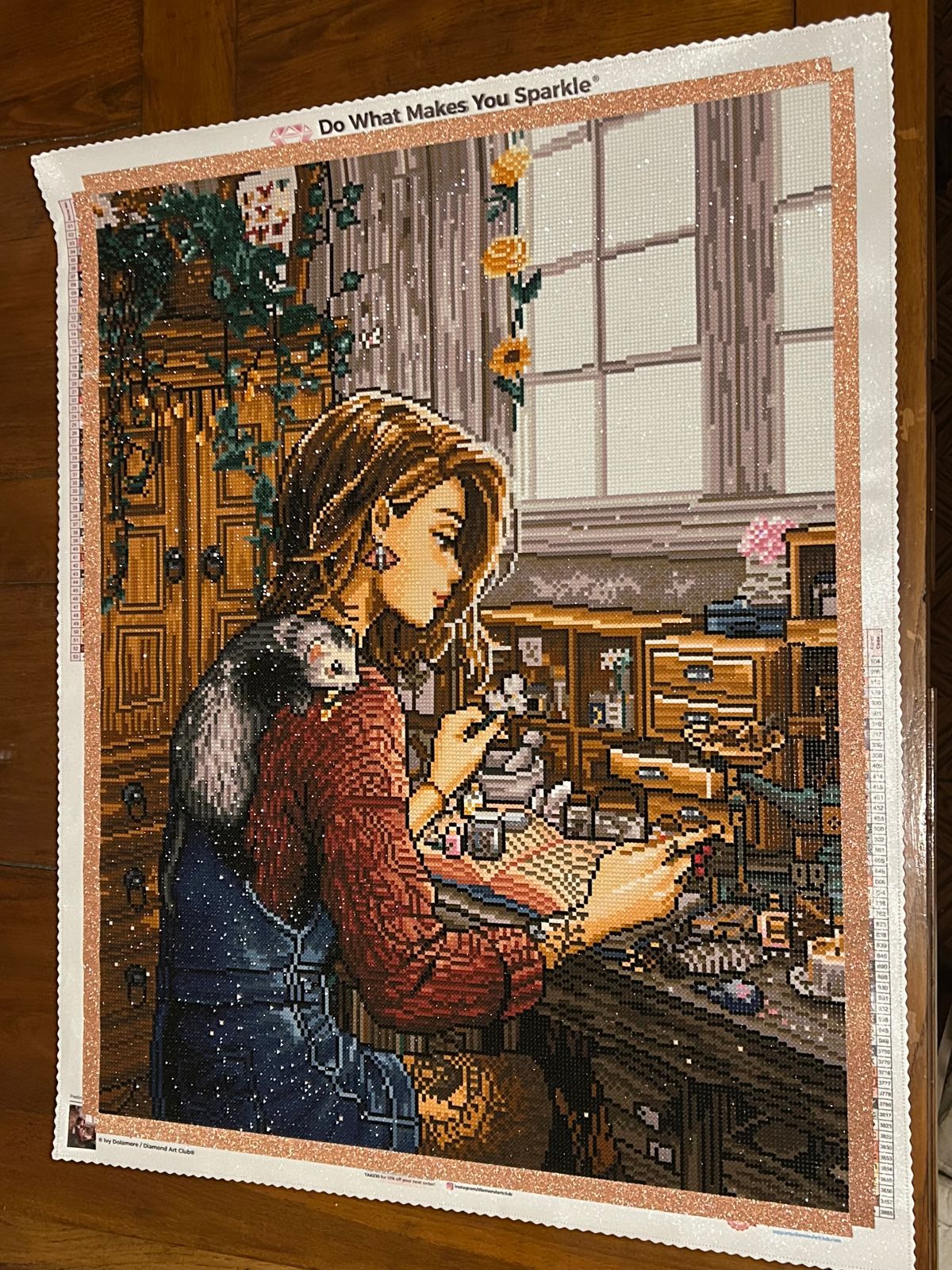 Normalmente siempre hago lienzos de diamante cuadrado, así que cuando cambio a diamante redondo me cuesta un poco acostumbrarme. Con este lienzo ha sido fácil y fluido. Me parece muy hermoso el rostro de la chica y muy divertido el hurón.