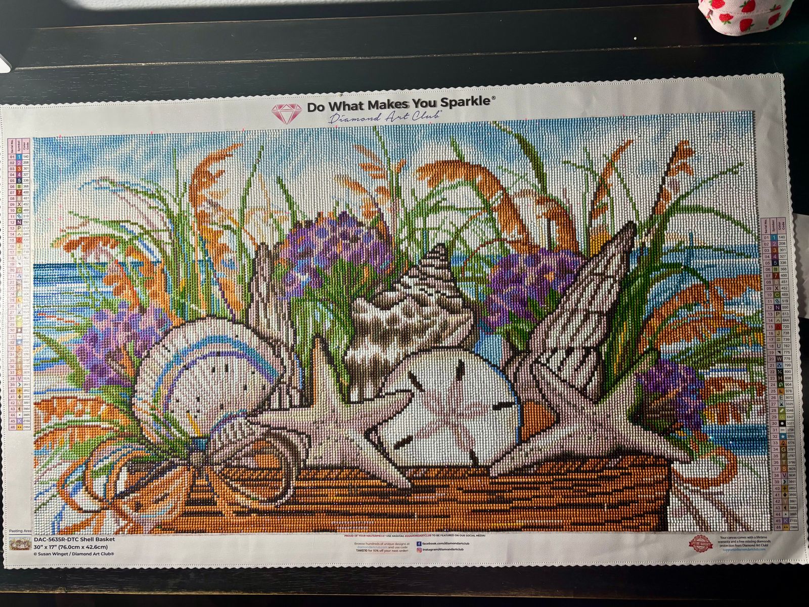 This one went quick and it’s nice. Just a little disappointed that the pink lines from the plastic cover sheet transferred to the canvas. It is visible since it’s a light background with round diamonds.
