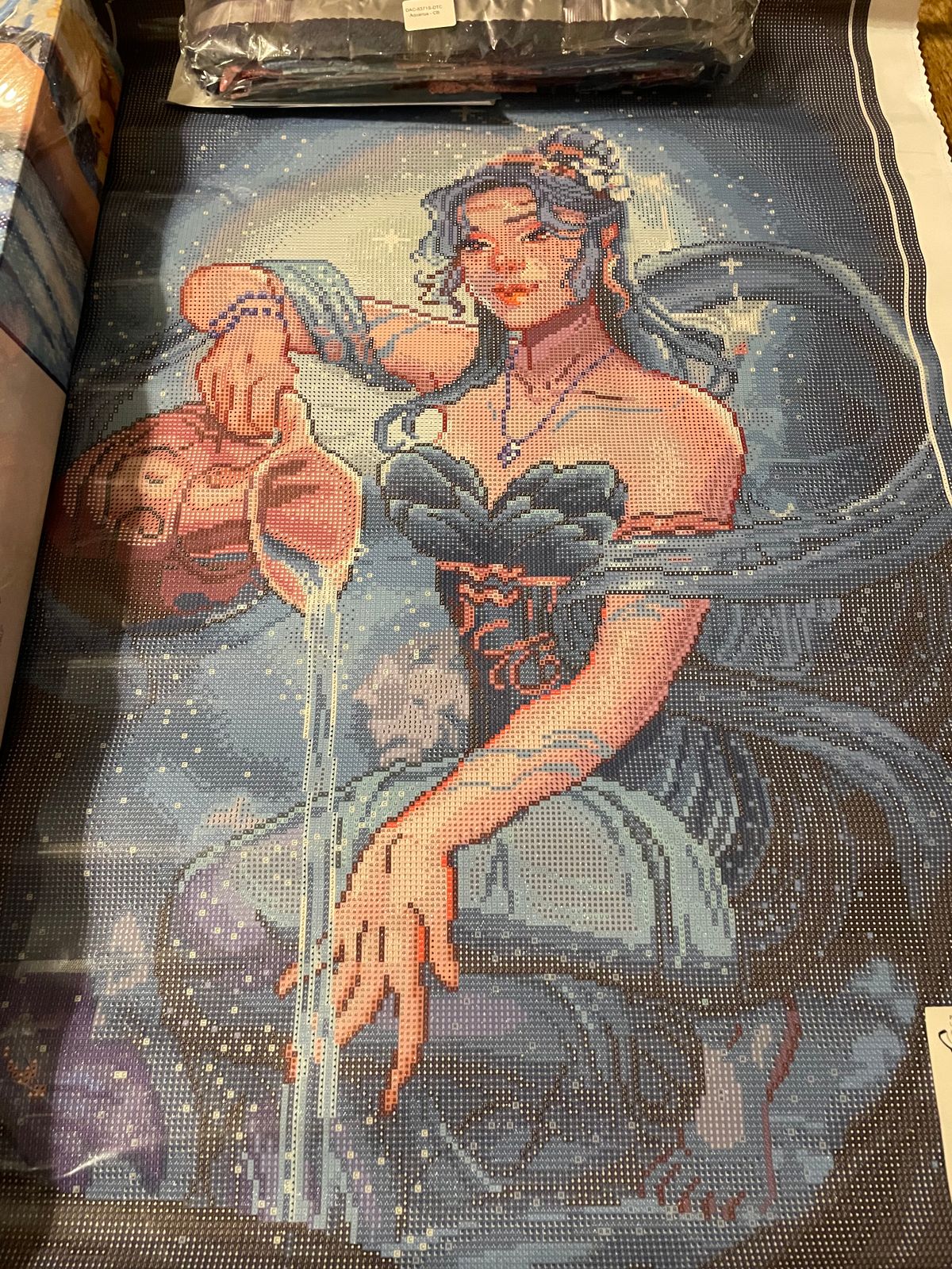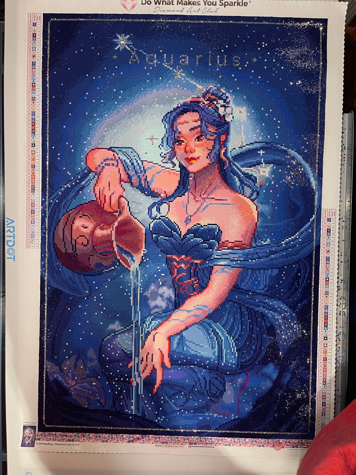 This is a gorgeous rendering of Chrissabug’s Aquarius artwork, it is going to look fantastic when finished. It comes with 64 colours including 2 ABs (blue and white), 5 fairy dust and 1 iridescent diamond. The variety of blues is great, I love the colour palette for this painting.