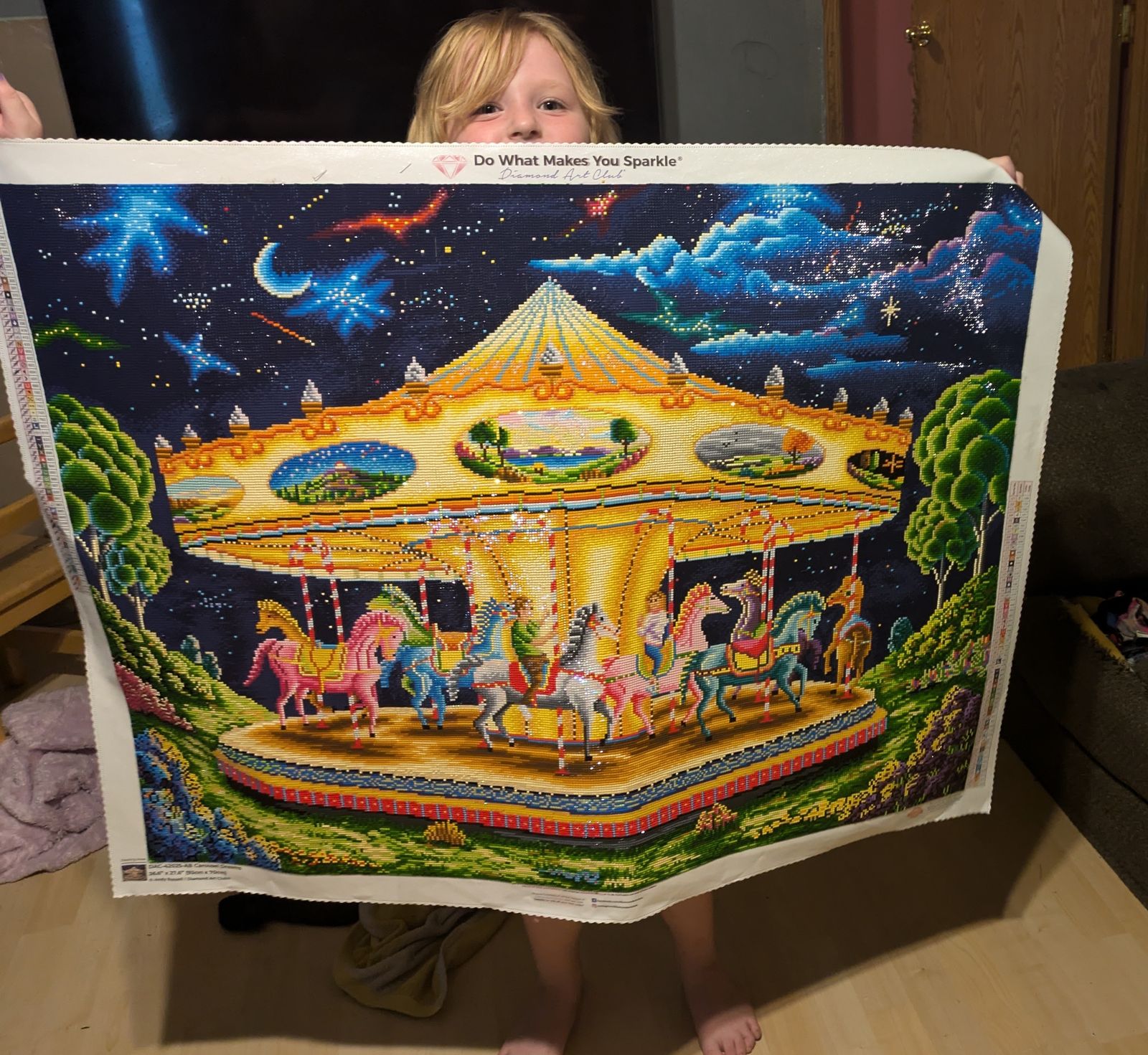 I'm so happy to be able to do this diamond painting! It introduced me to diamond art club as the artwork was so pretty. I changed the hair color of the man to match the hair color of my late grandfather. When I was a young kid we rode the carousel together all the time and now it looks like we're always riding the carousel!