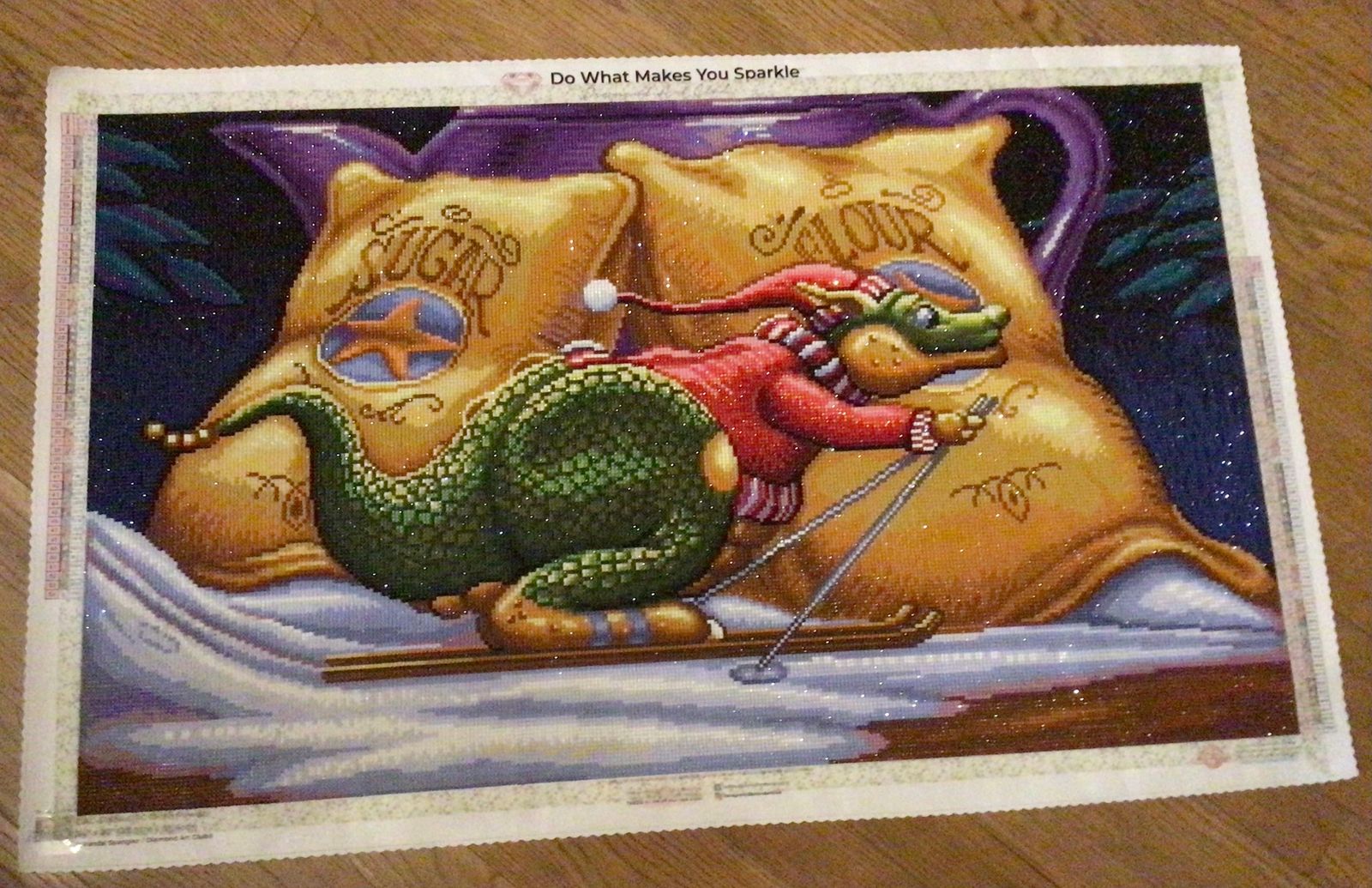 I live that the dragon has a Santa suit and is skiing in the flour. So whimsical!