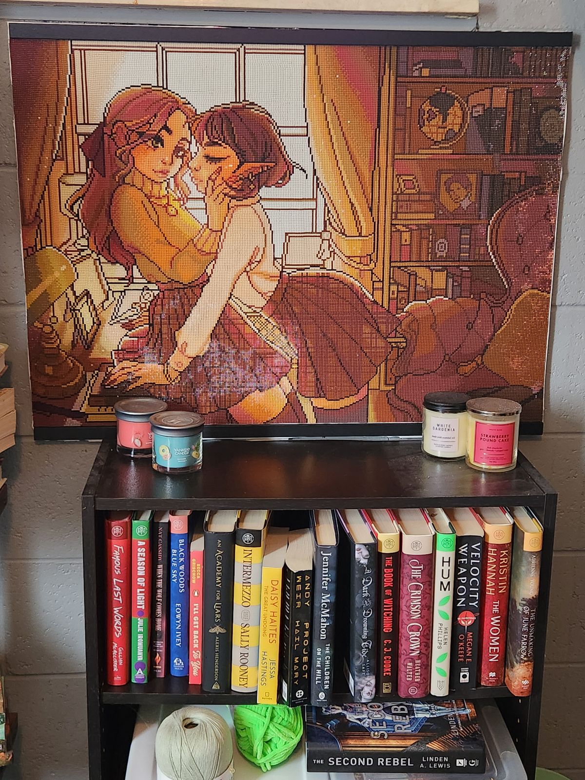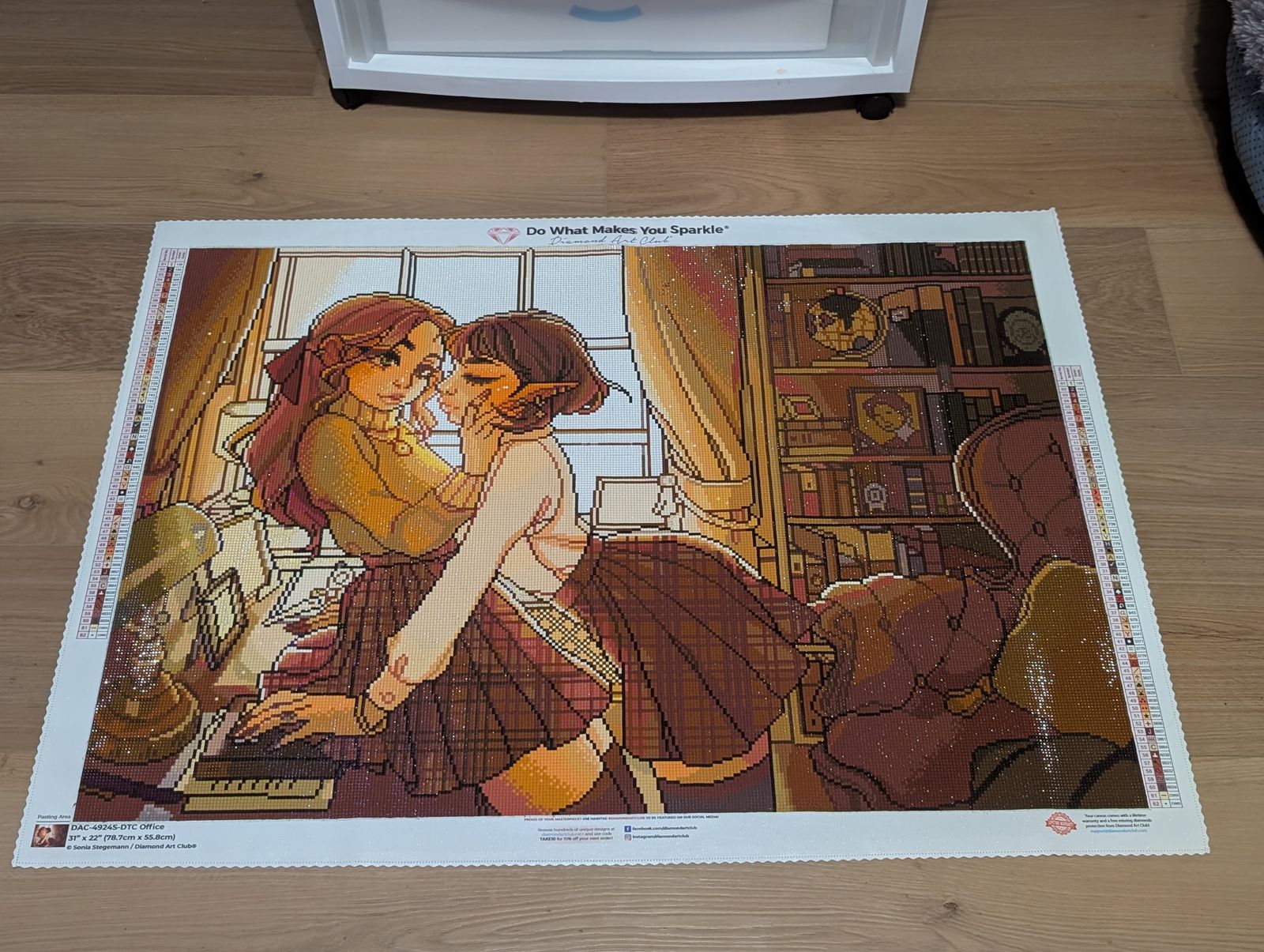 I love this artwork and the style, but the color scheme did drag my enjoyment down a bit. I ran out of one color, but my warranty came through for me! Overall, this turned out beautiful, and I always appreciate a nice sparkly sapphic work of art.