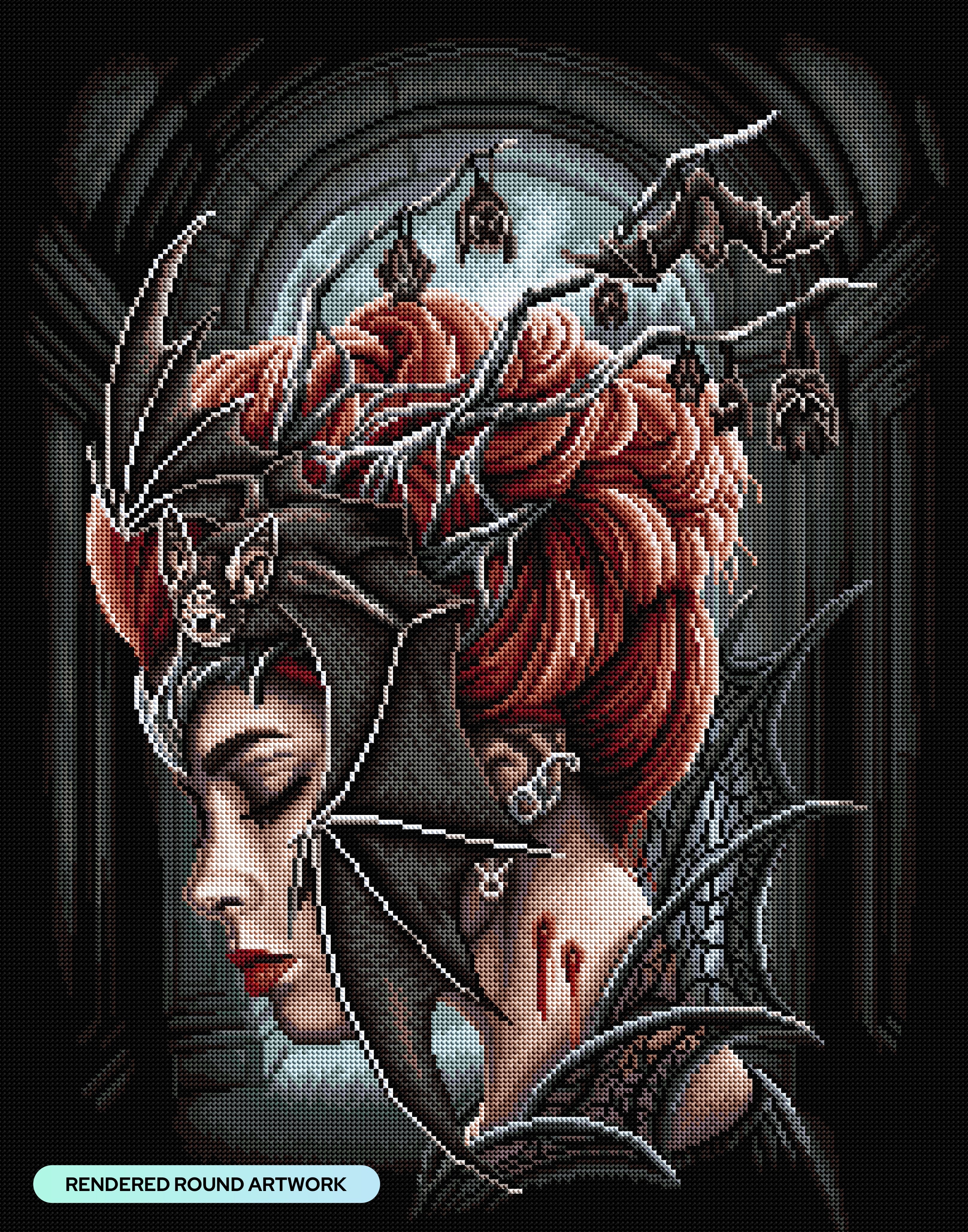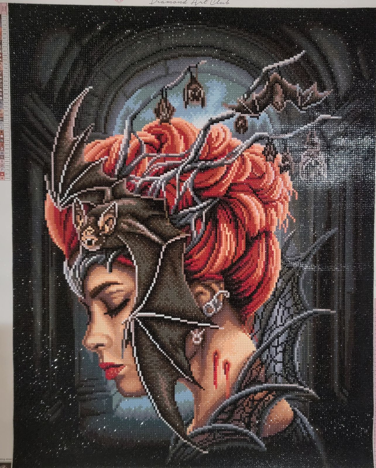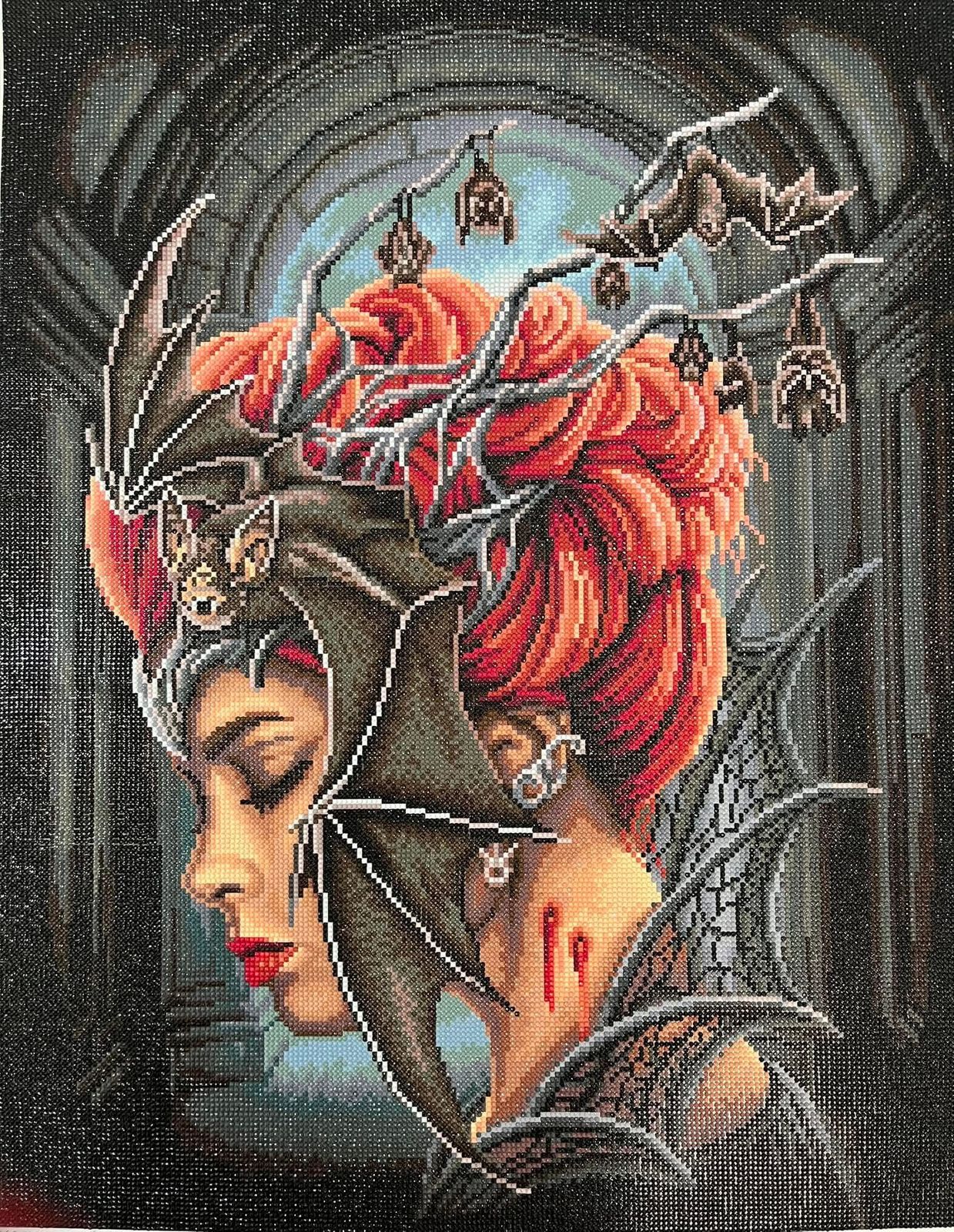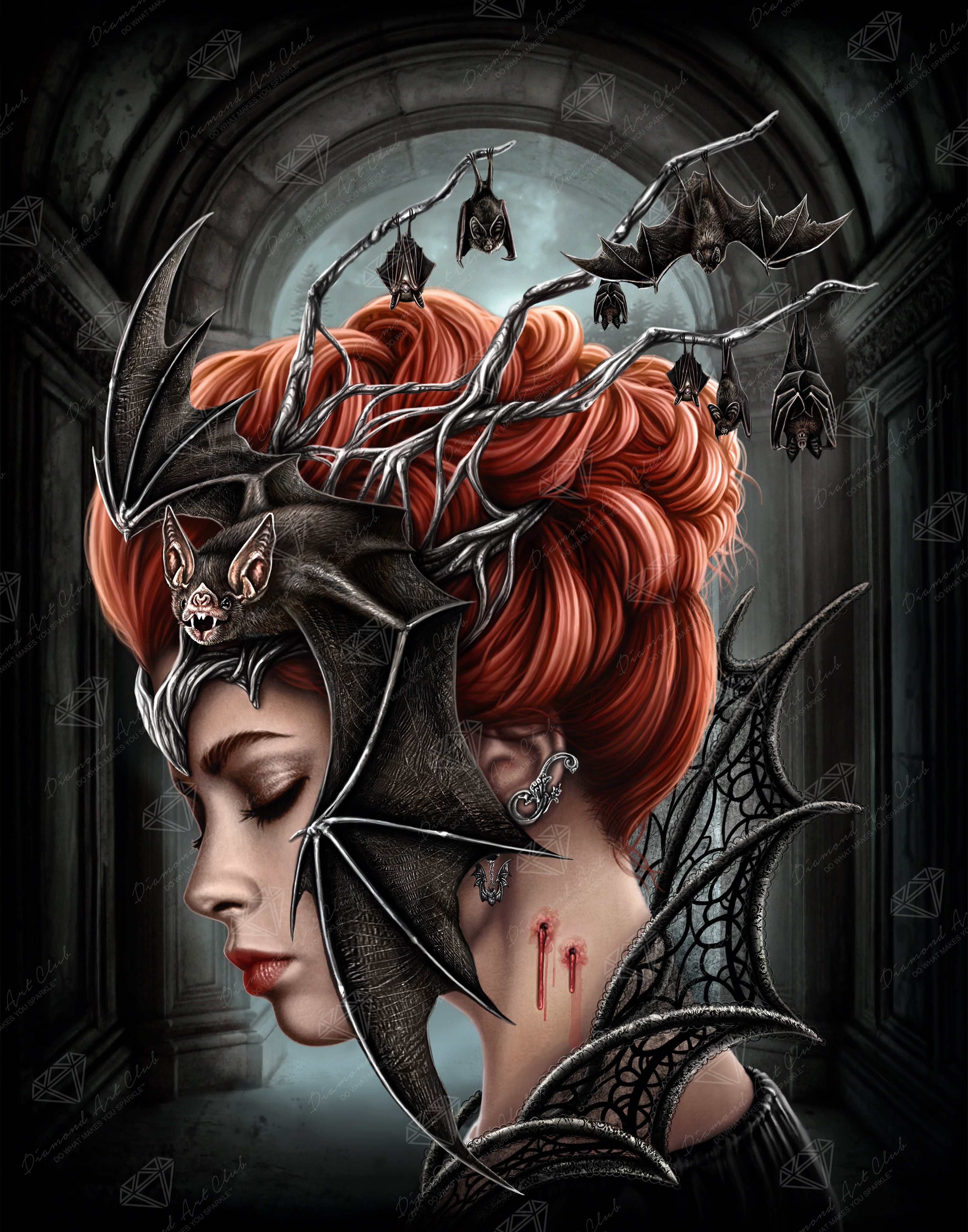 Bow before this haunting vision, whose crown of bats and shadowy wings command the darkness with a silent, powerful grace. Behold the blood-red marks of her rule that speak to the allure and danger of dwelling in the depths of the night.