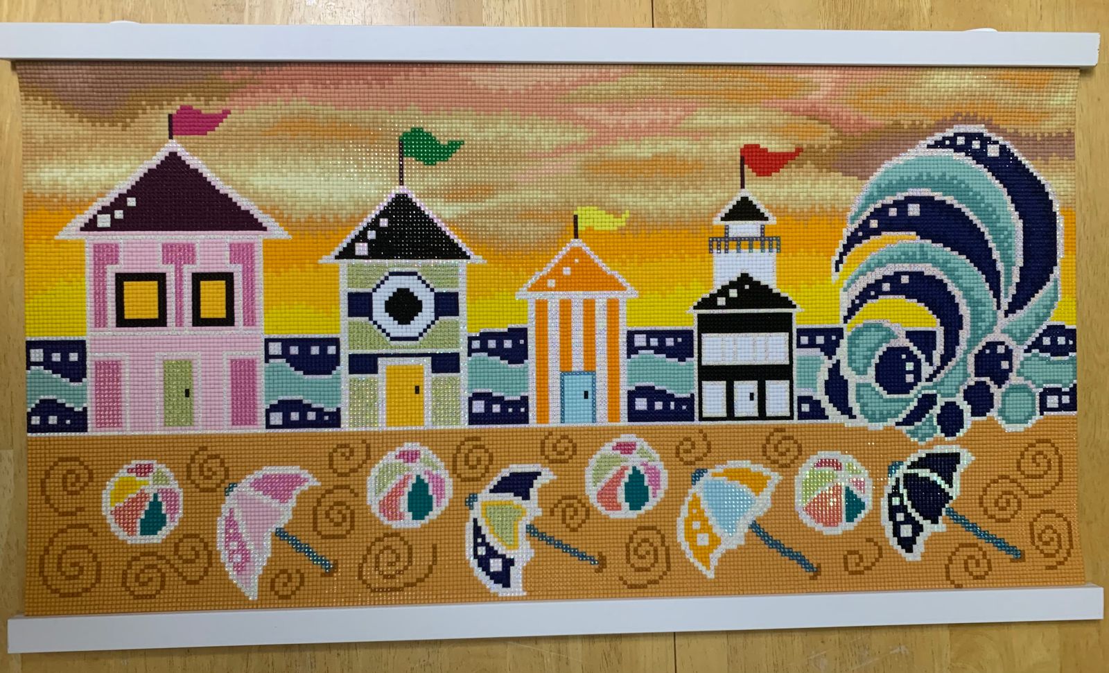 What a fun, colorful scene to work on! The ABs in this kit were amazing. It was a nice size and worked up quick. Would make a perfect wall hanging in a beach house.
