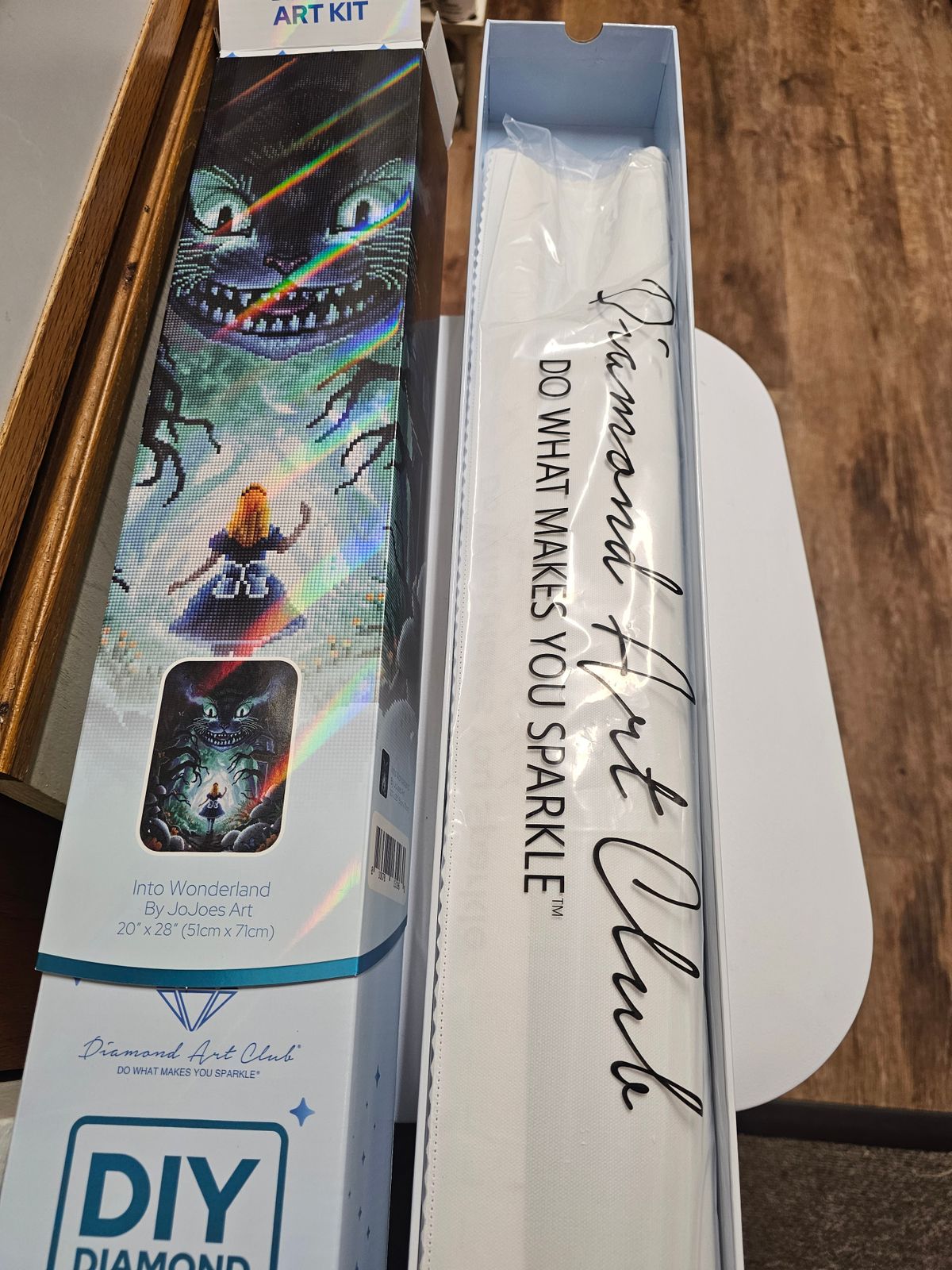 First square diamond kit I’ve done and really enjoyed it. Loved doing the green section around Alice and Cheshire’s eyes the most. Looks great above my bookcase