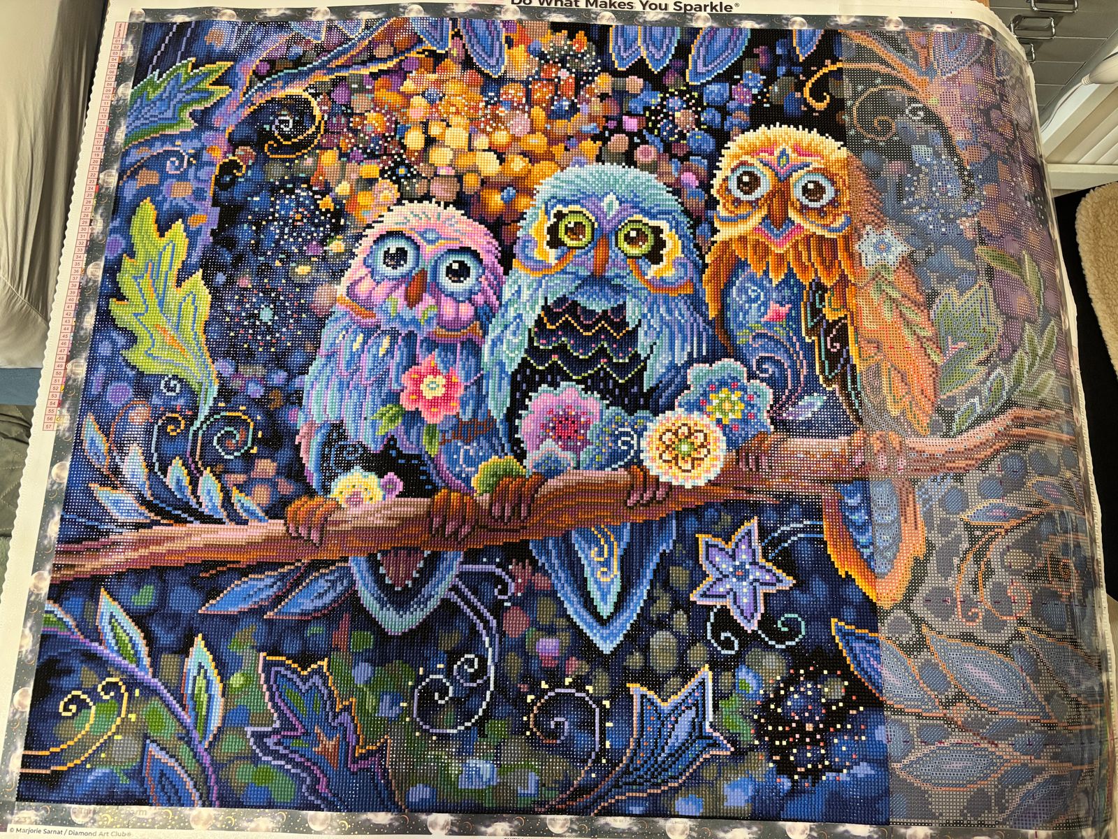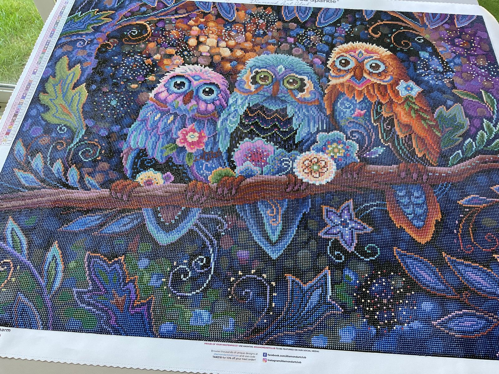 I purchased this for my mom, she loves owls. Unfortunately she passed away and will not get to see this finished. I have 2 rows left as of now but I did put it aways for a while. This painting will always have a special place in my heart, I will finish her this month. Lot's of confetti but so so beautiful.
