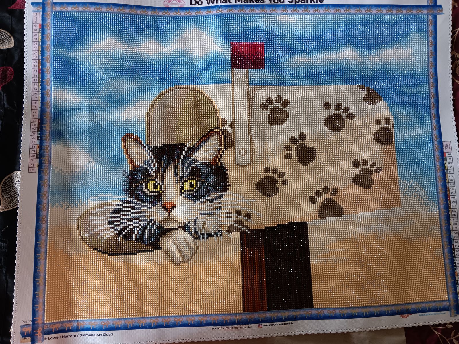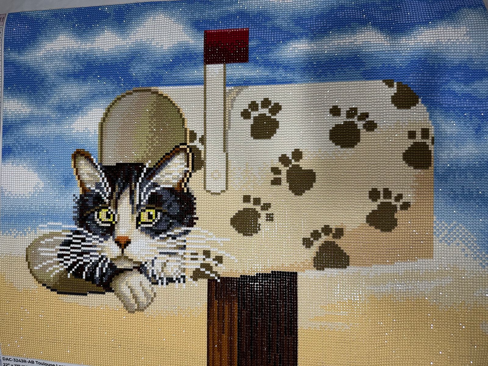 This was a perfect sized kit for in between larger projects. It also is the first kit that I have worked on with as much straight-up color blocking, so it really felt different from most kits that I do. It was a lot of fun to work on, and the end result looks great. The lazy kitty face is my favorite part, but I also really like the shades of blue in the sky.