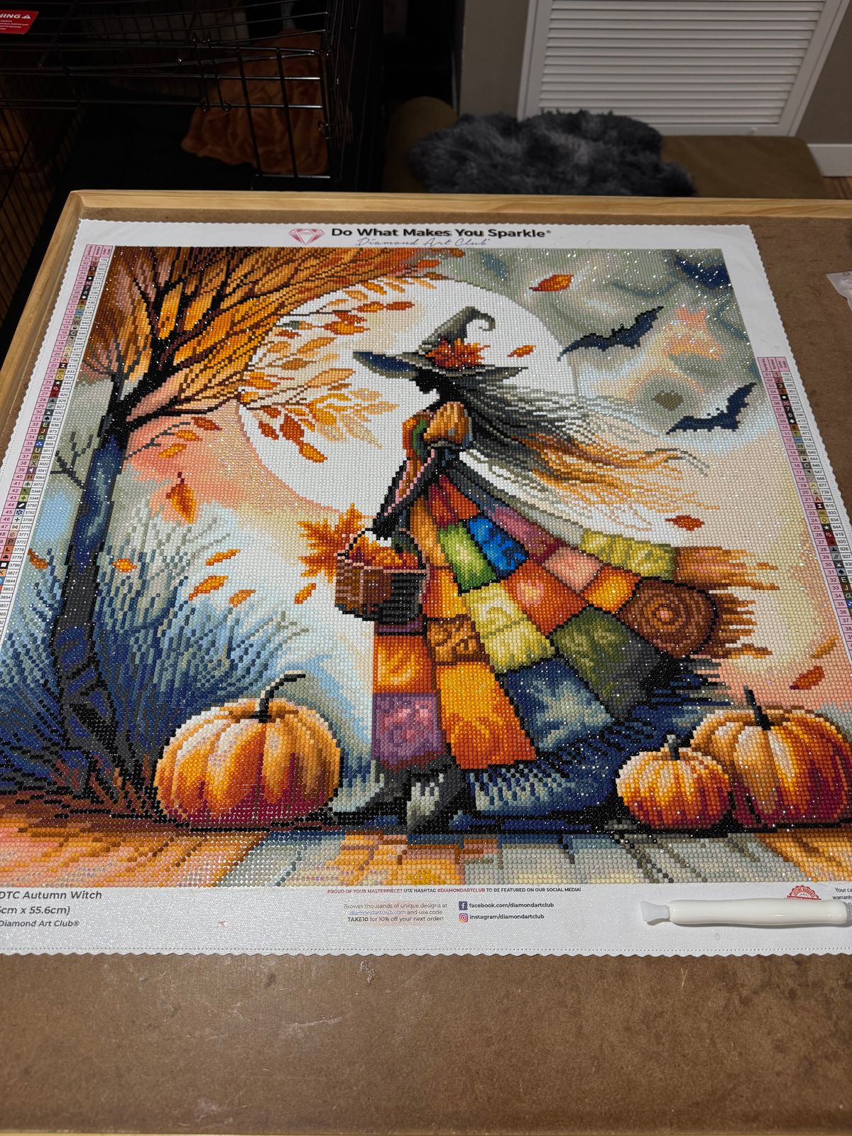 The "Autumn Witch" diamond art project is the perfect seasonal craft, beautifully capturing the cozy and magical spirit of fall. The kit quality is outstanding—the canvas adhesive is flawless, and the symbols are easy to distinguish, which is crucial for the rich color transitions in the foliage and the witch's multi-toned patchwork cloak. The dazzling array of warm orange, deep red, and earthy brown diamonds, all of exceptional sparkle, brings the scene to life, from the glowing moon to the rustic pumpkins and wind-swept leaves. Completing this piece was wonderfully meditative, and the finished artwork is incredibly striking and detailed, making it an essential addition for anyone who loves autumnal or fantasy-themed decor.