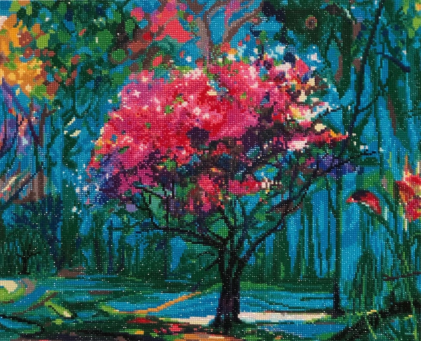 Be inspired by the boldness of this flourishing cherry tree and never be afraid of showing your hopeful optimism. As one of the first bloomers of spring, the cherry blossom is a harbinger of the profusion of growth that's soon to come. With its exquisite hues of pink, magenta, mauve and orchid, this tree will shimmer and shine with brilliance against the bright teal sky that's accented with glittering sparks from the sun.