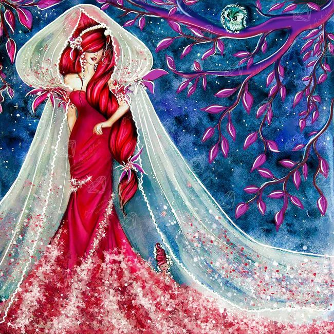Be the belle of the ball in ravishing red satin, with an up-down 'do that’ll knock their socks off! Give smile of gratitude to your little helpers as you admire their beaded flower-work and silken cocoon, sparkling in the moonlight.